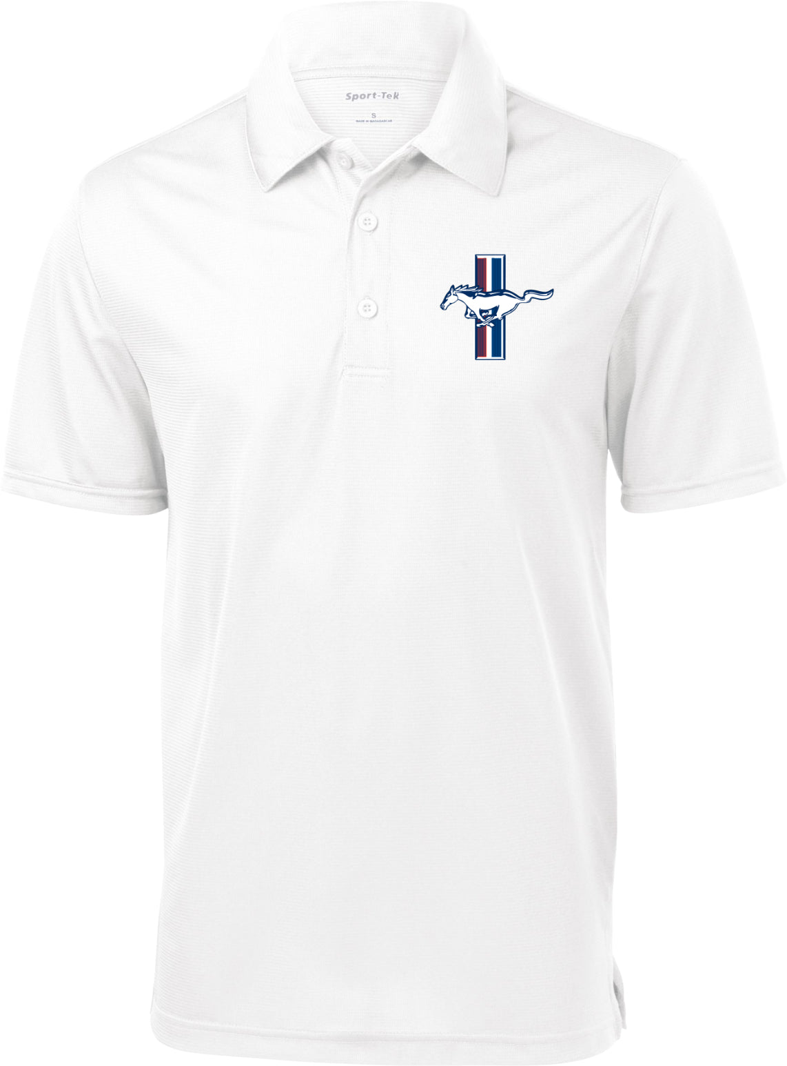 - A mens polo shirt featuring a Ford Mustang Tri Bar logo as a pocket print