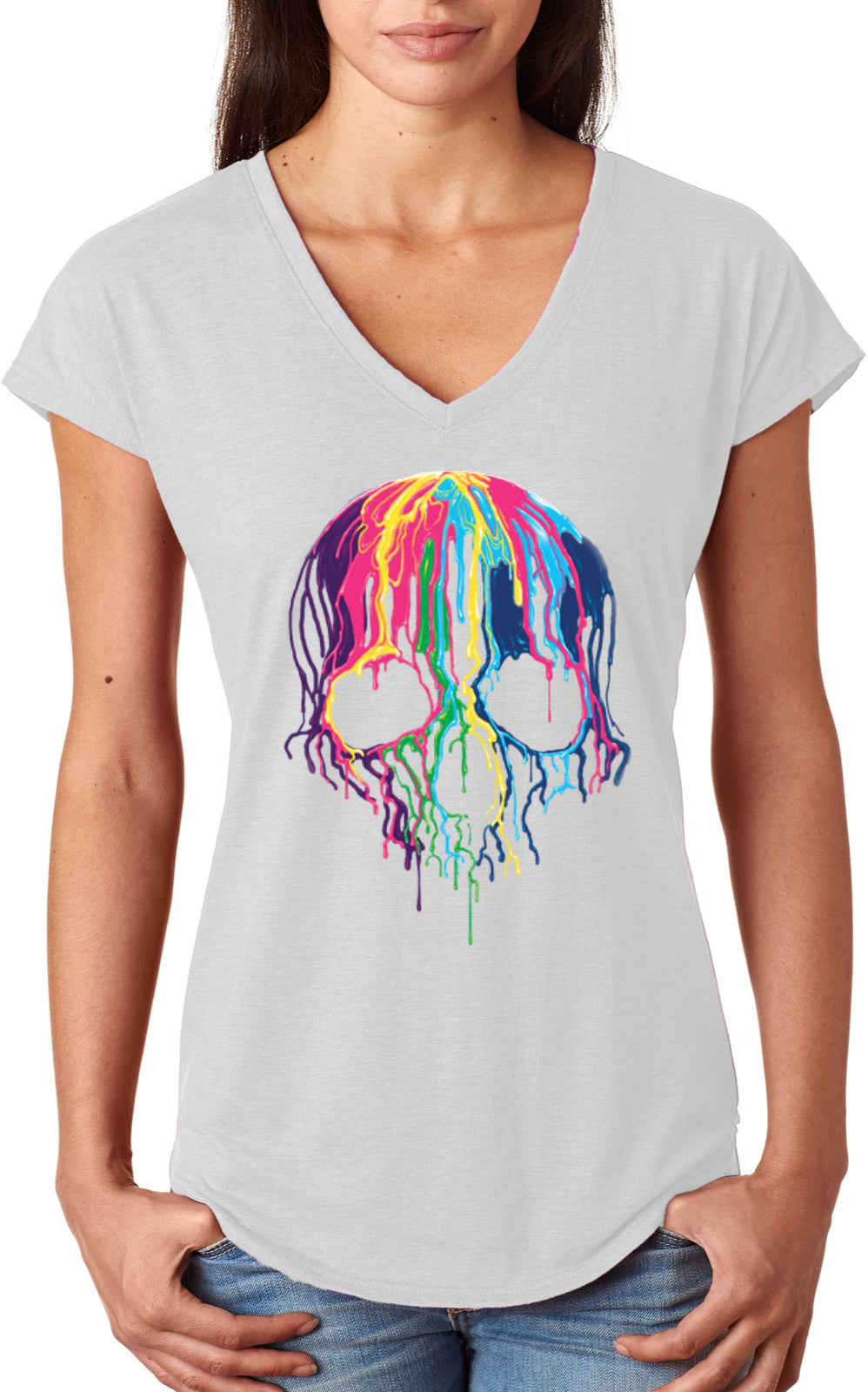 • A super soft ladies v-neck shirt featuring a cool colorful melting skull