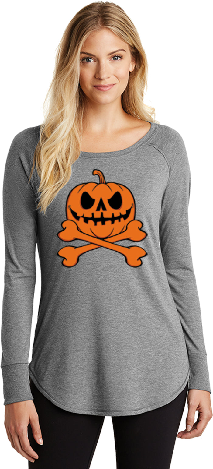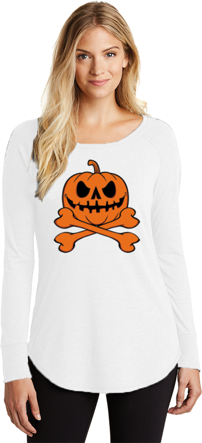 - A ladies Halloween long sleeve shirt featuring a spooky jack o lantern with crossbones underneath