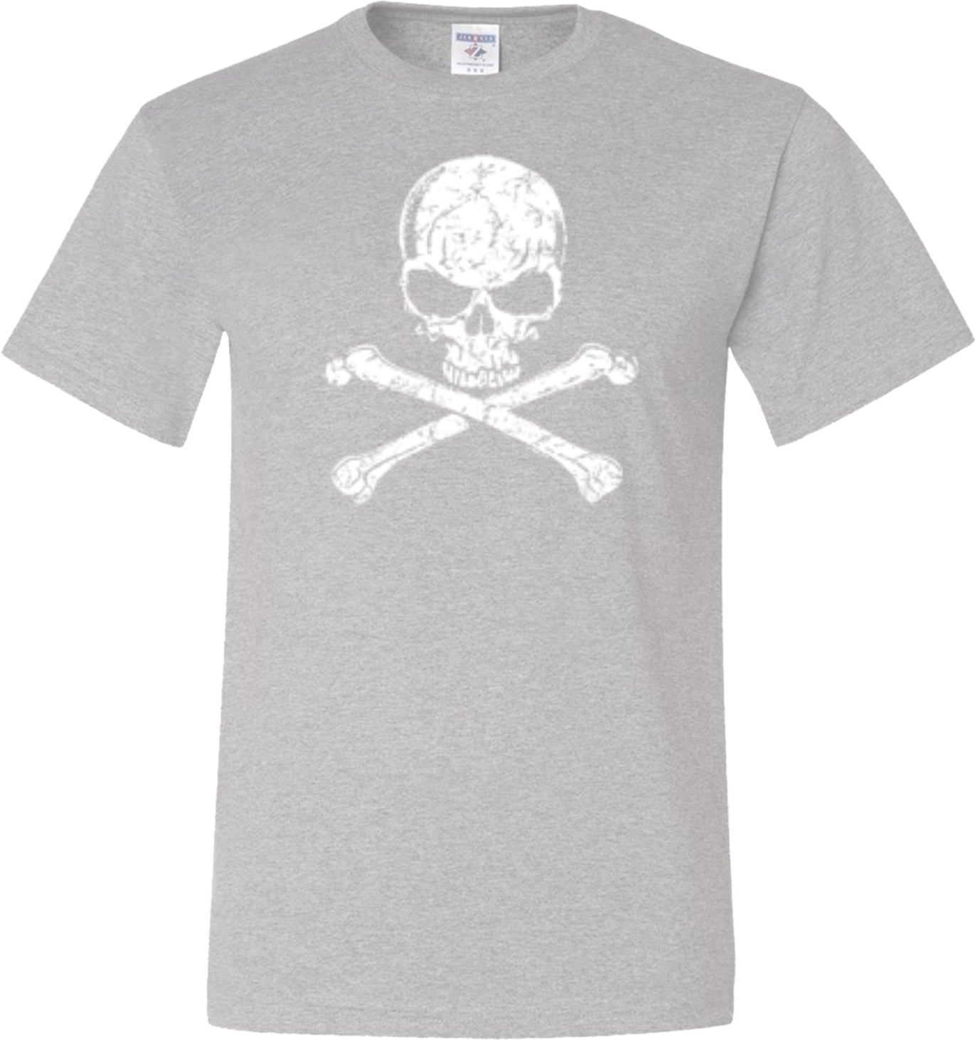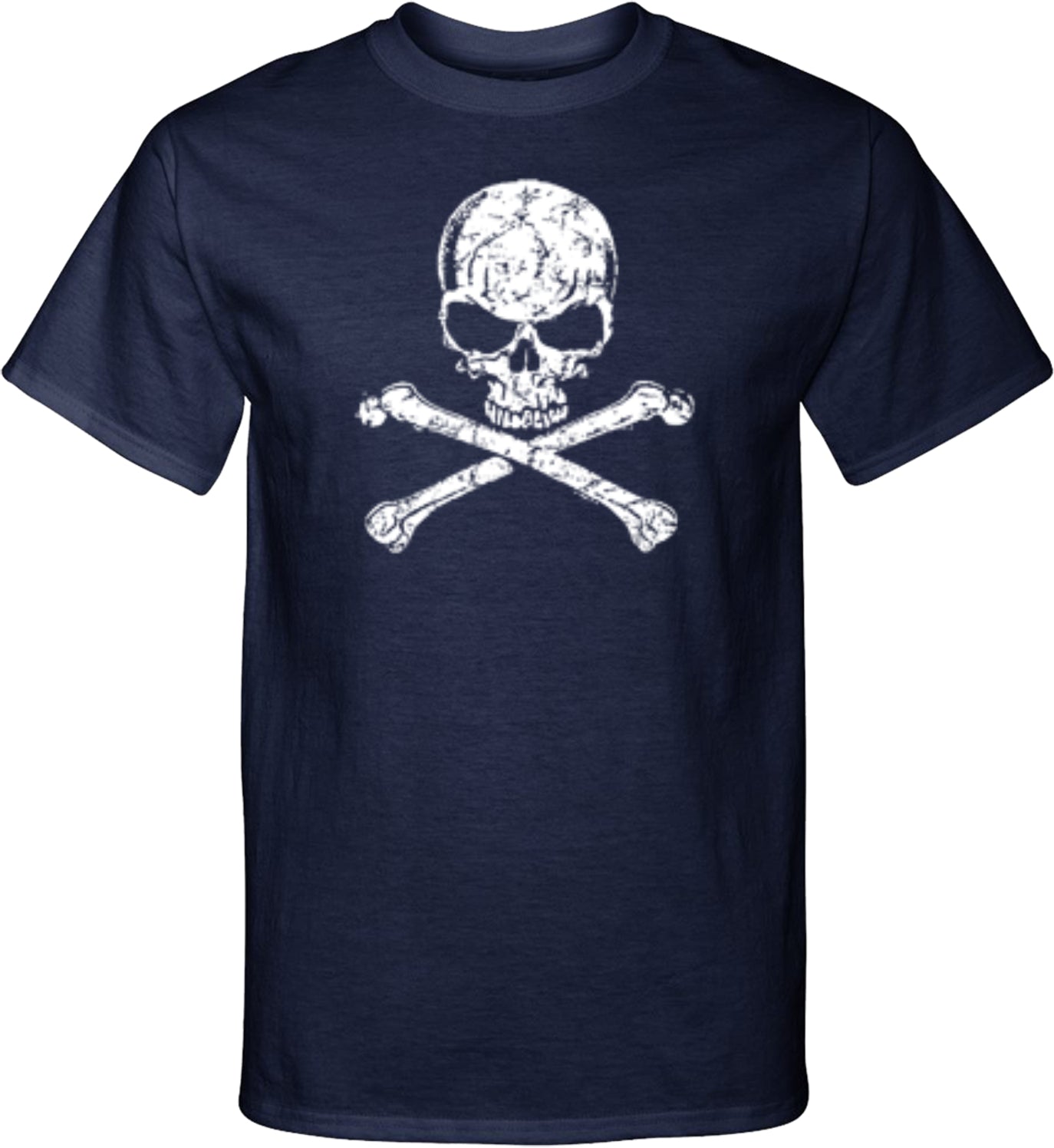 - A tall t-shirt featuring the skull and crossbones symbol also commonly known as the Jolly Roger flag