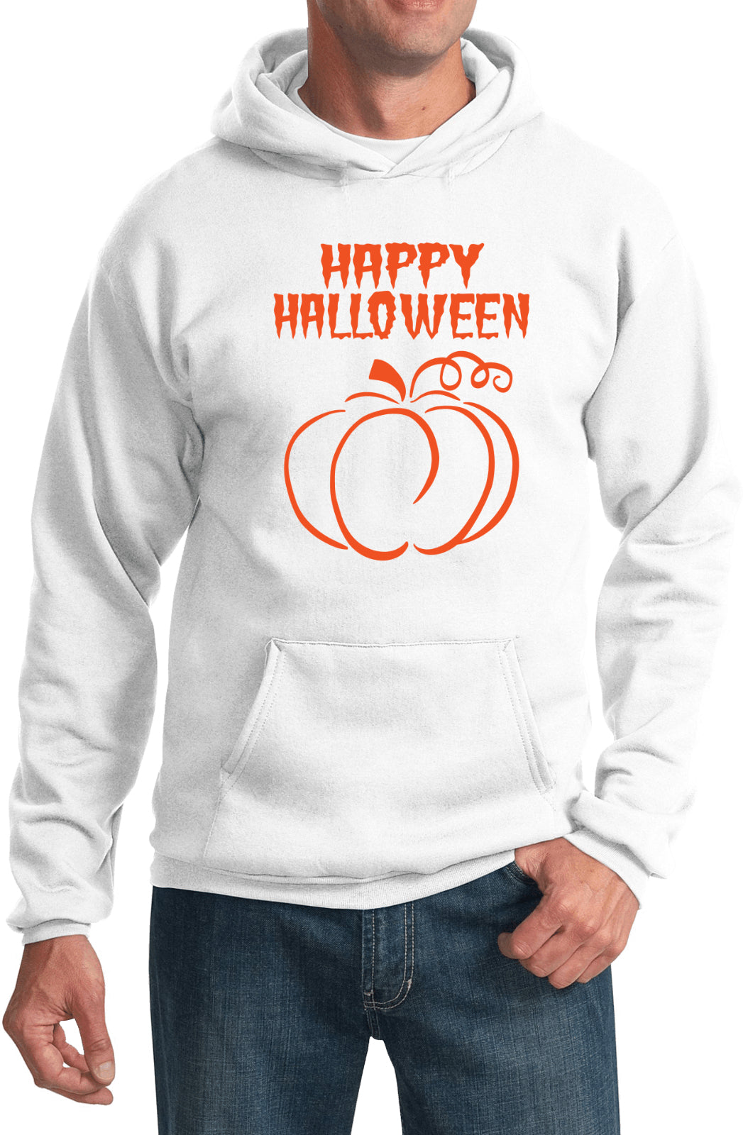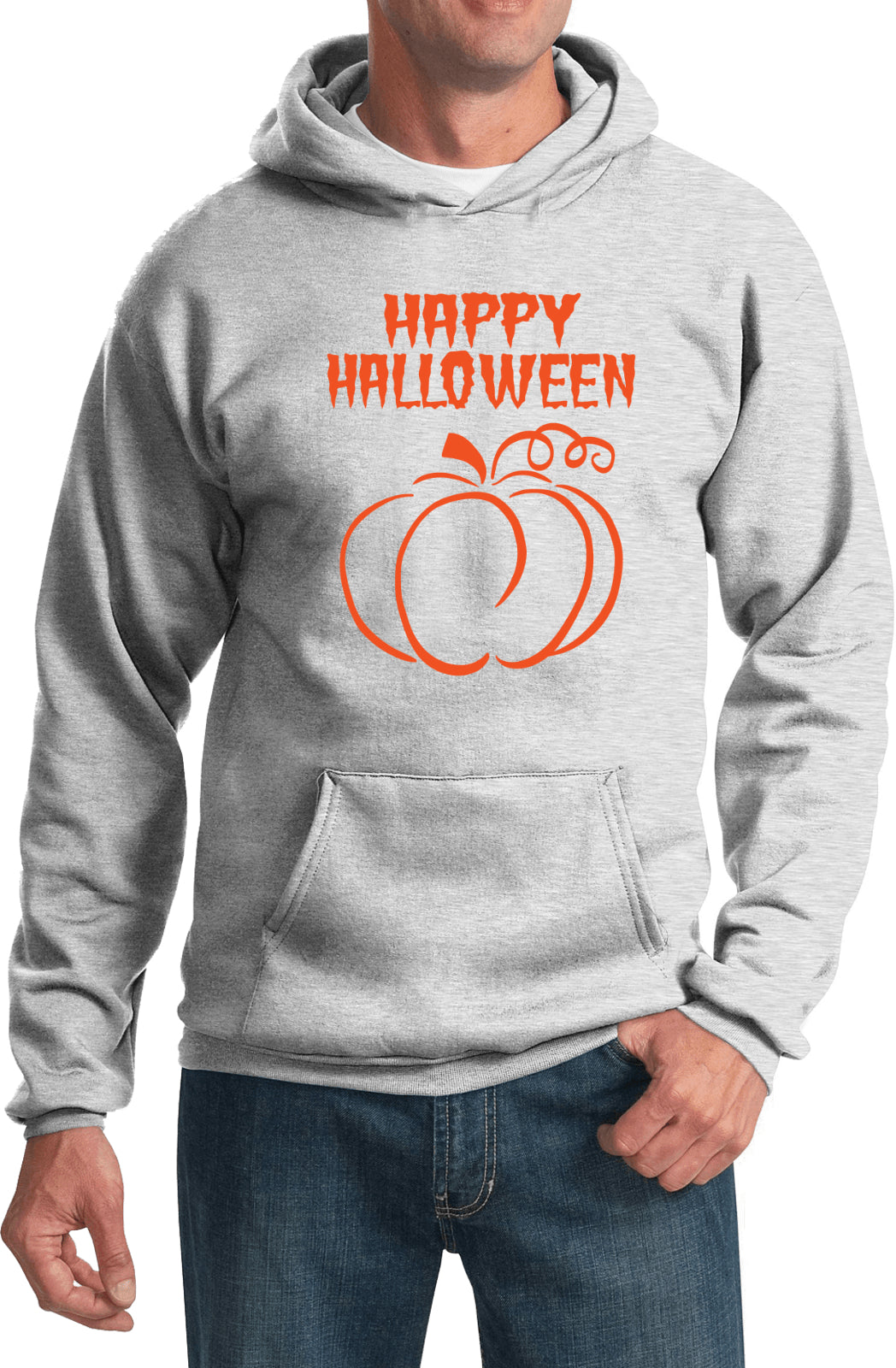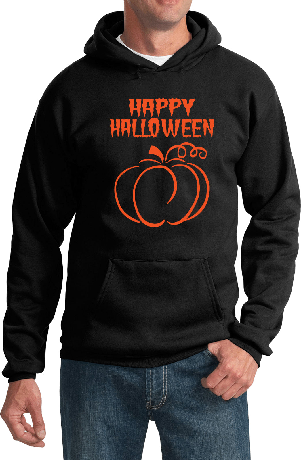 • A pullover hoodie that reads Happy Halloween with a sketched pumpkin underneath