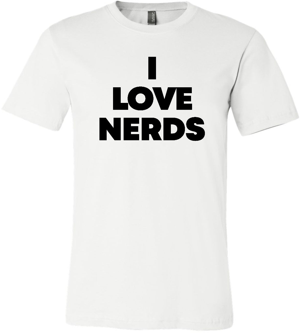 A funny premium t-shirt that fits both men and women with its traditional silhouette. Made from comfortable soft 100% ringspun cotton. The t-shirt reads I Love Nerds. This shirt is perfect for everyday casual wear, weekends, weekend trips, getaways and vacations or just lounging around.