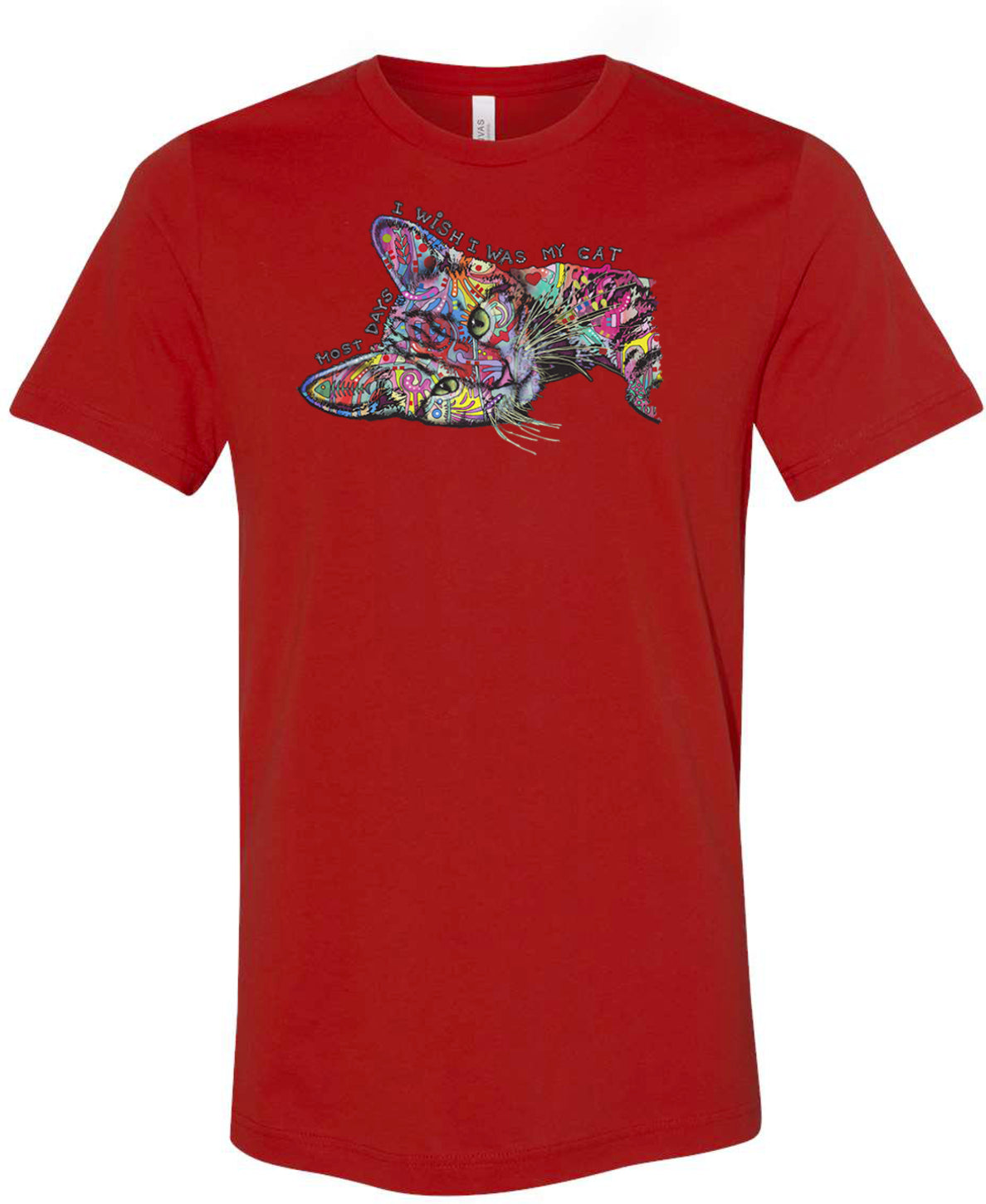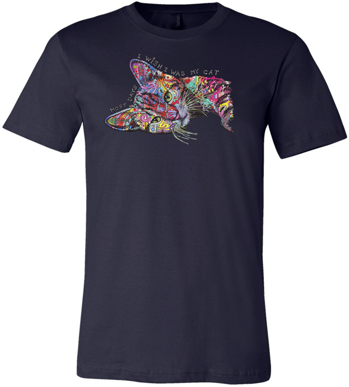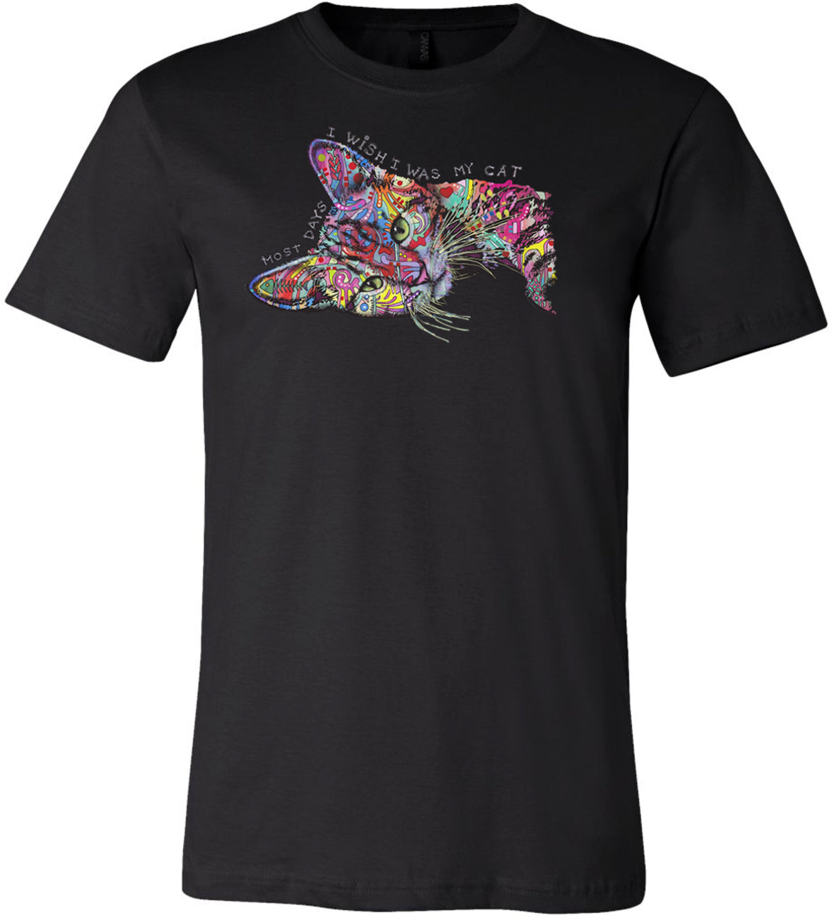 A cool cat premium t-shirt that fits both men and women with its traditional silhouette. Made from comfortable soft 100% ringspun cotton. The t-shirt features a cute colorful sleepy cat with the saying Most Days I Wish I Was My Cat. This shirt makes the perfect gift for cat moms, cat dads and cat lovers.