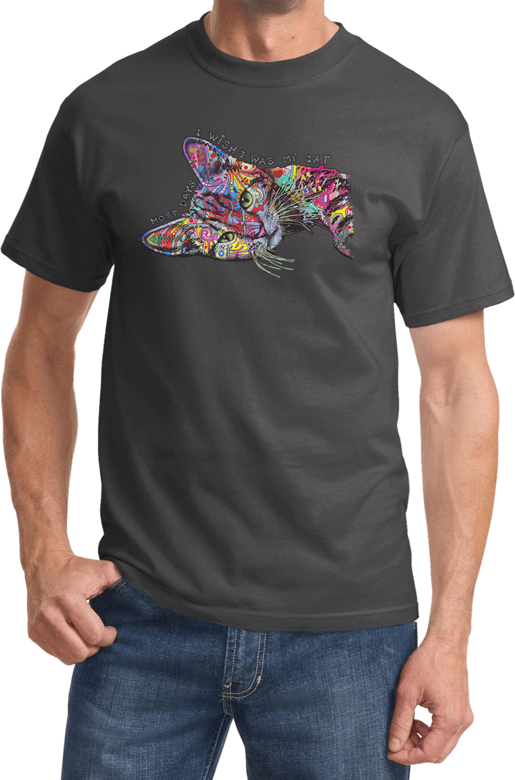 A cool cat shirt that fits both men and women with its traditional silhouette. Made from comfortable 100% cotton. The t-shirt features a cute colorful sleepy cat with the saying Most Days I Wish I Was My Cat. This shirt makes the perfect gift for cat moms, cat dads and cat lovers.
