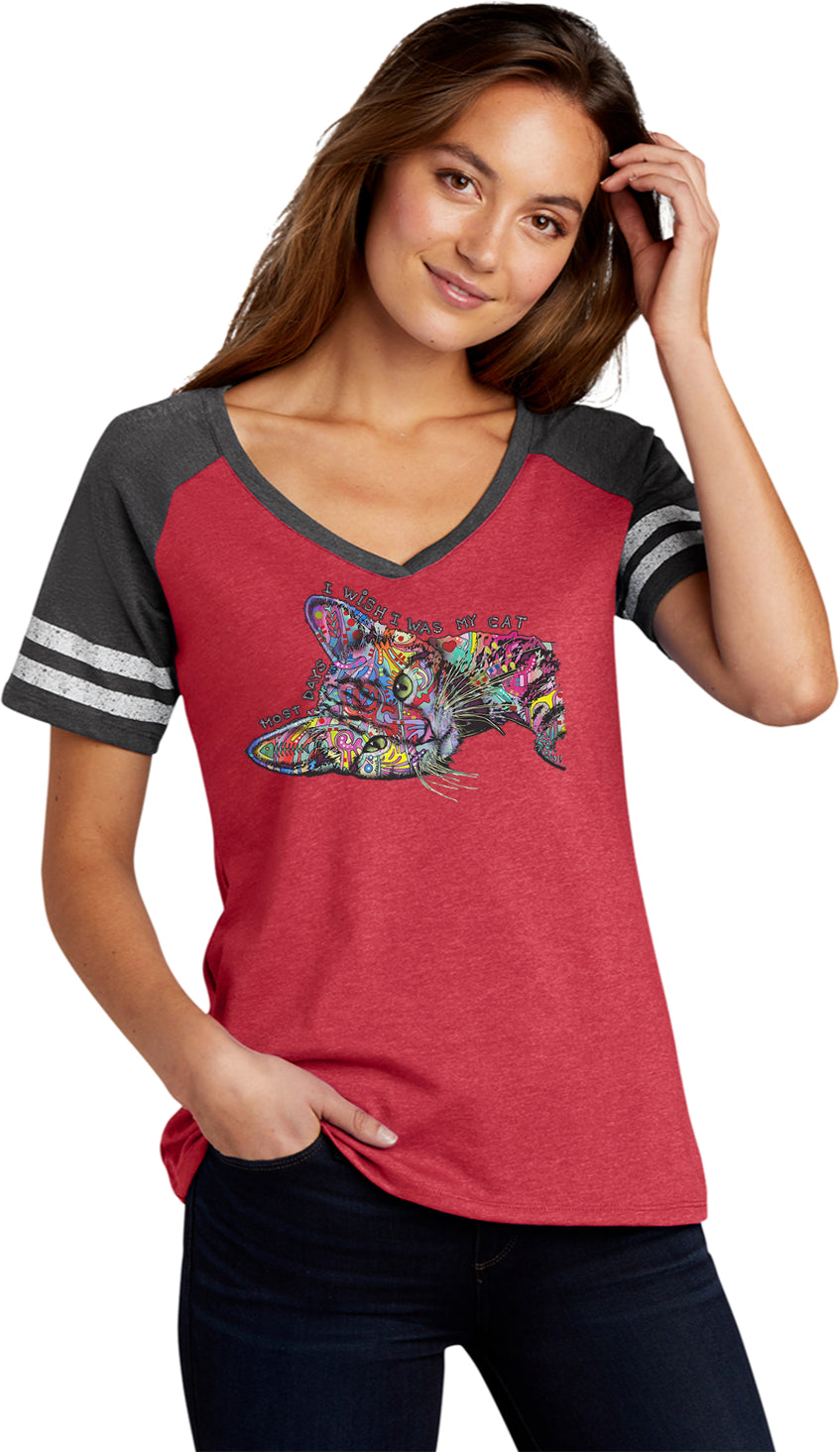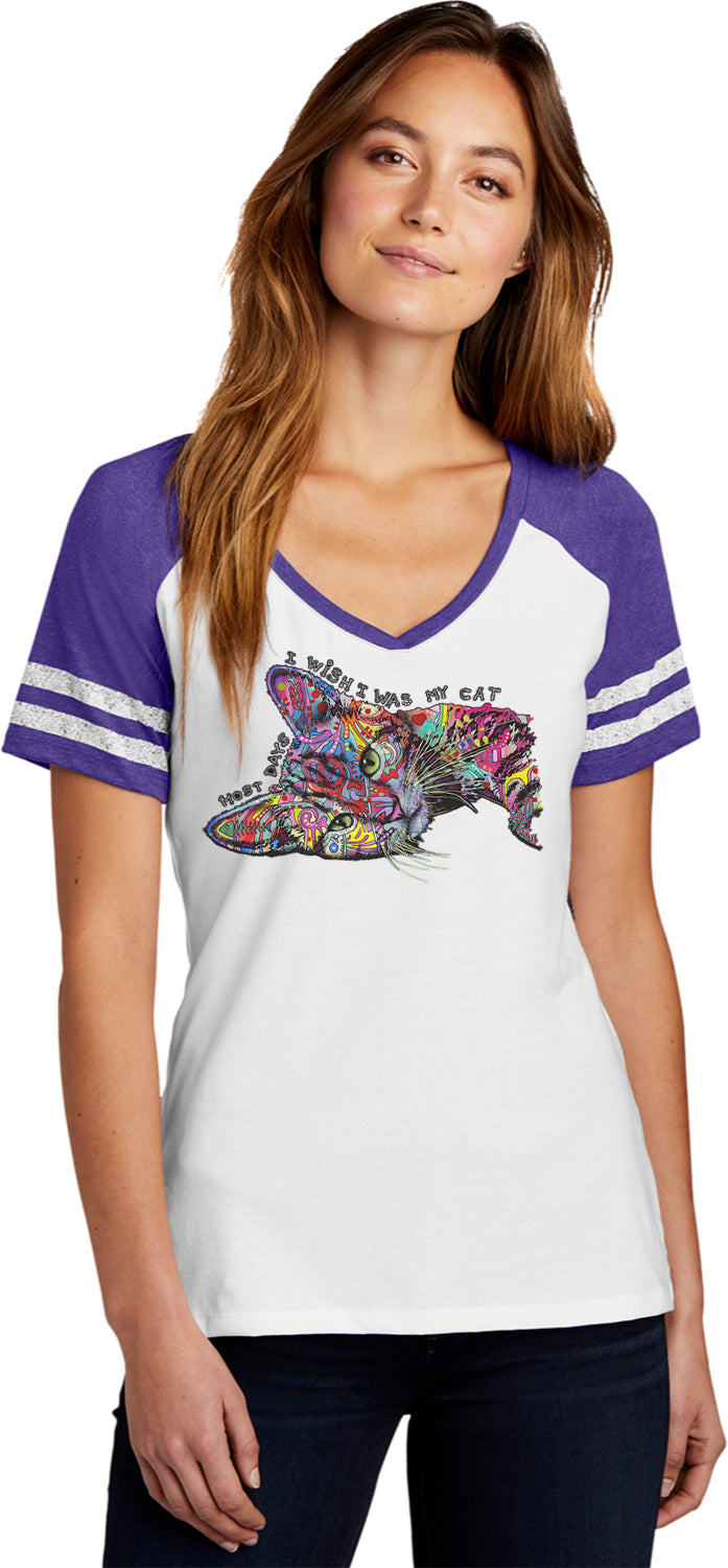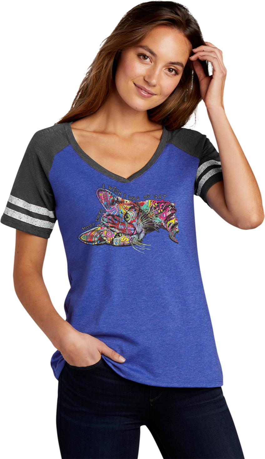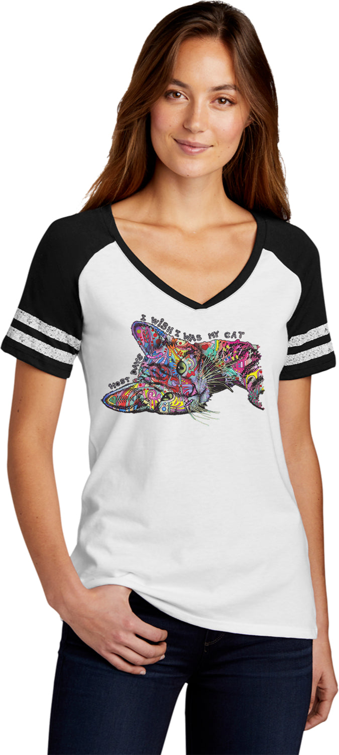 A cool cat ladies v-neck shirt with distressed printed stripes at the sleeves. Made from a soft and comfortable blend of cotton/polyester. The t-shirt features a cute colorful sleepy cat with the saying Most Days I Wish I Was My Cat. This v-neck shirt makes the perfect gift for cat moms and cat lovers.