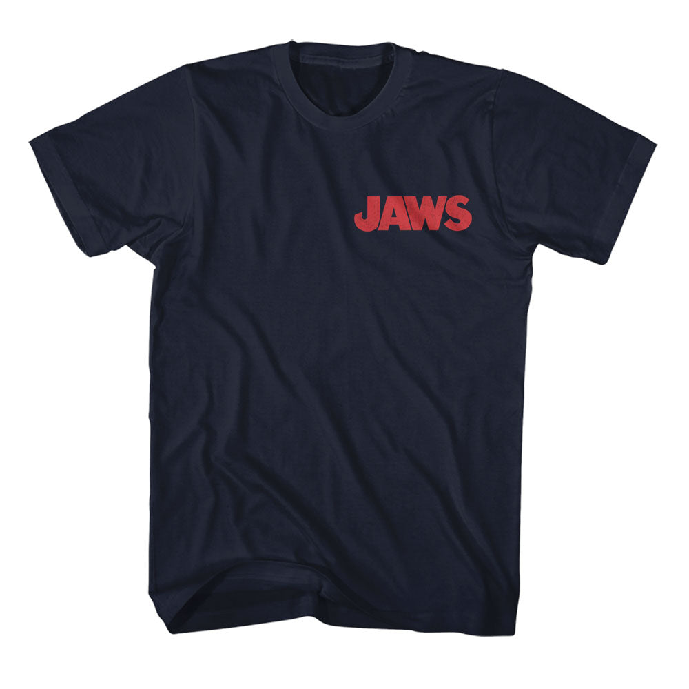 Jaws Shark Attack Boat Navy T-shirt Front and Back
