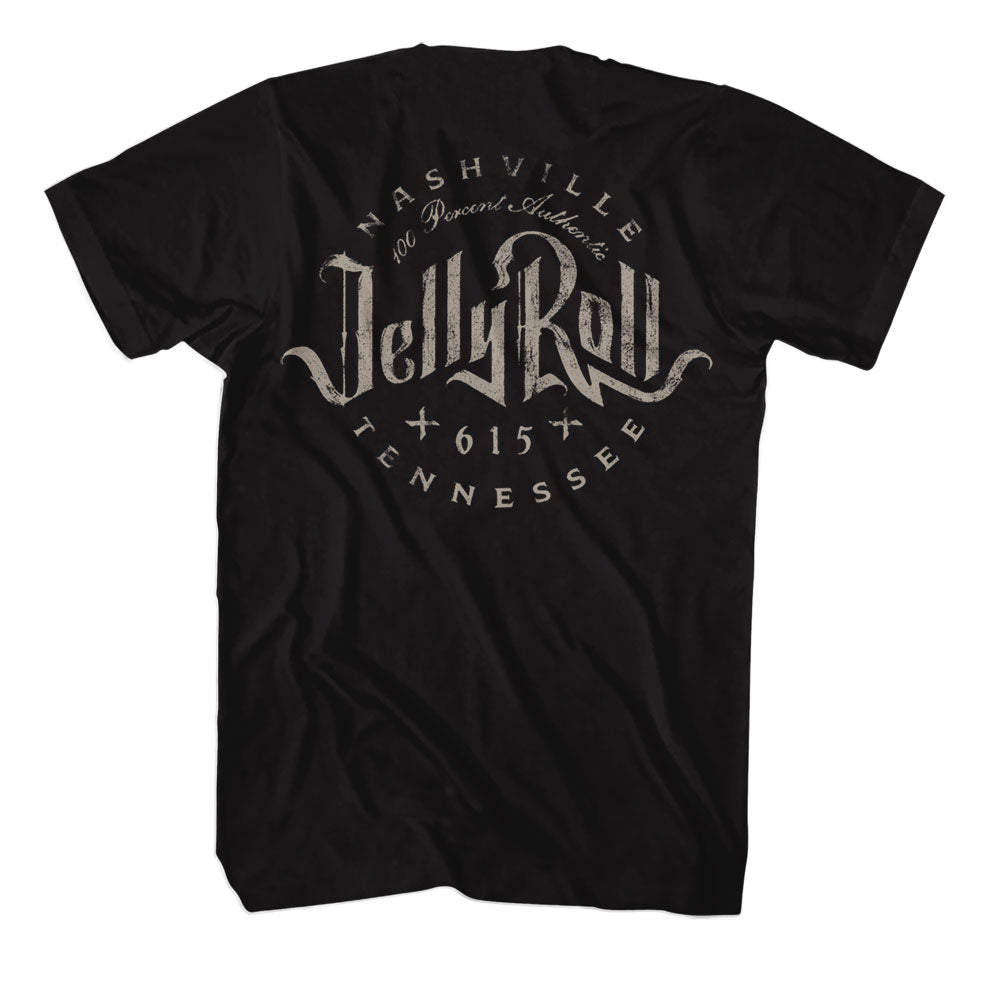 An officially licensed Jelly Roll shirt that fits both men and women with its traditional silhouette. Made from comfortable 100% ring spun cotton. The t-shirt features his name as a chest print on the front and Jelly Roll 615 Nashville Tennessee 100 Percent Authentic on the back. This t-shirt makes the perfect gift for fans and is great for comfortable every day wear.