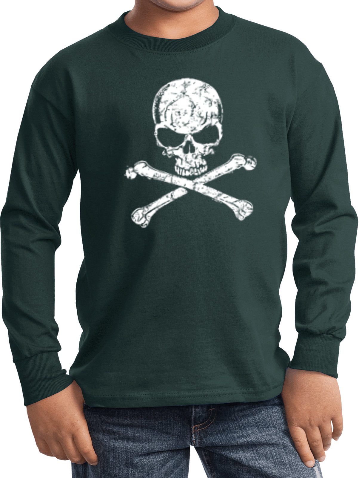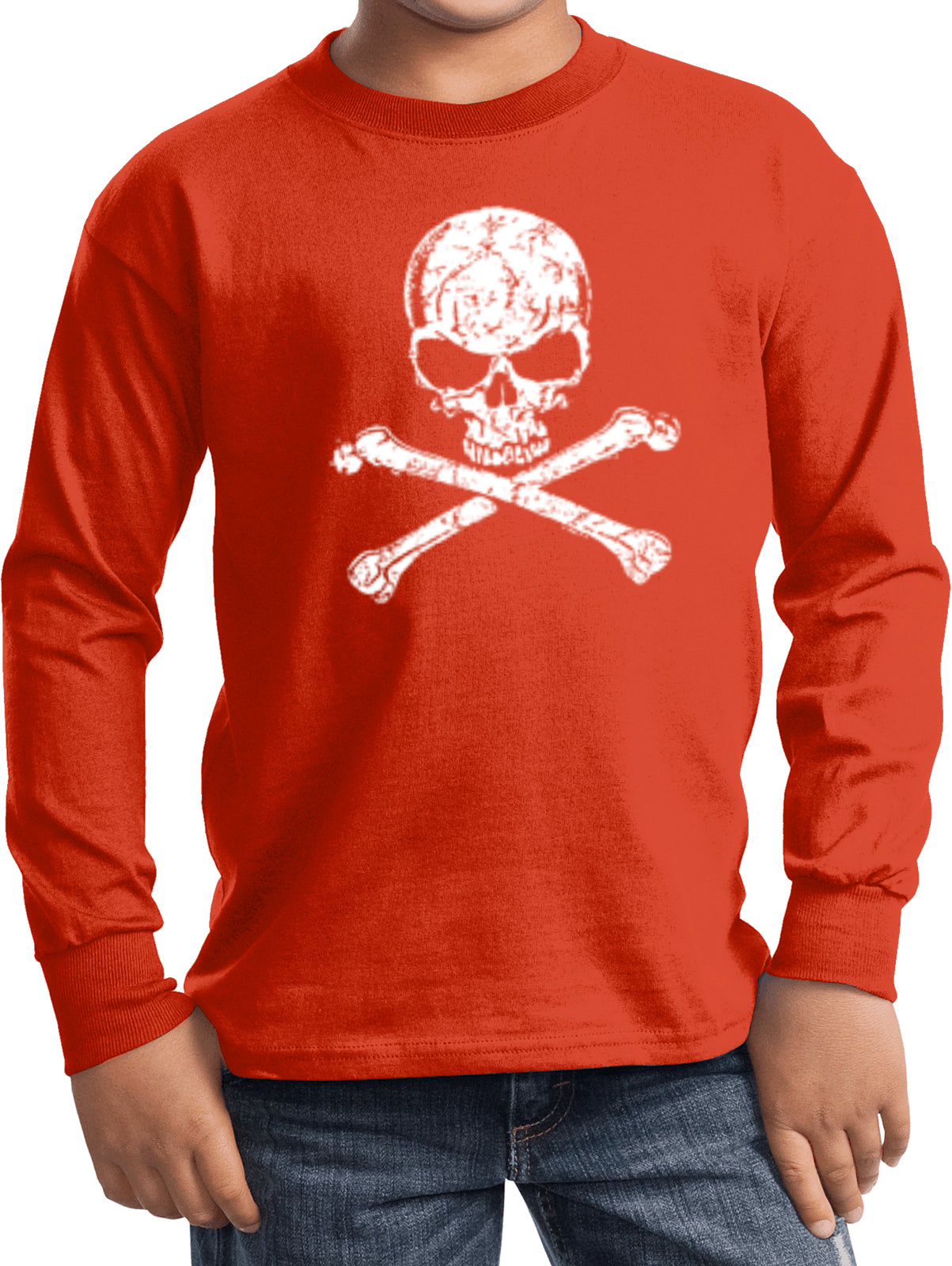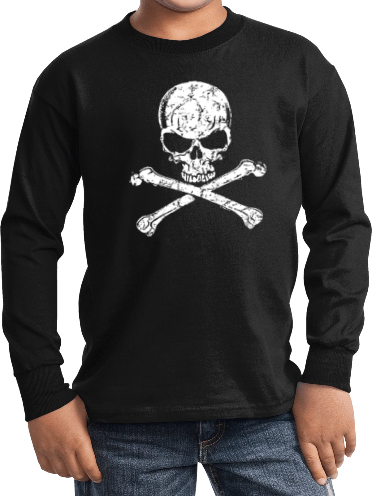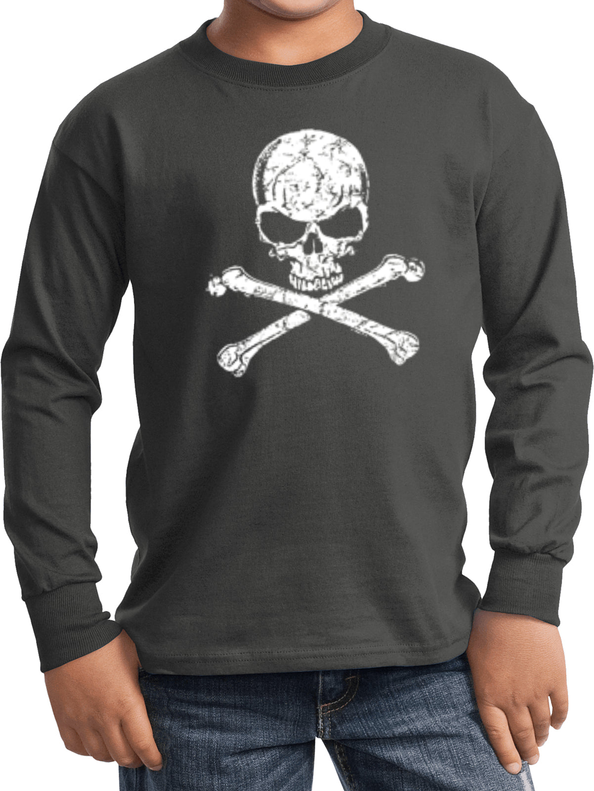 - A youth long sleeve shirt featuring the skull and crossbones symbol also commonly known as the Jolly Roger flag