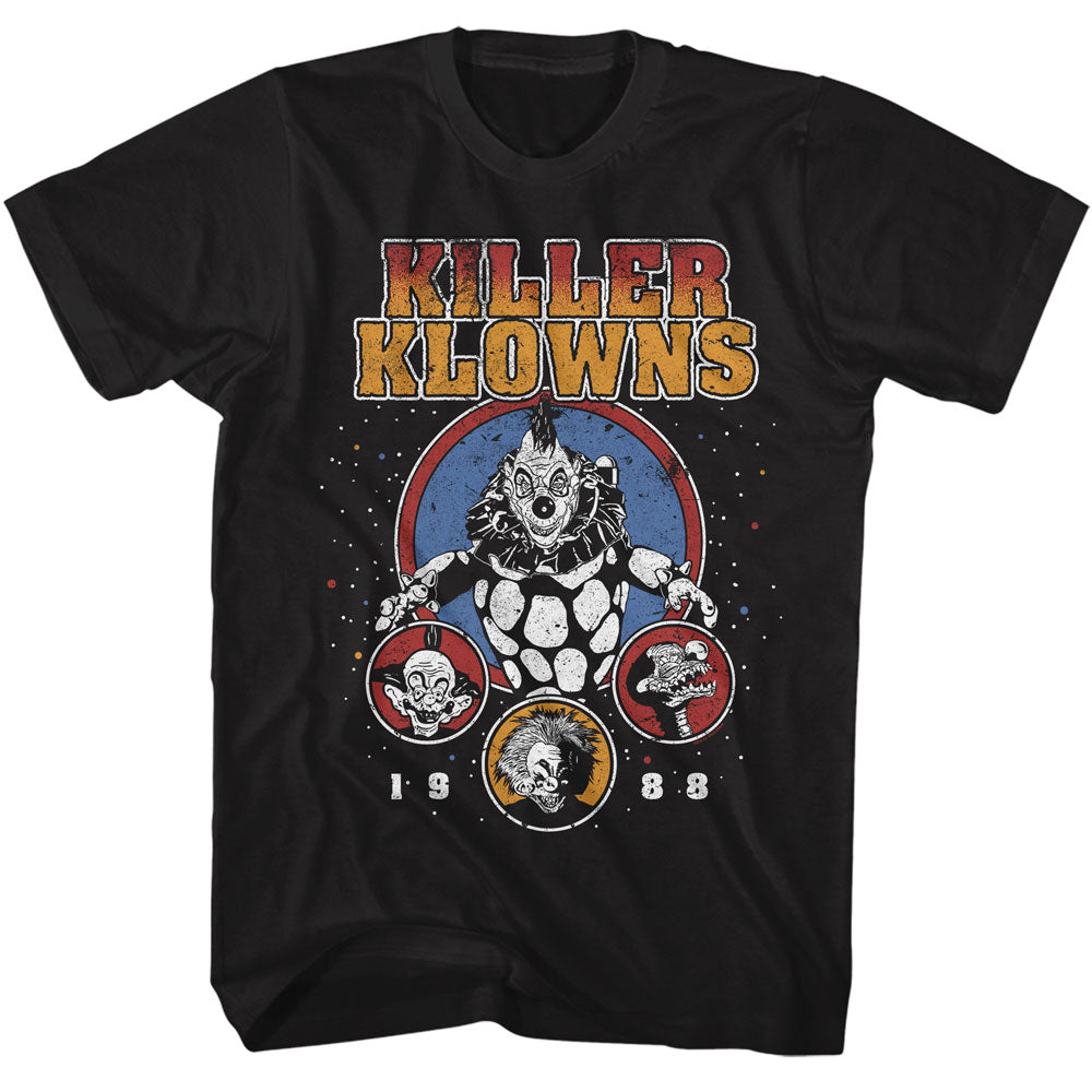 An officially licensed Killer Klowns shirt that fits both men and women with its traditional silhouette. Made from comfortable 100% ringspun cotton. The t-shirt features a 1988 Collage of alien clowns Shorty, Magori, Baby Killer Klown and Klownzilla. Killer Klowns from Outer Space is a classic sci fi horror movie that was released in 1988 based on aliens turned clowns who invade a small town on Earth in order to capture, kill, and harvest the human inhabitants to use as sustenance. This shirt makes the perfect gift for fans of the movie.