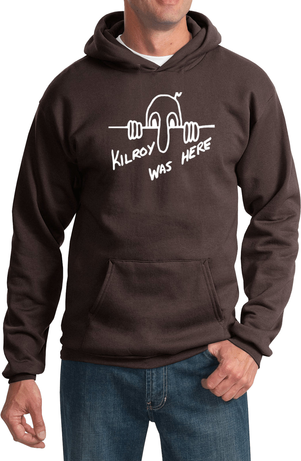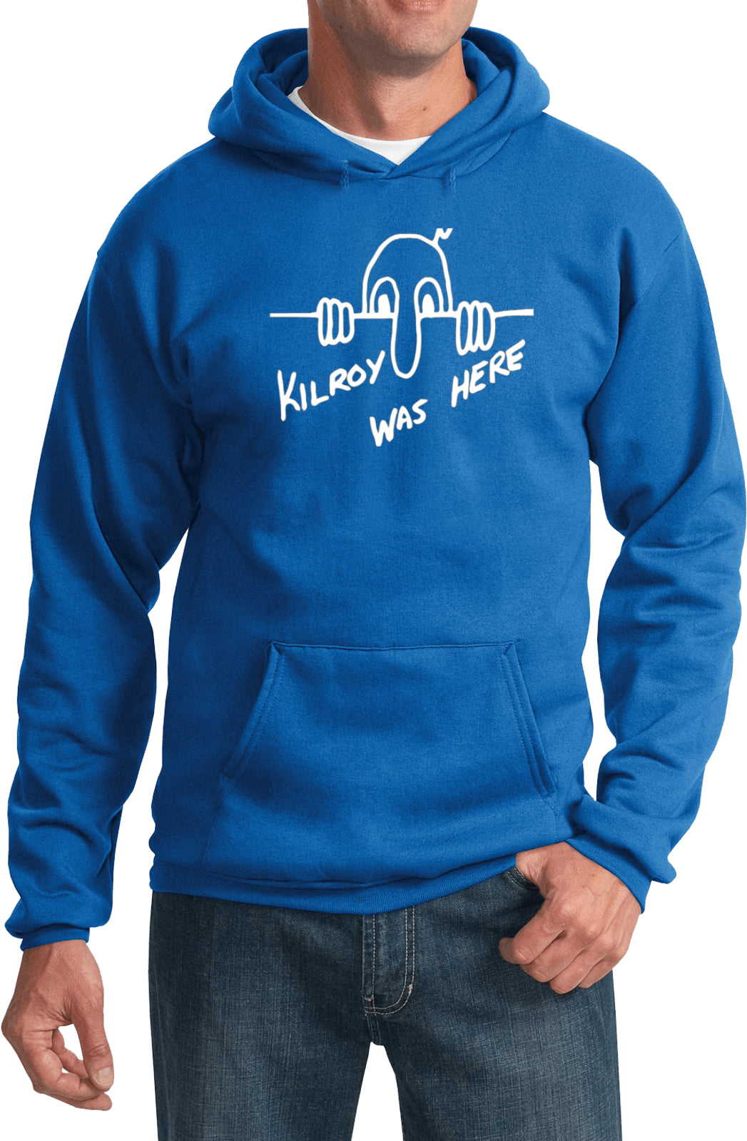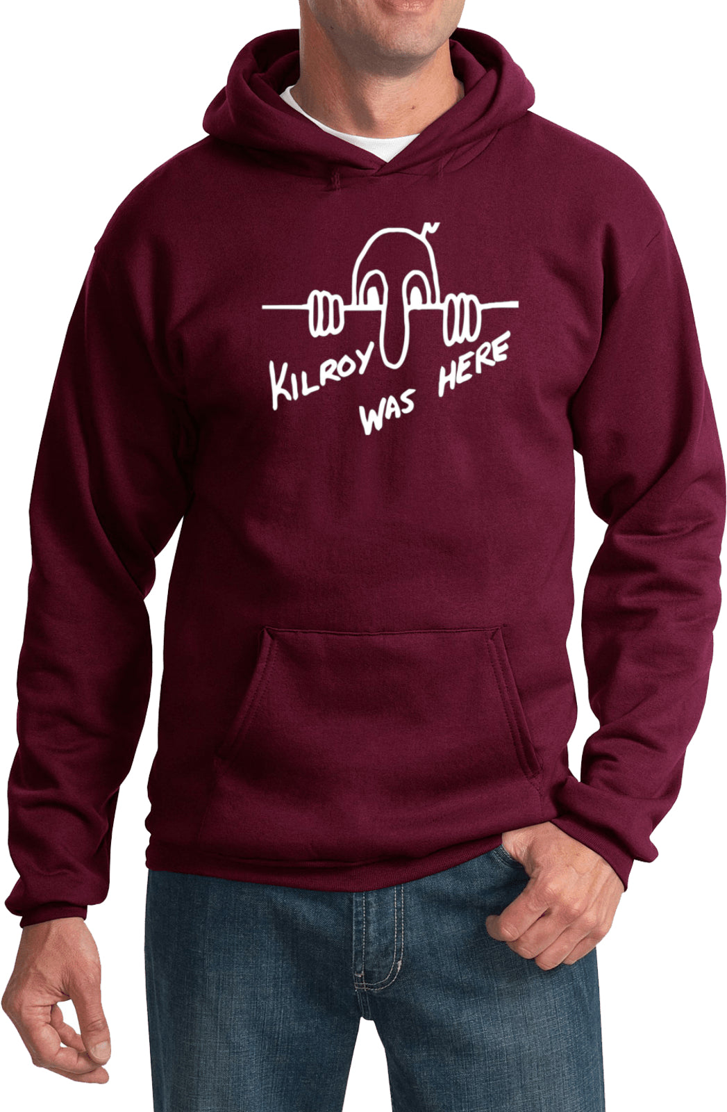- A pullover hoodie featuring the popular phrase, Kilroy was Here with an illustration of a man peeking over the top of a wall