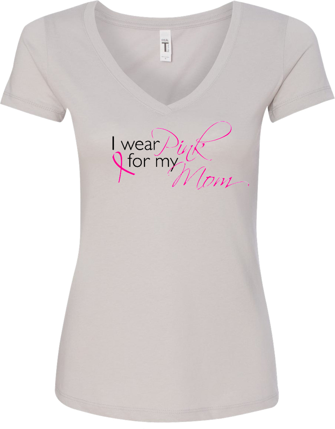 • A ladies breast cancer awareness v-neck shirt that reads I Wear Pink for my Mom