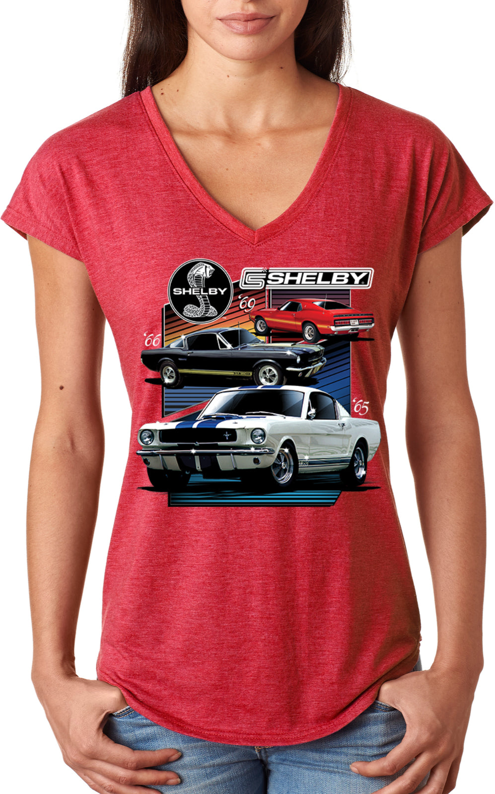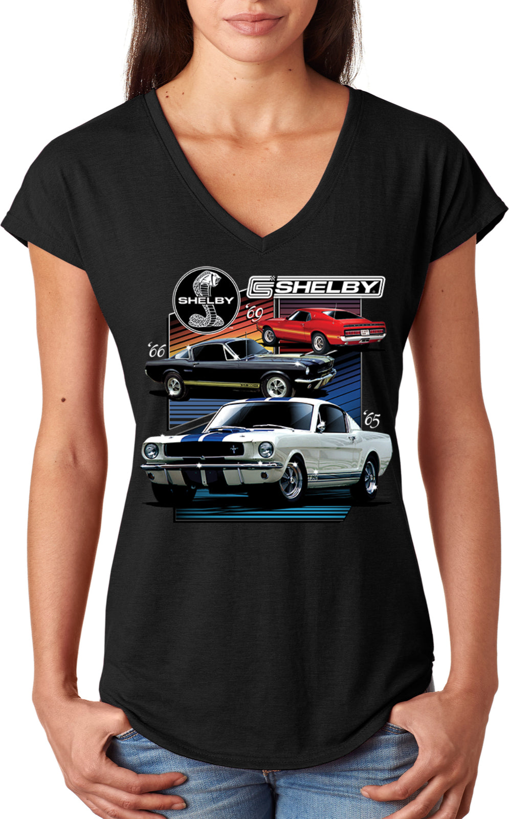 • A ladies Ford v-neck shirt featuring a 1965, 1966 and 1969 Mustang Shelby