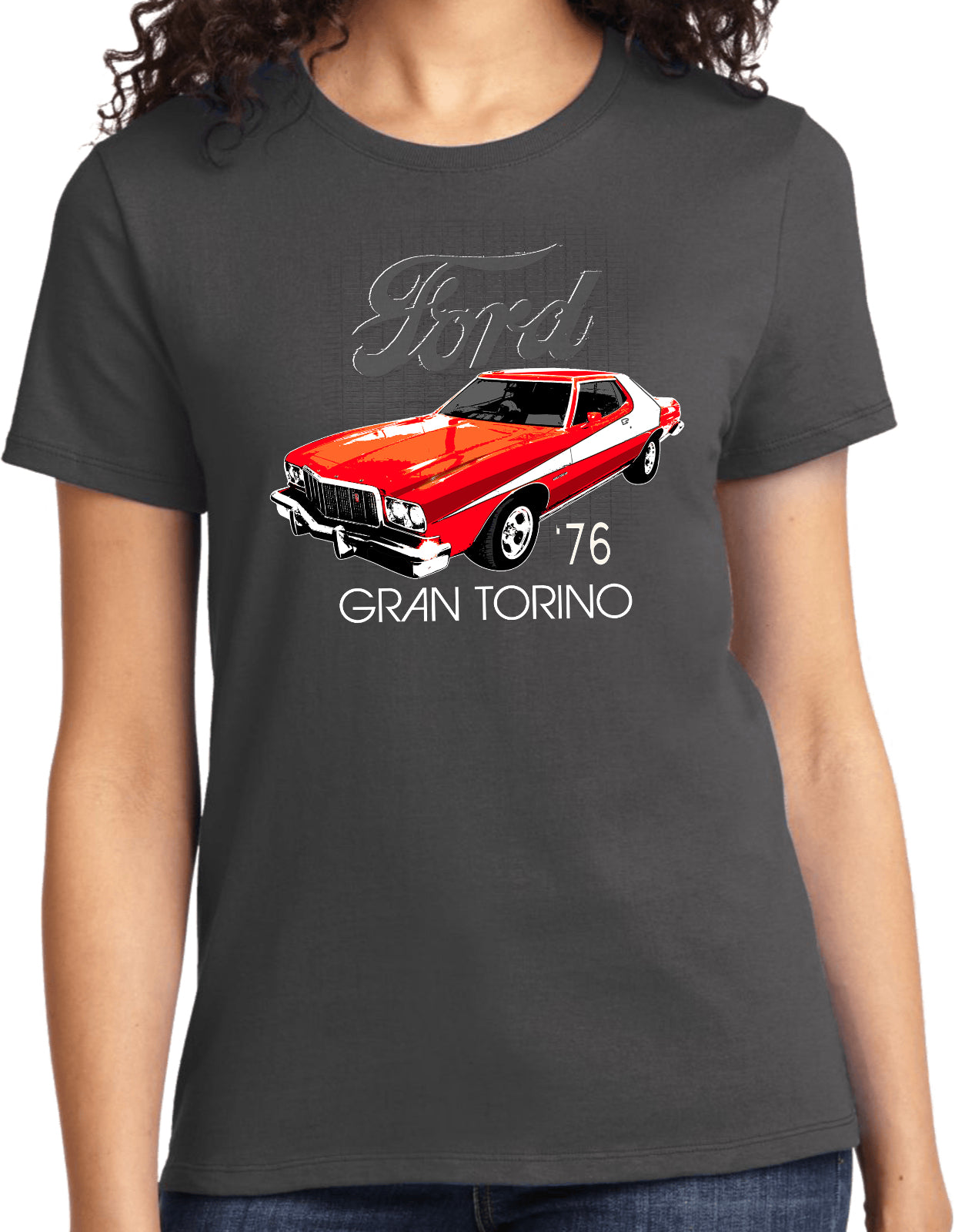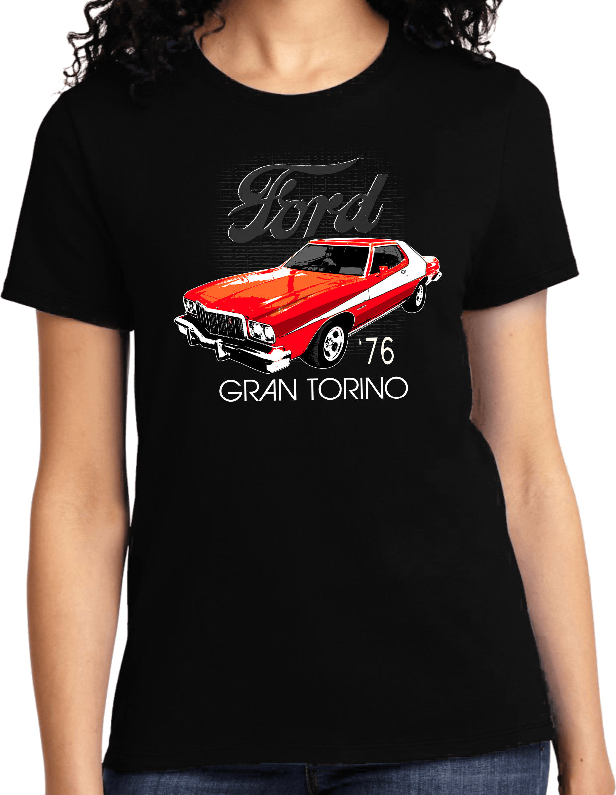 • A ladies t-shirt featuring a red 1976 Ford Gran Torino