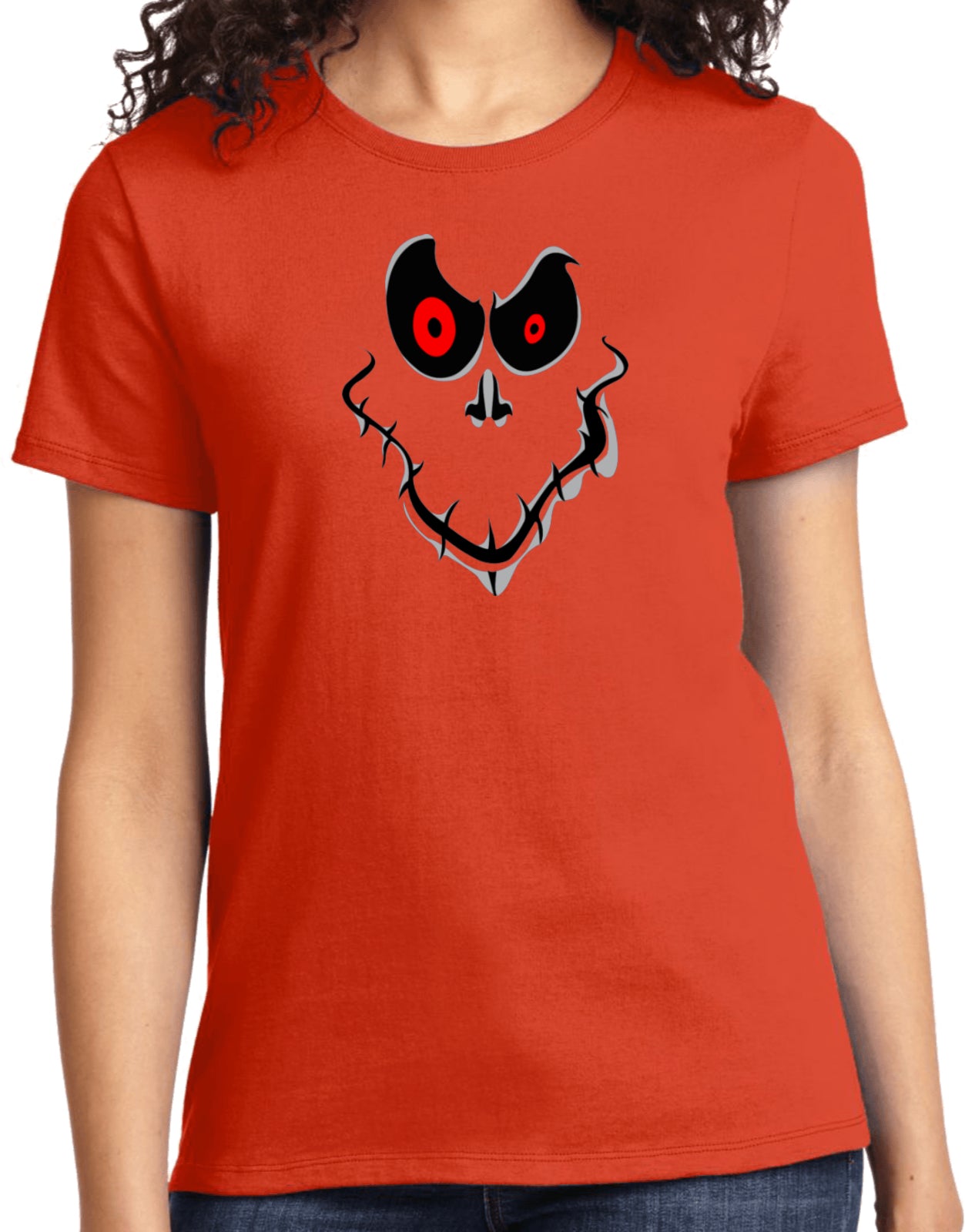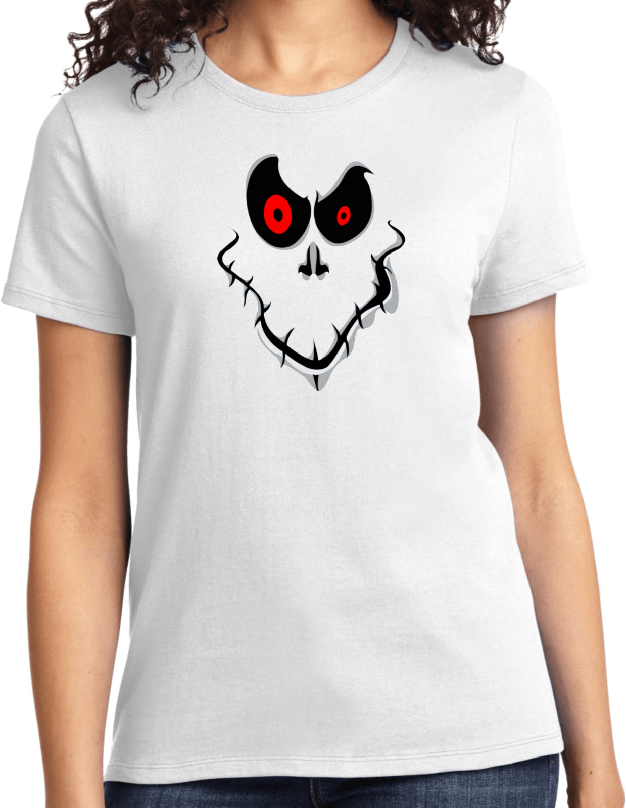 - A ladies halloween t-shirt featuring a ghost face