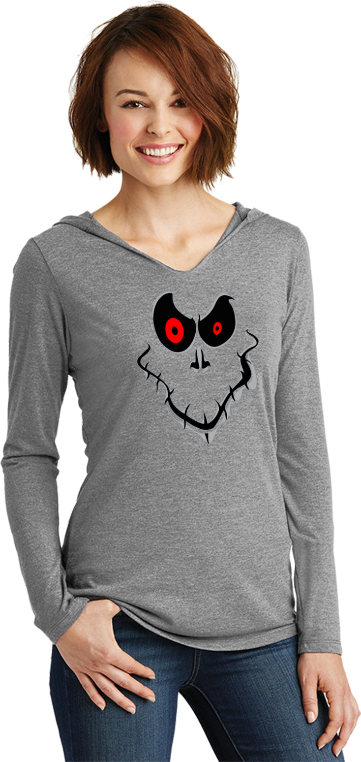 - A ladies halloween lightweight v-neck hoodie featuring a ghost face