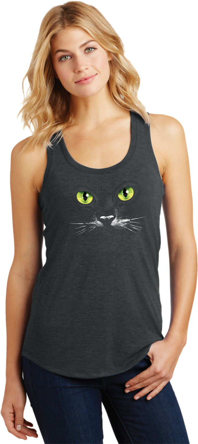 - A ladies racerback tank top featuring a green eyed black cat face
