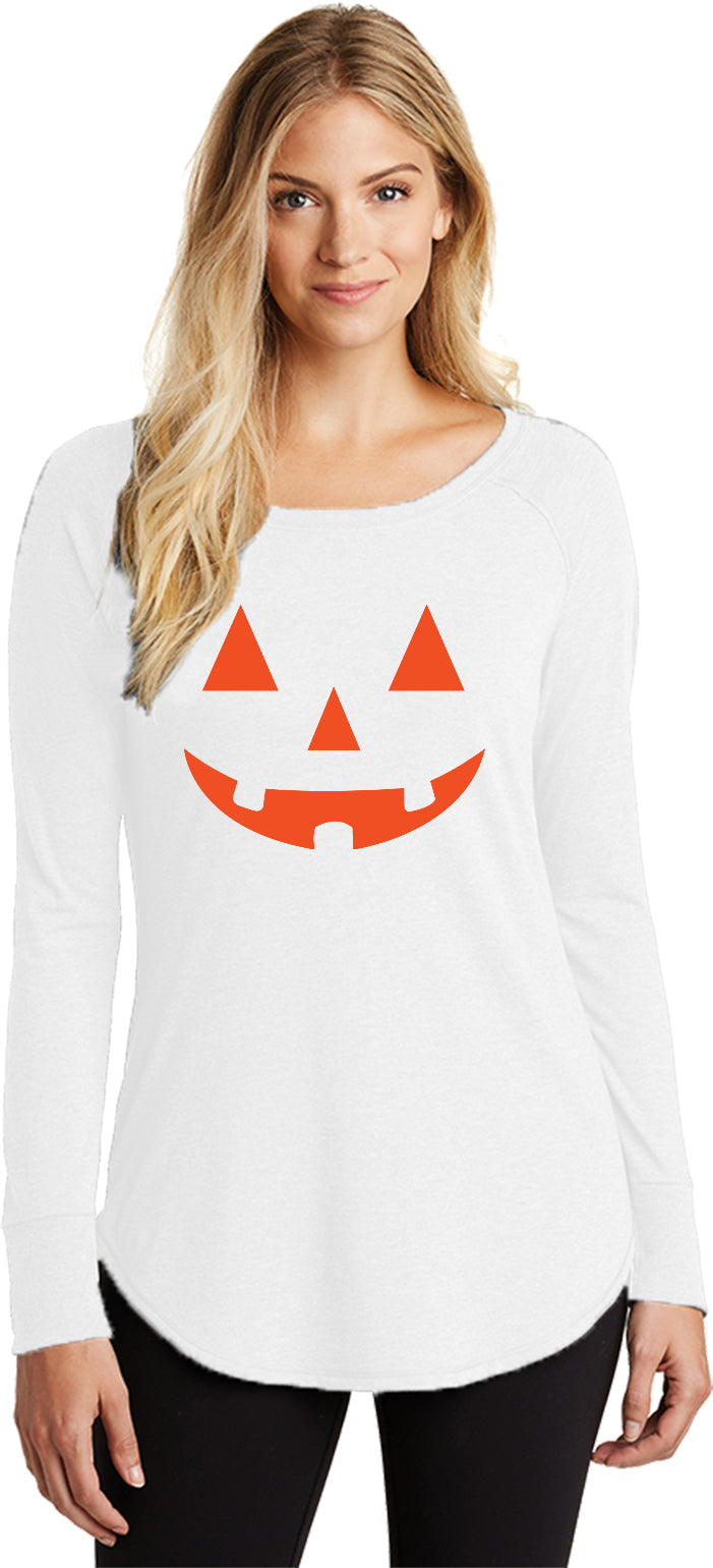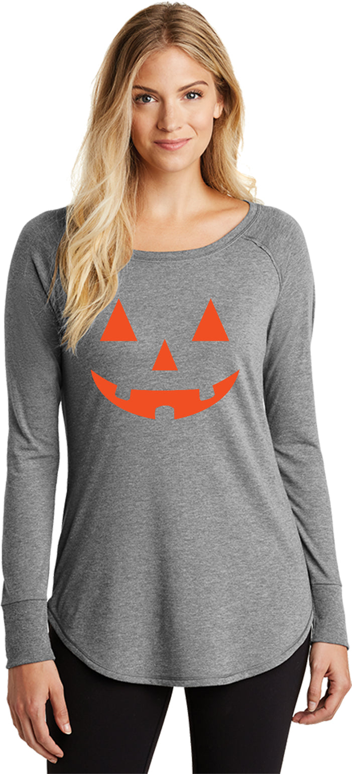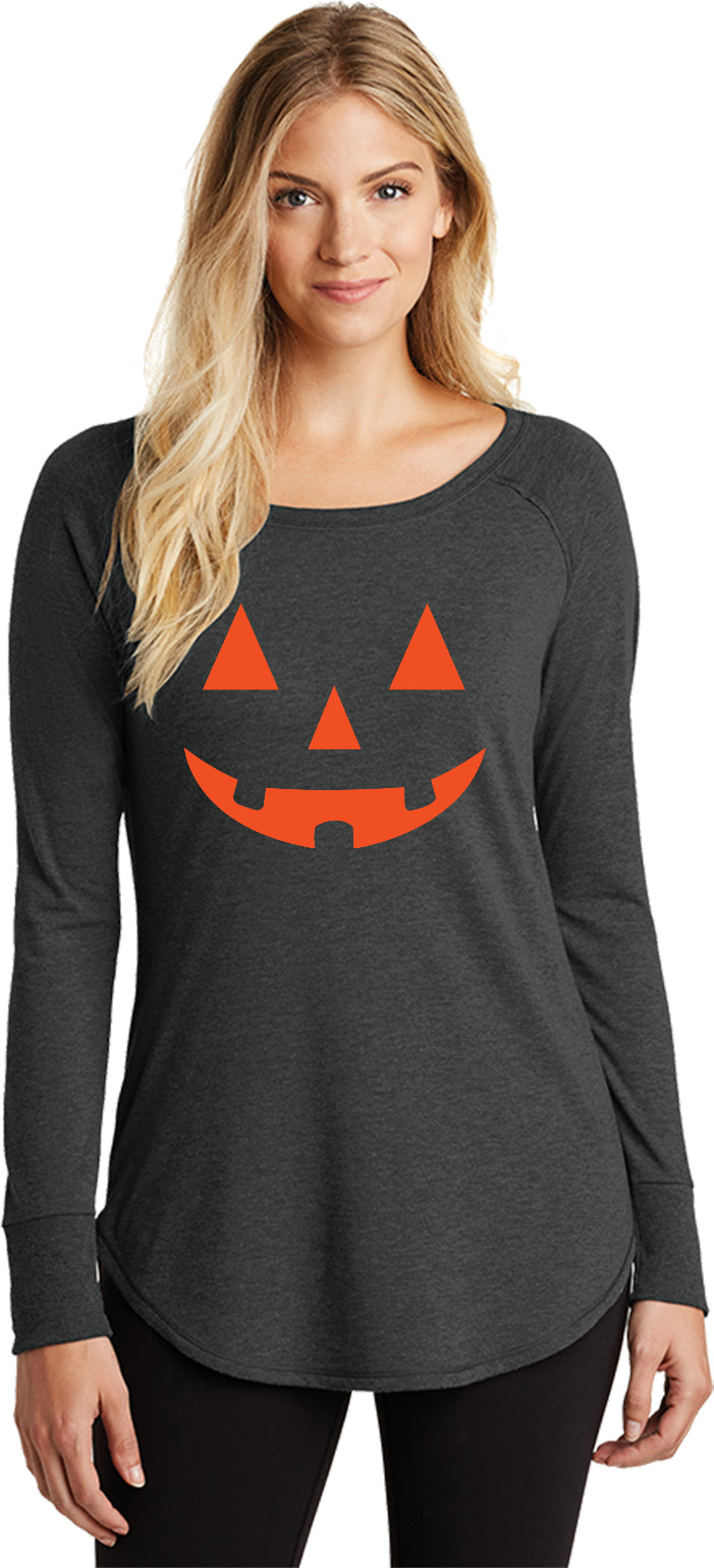 - A ladies Halloween tri blend long sleeve shirt featuring an orange jack o lantern face