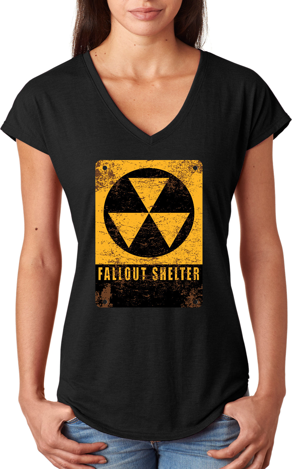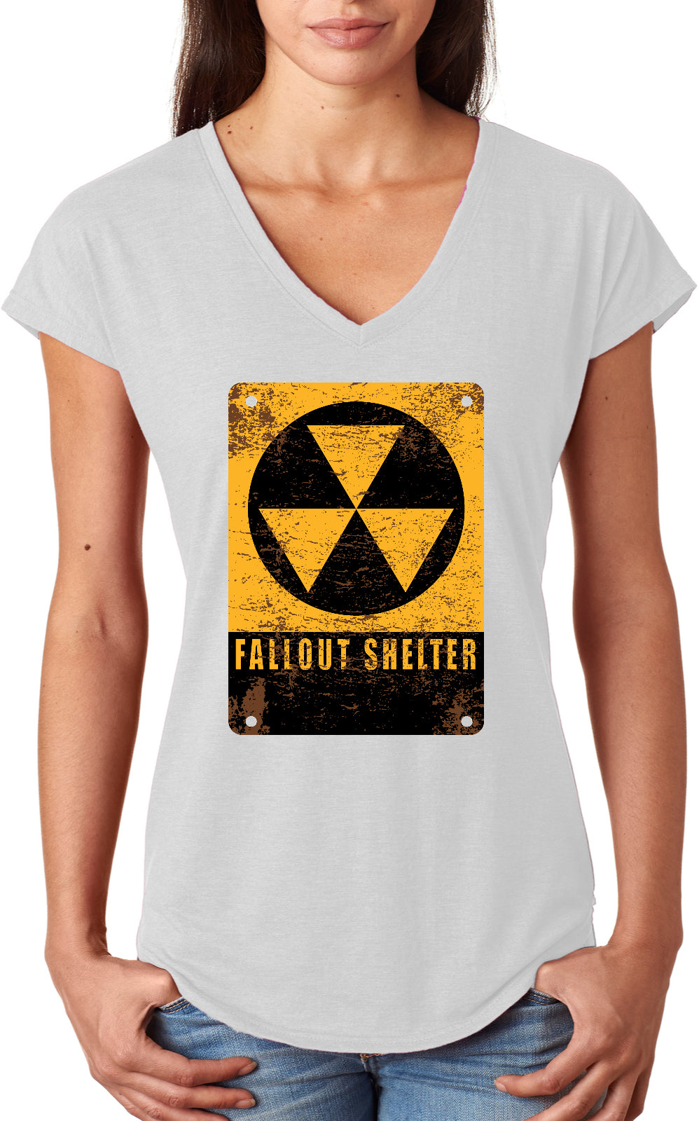• A ladies v-neck featuring the radioactive fallout shelter symbol