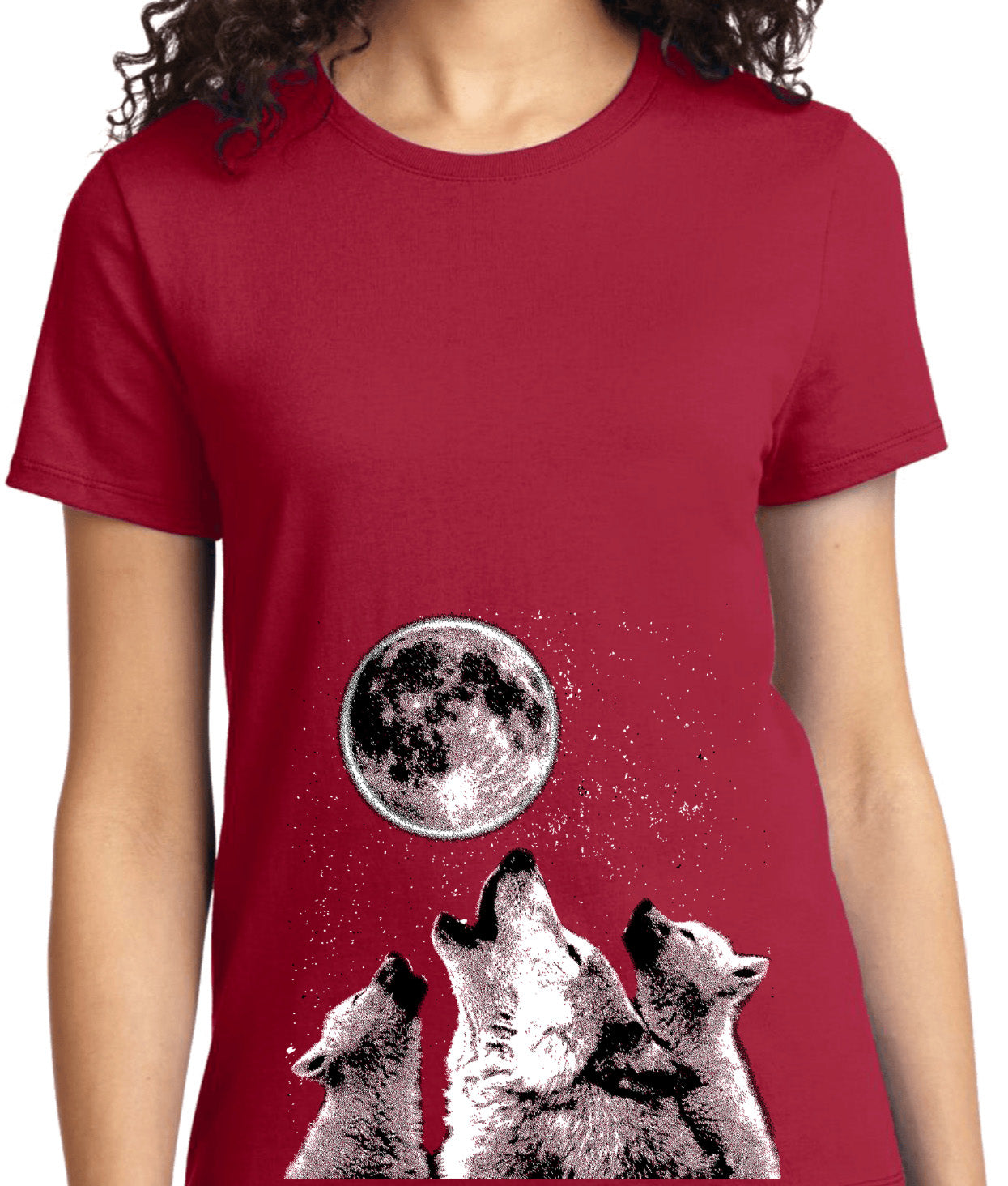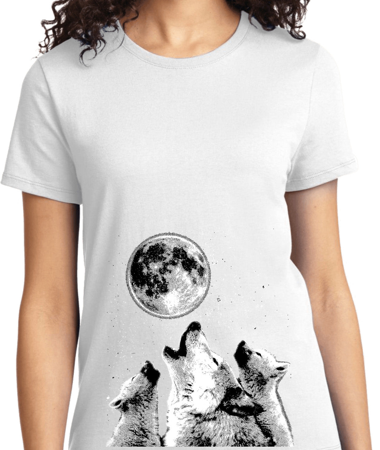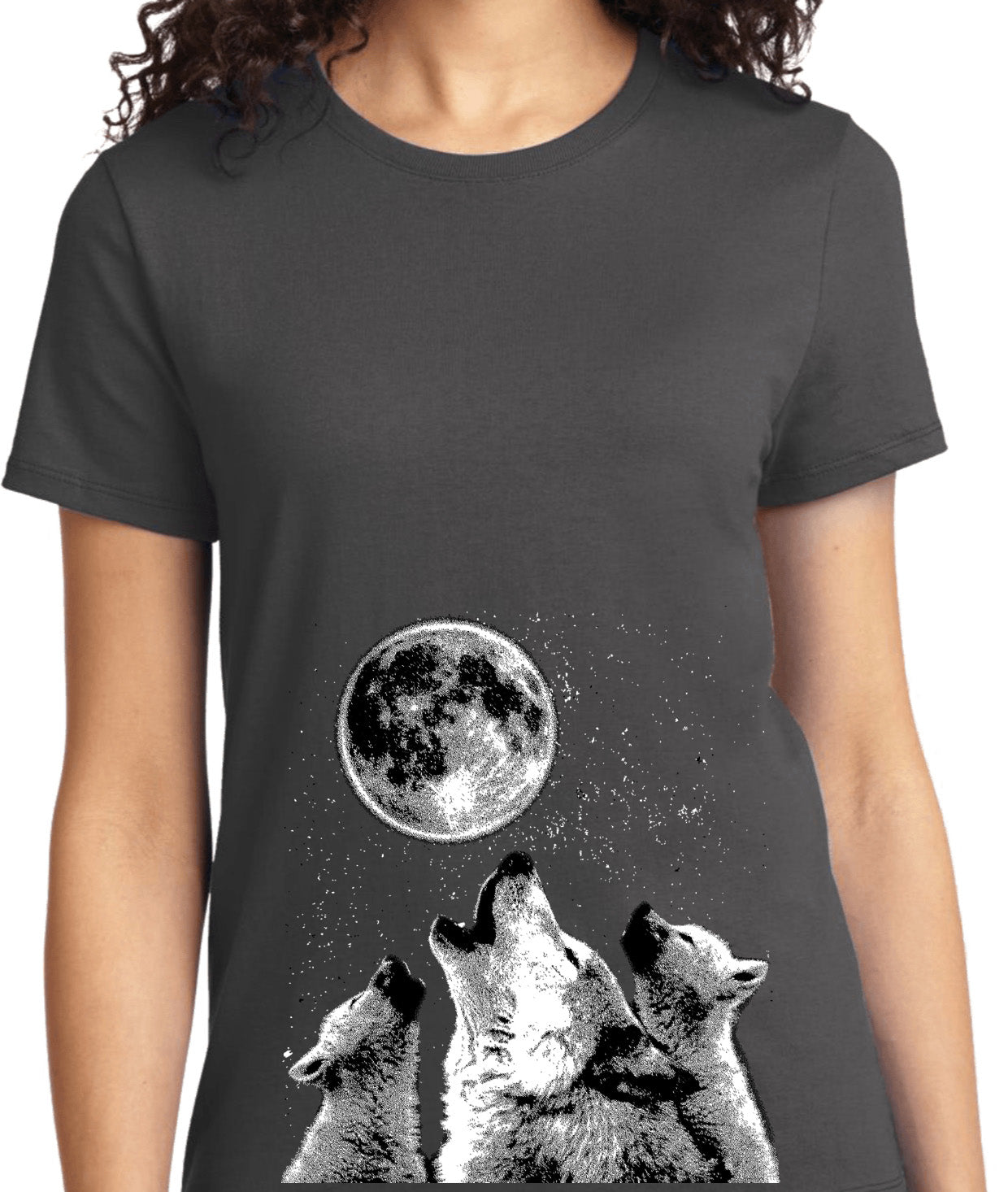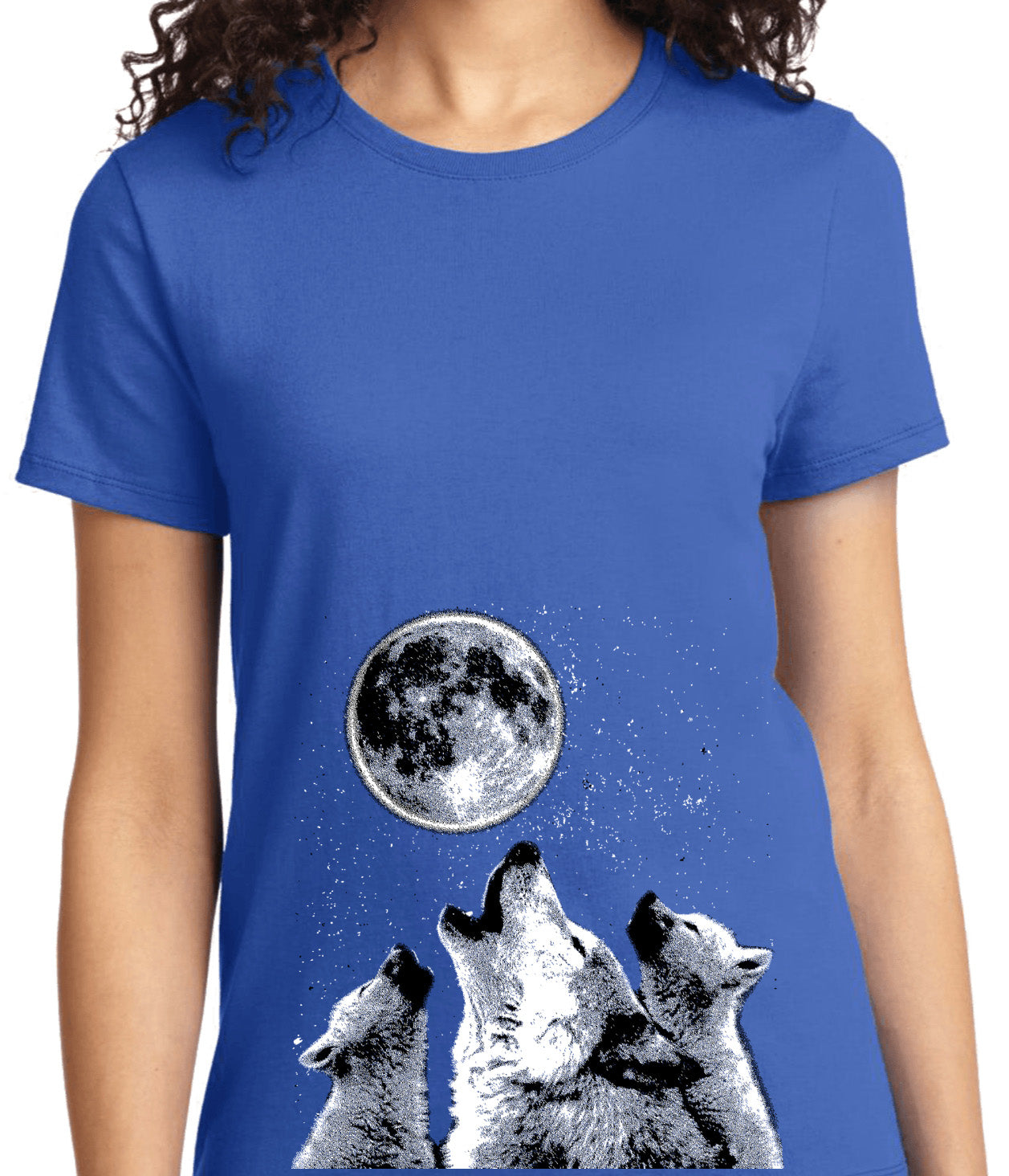 - A ladies t-shirt featuring wolves howling at the moon