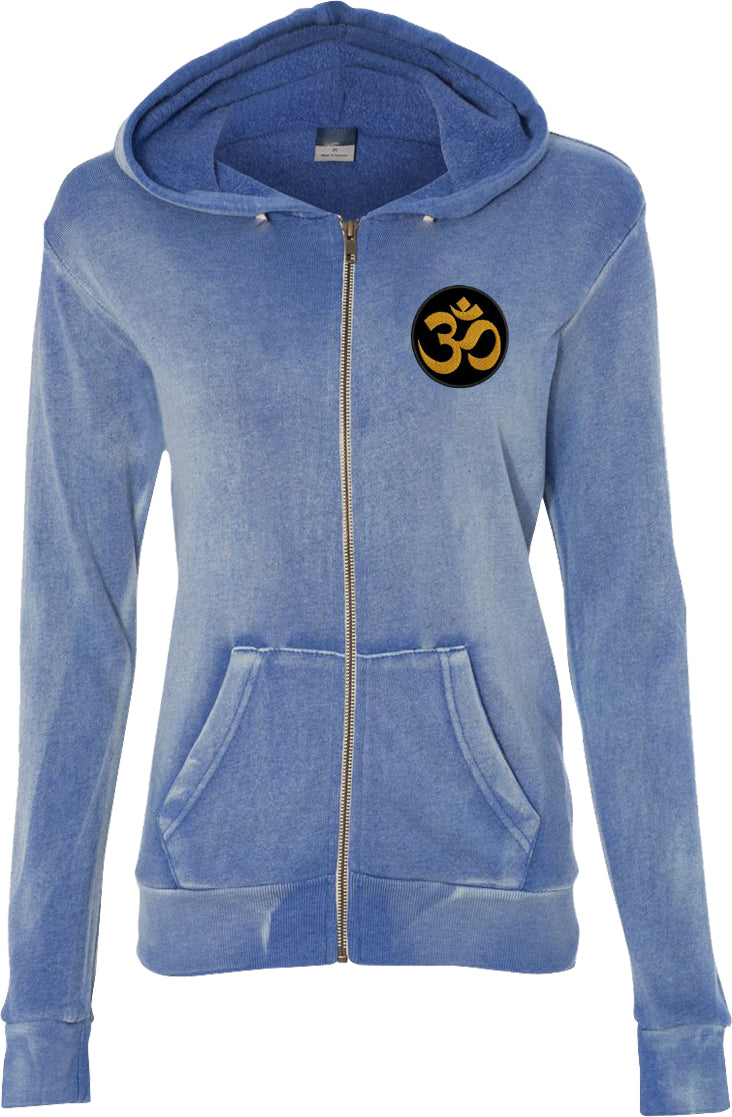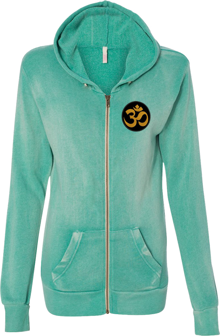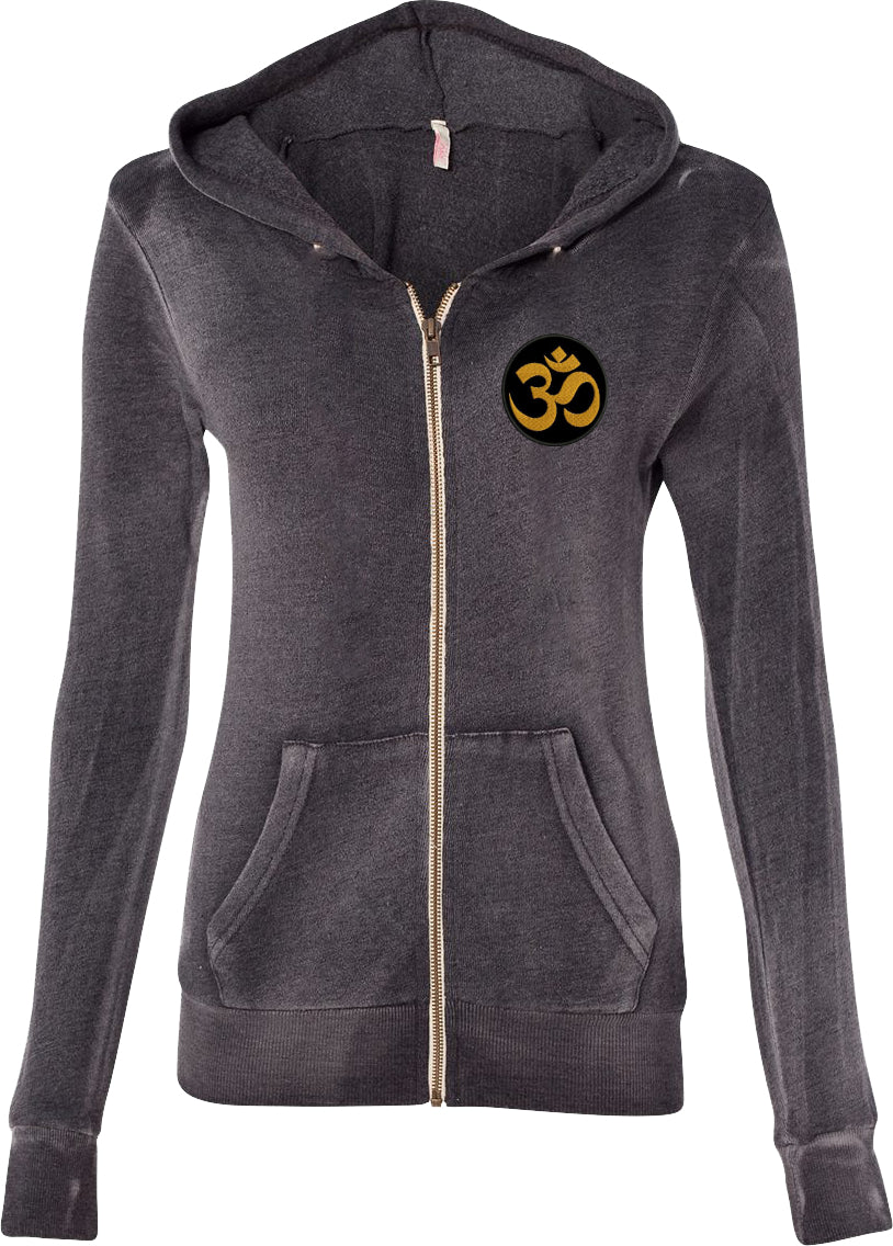 - A ladies angel fleece full zip hoodie featuring a gold Om symbol patch