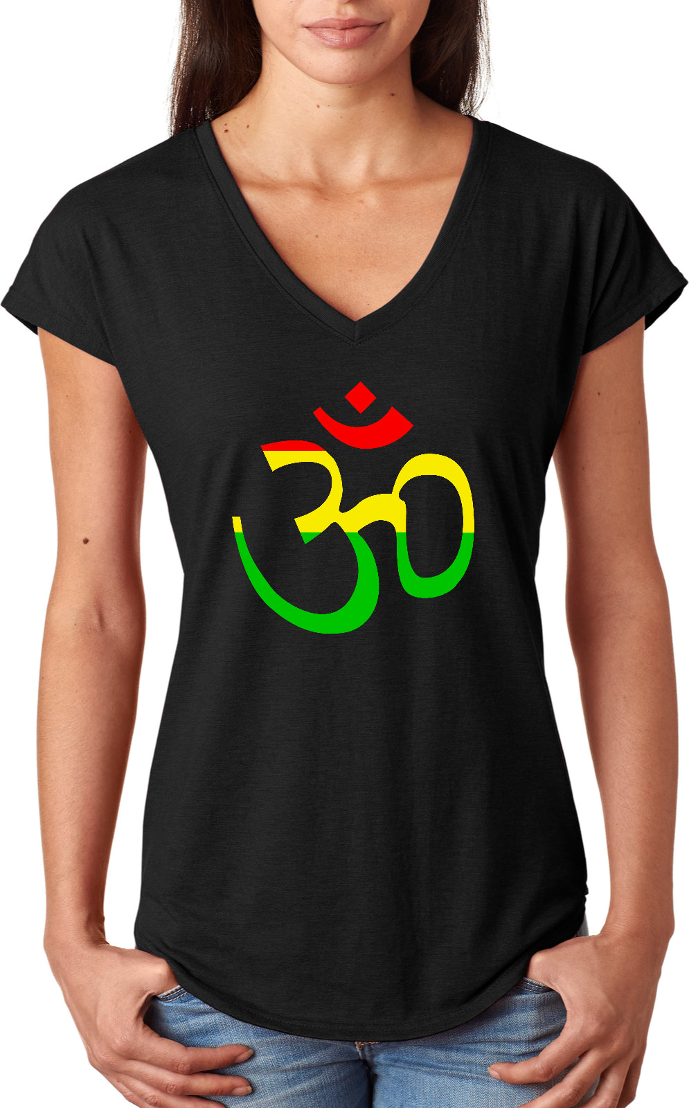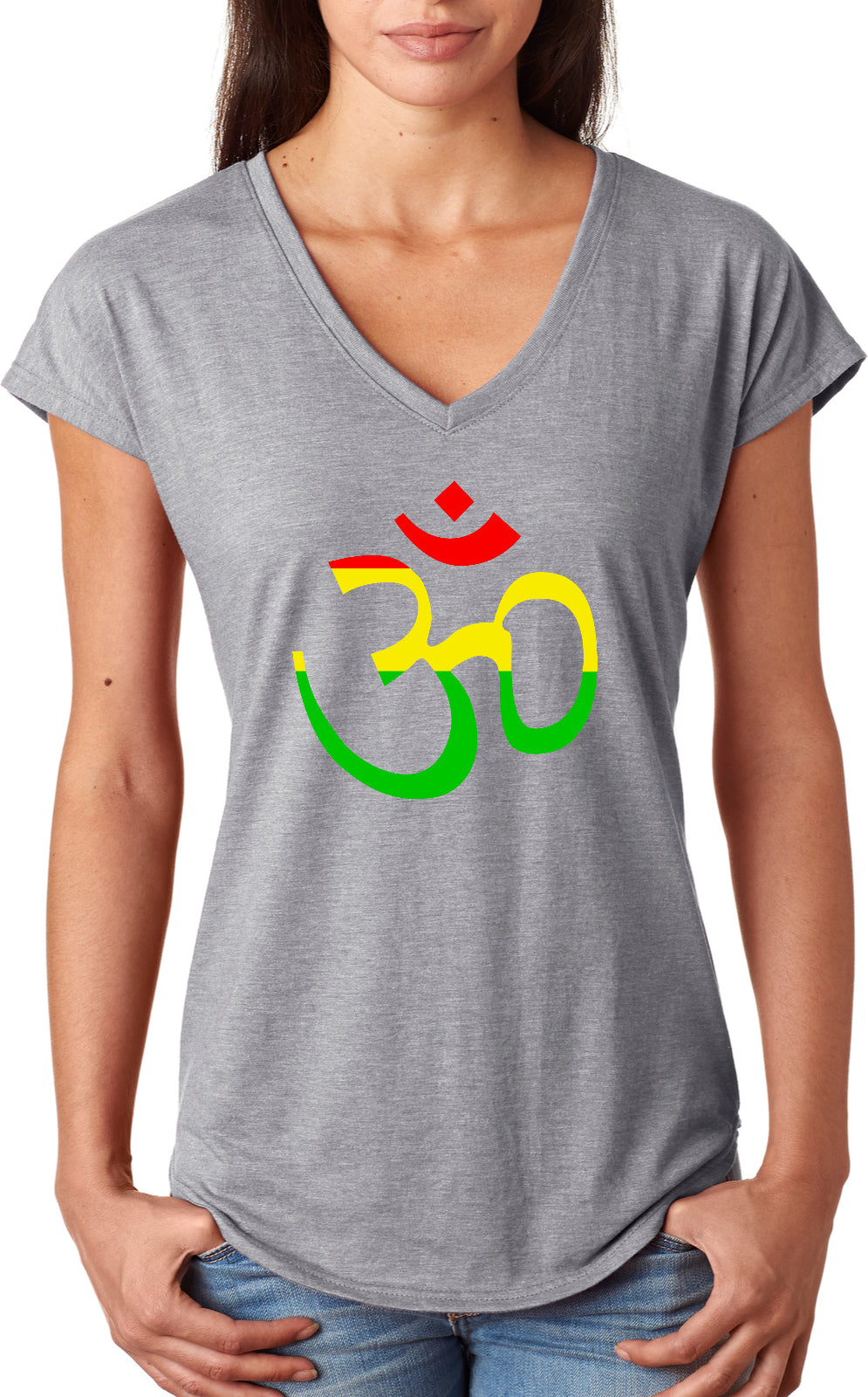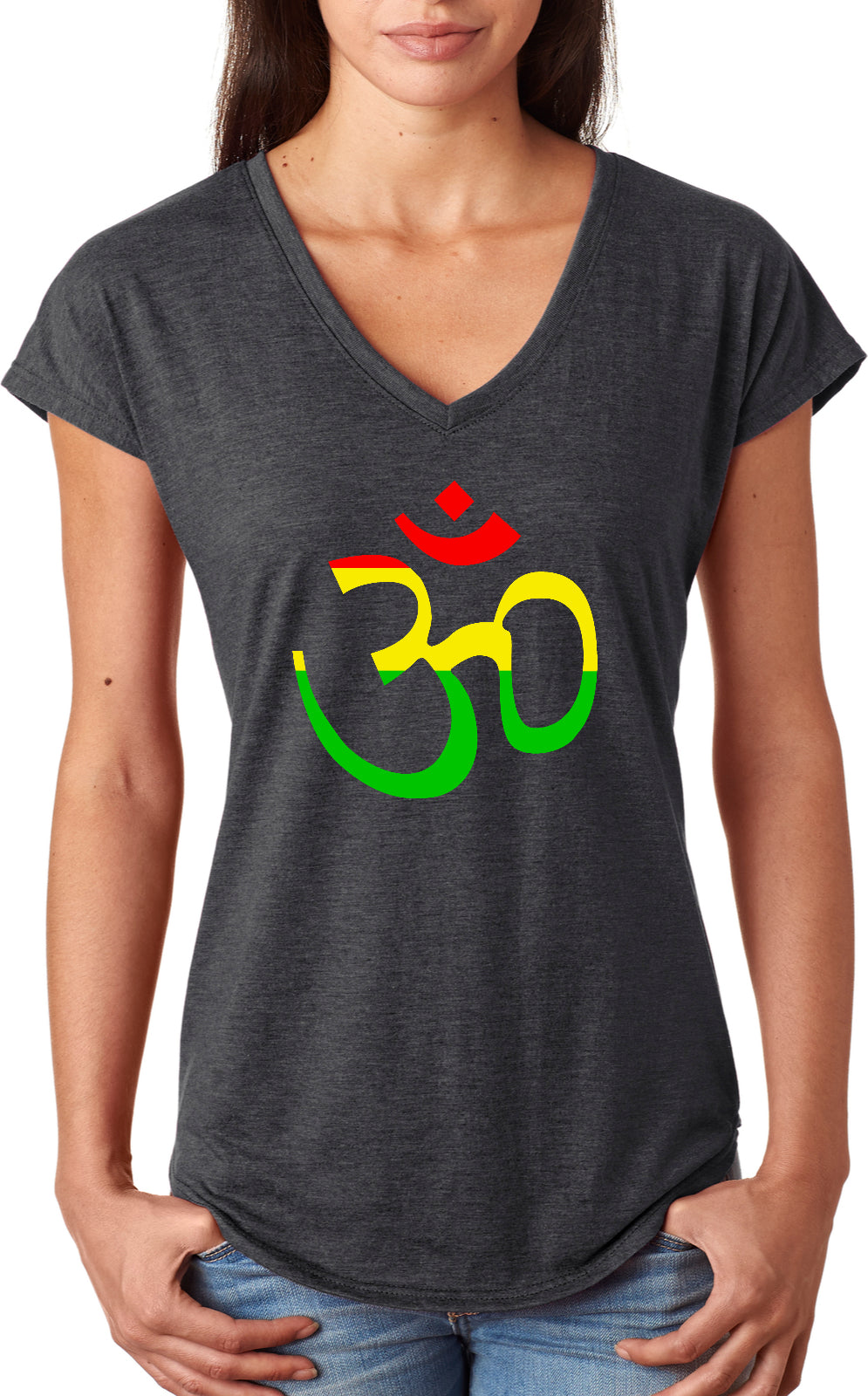 - A ladies tri blend v-neck shirt featuring a rasta colored aum symbol