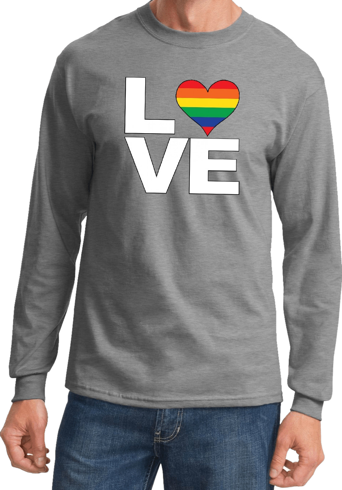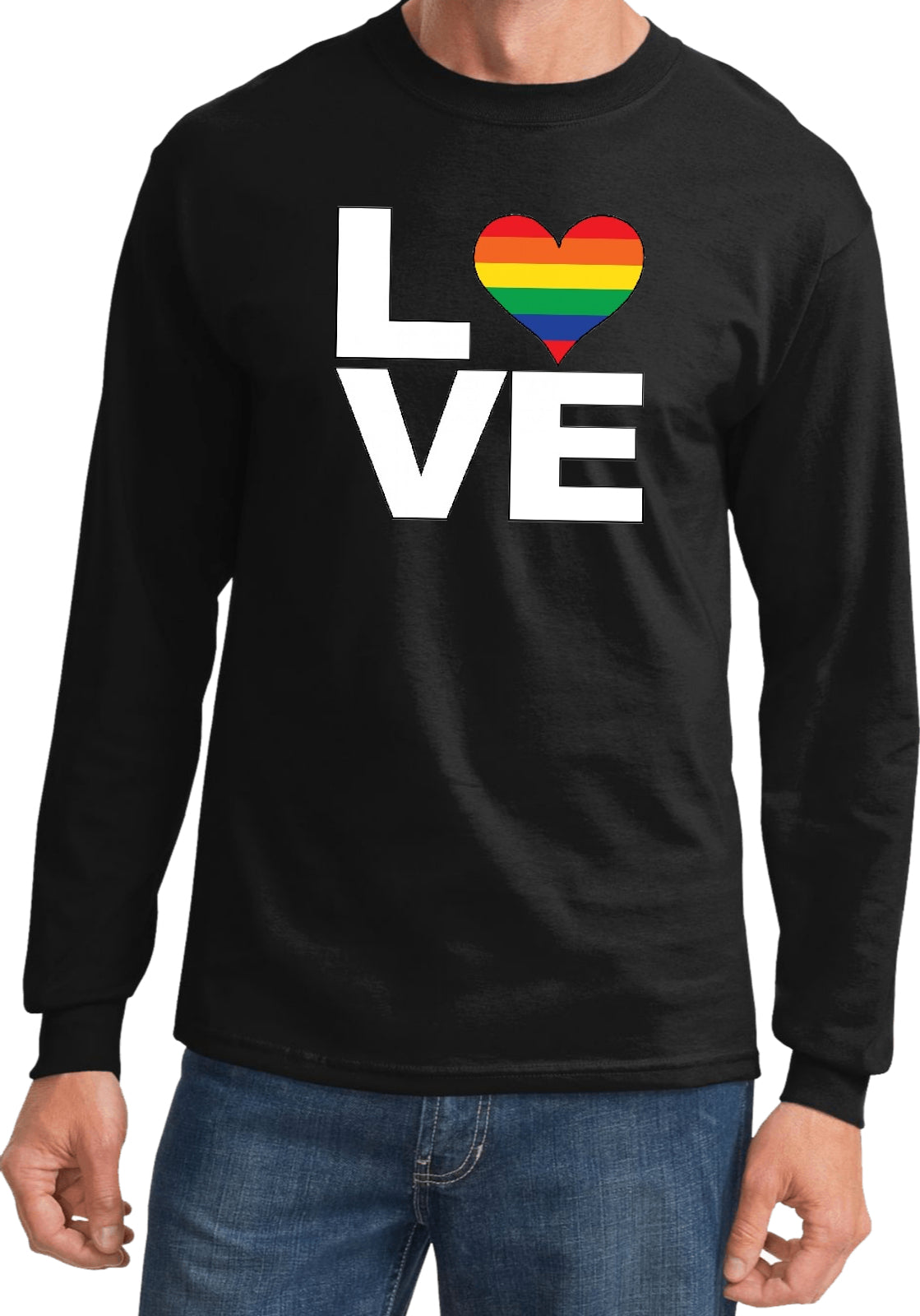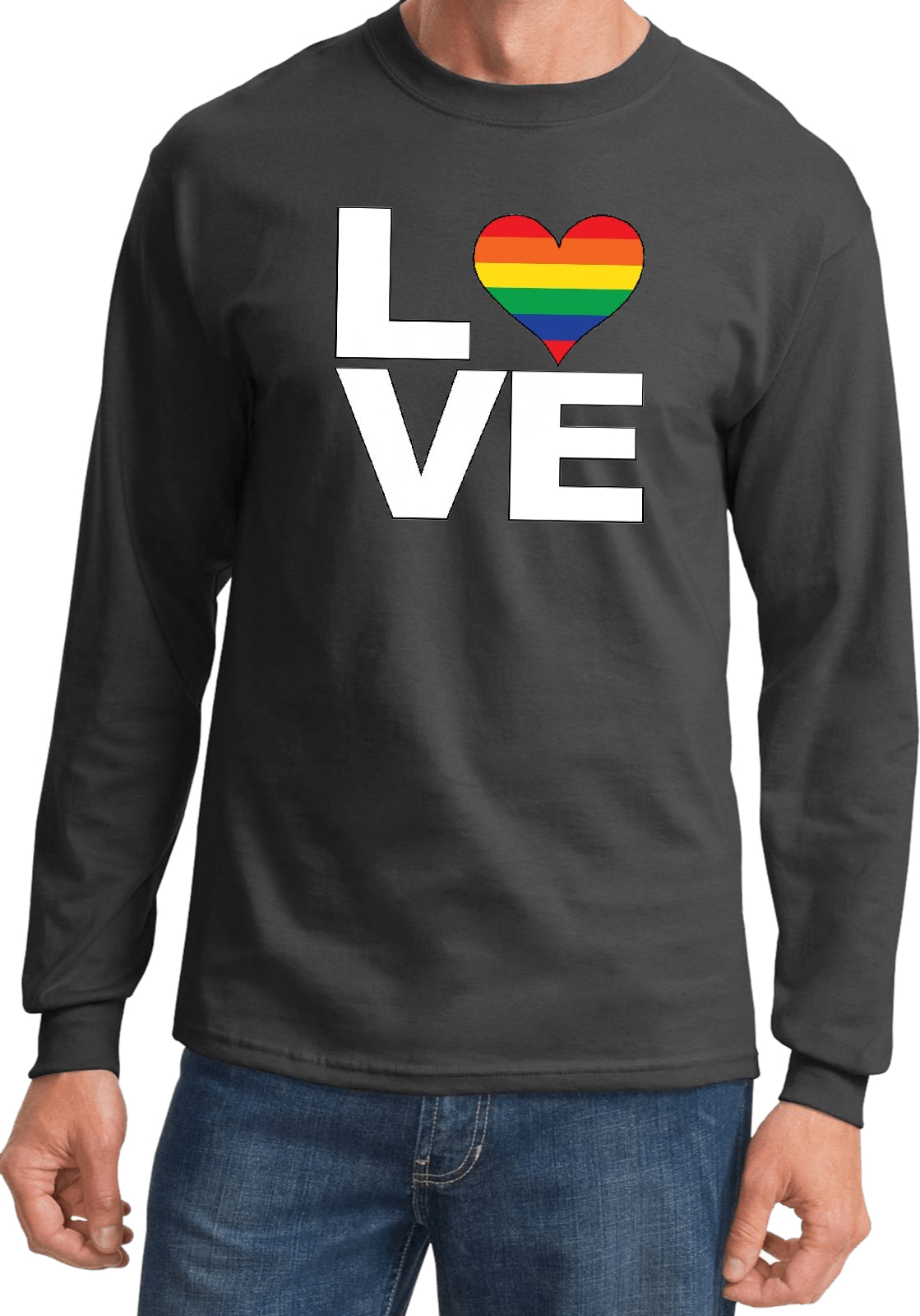 - A long sleeve shirt featuring Love with the "o" as the gay pride flag