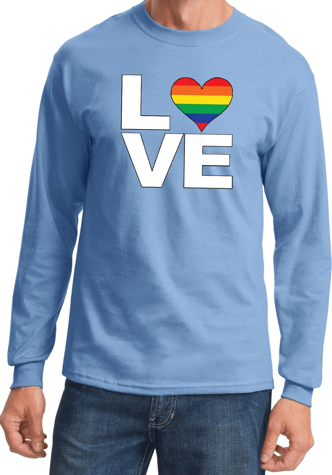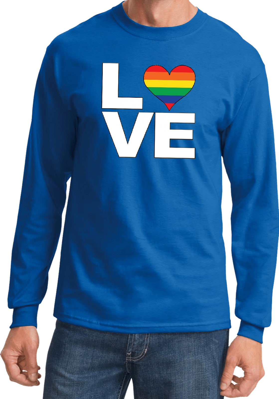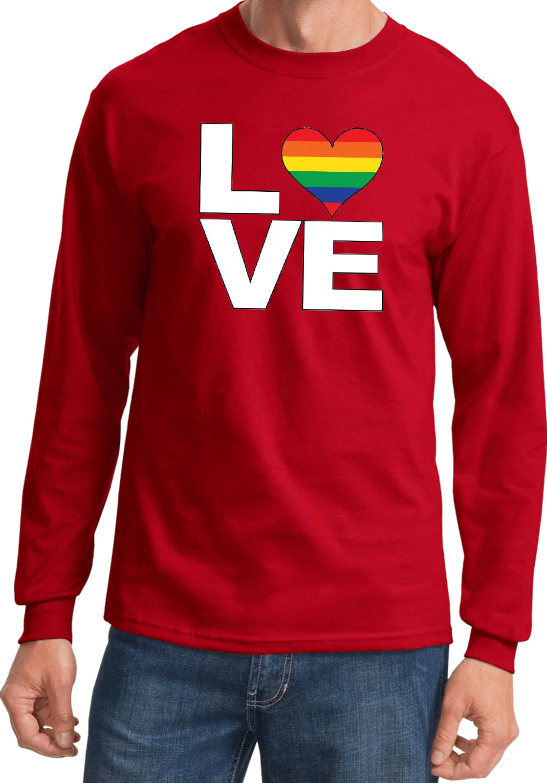 - A long sleeve shirt featuring Love with the "o" as the gay pride flag