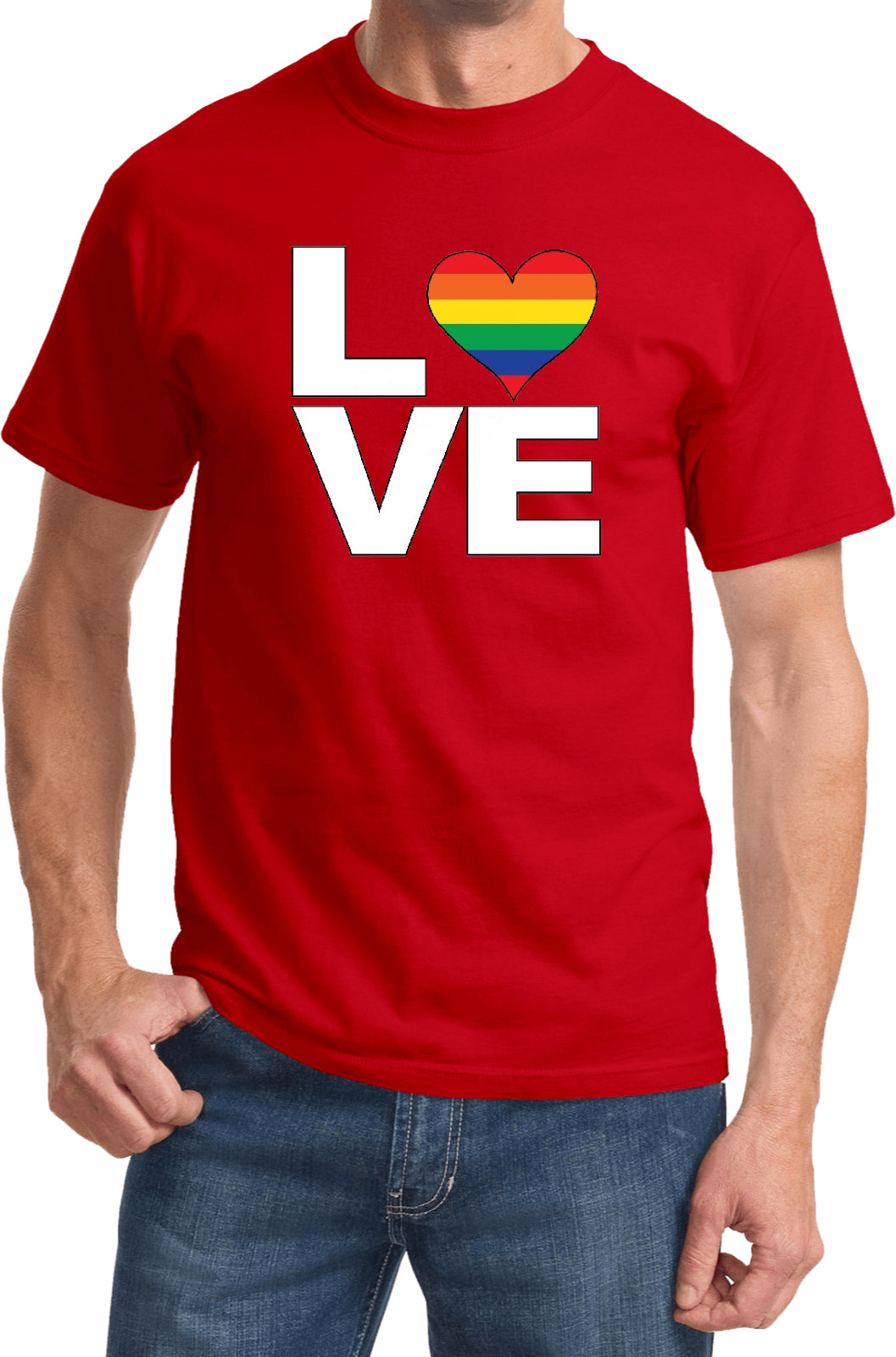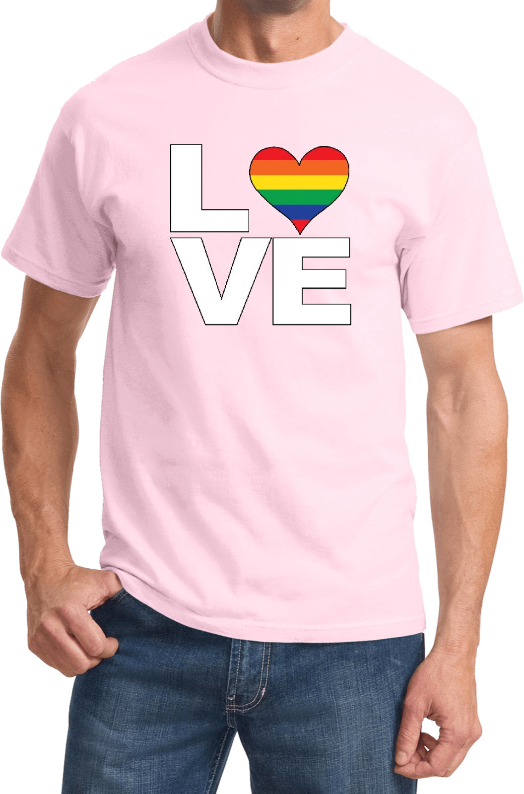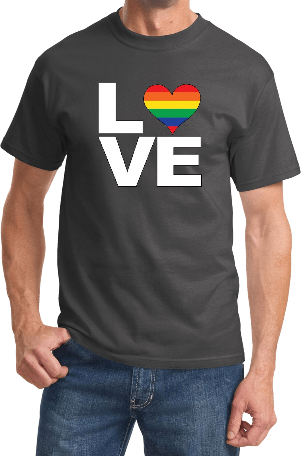• A mens t-shirt featuring Love with the "o" as the gay pride flag