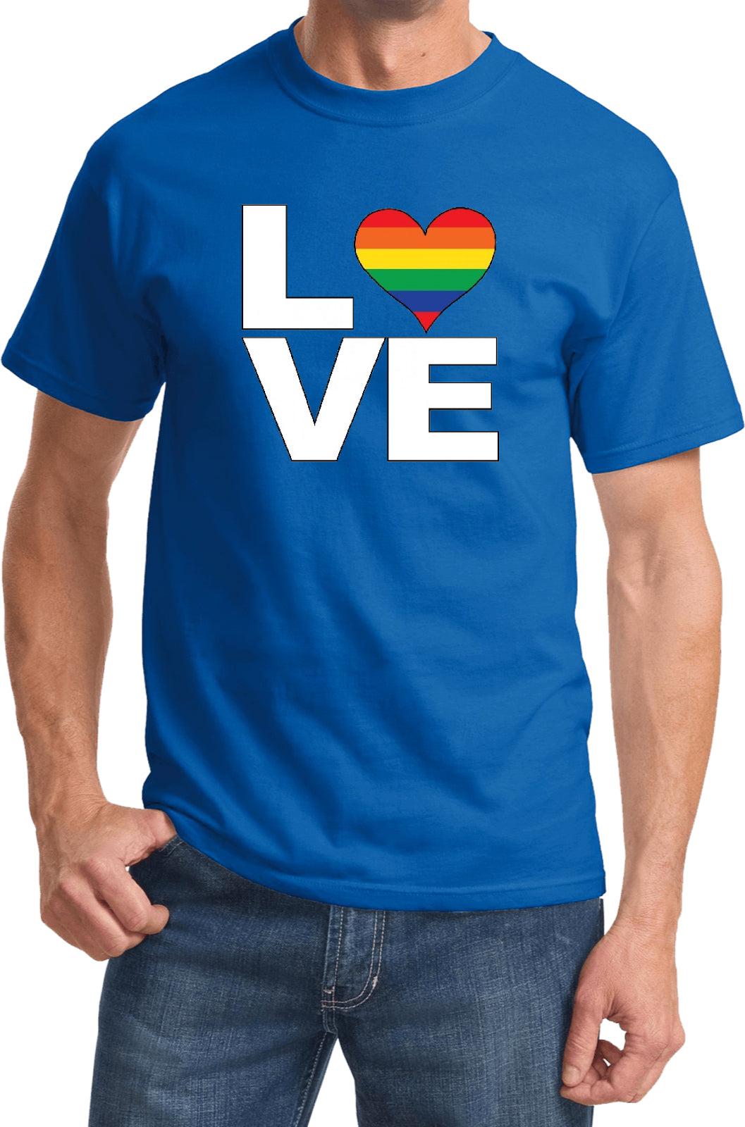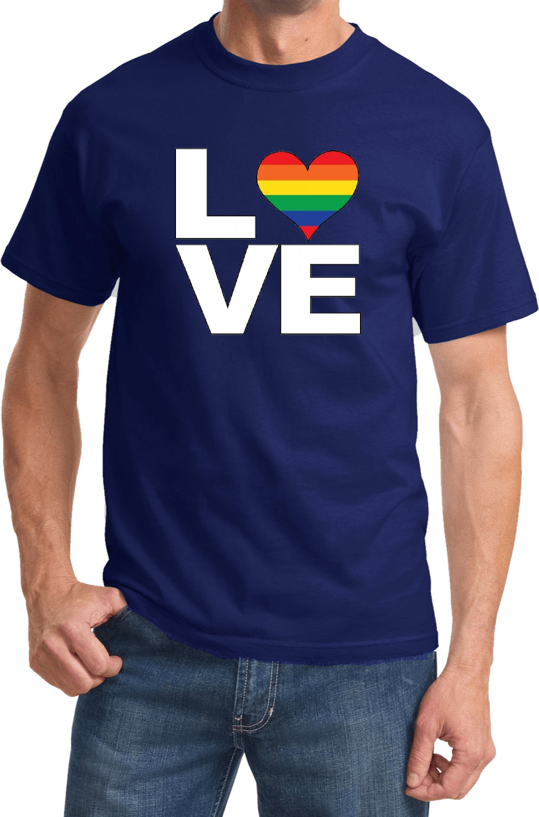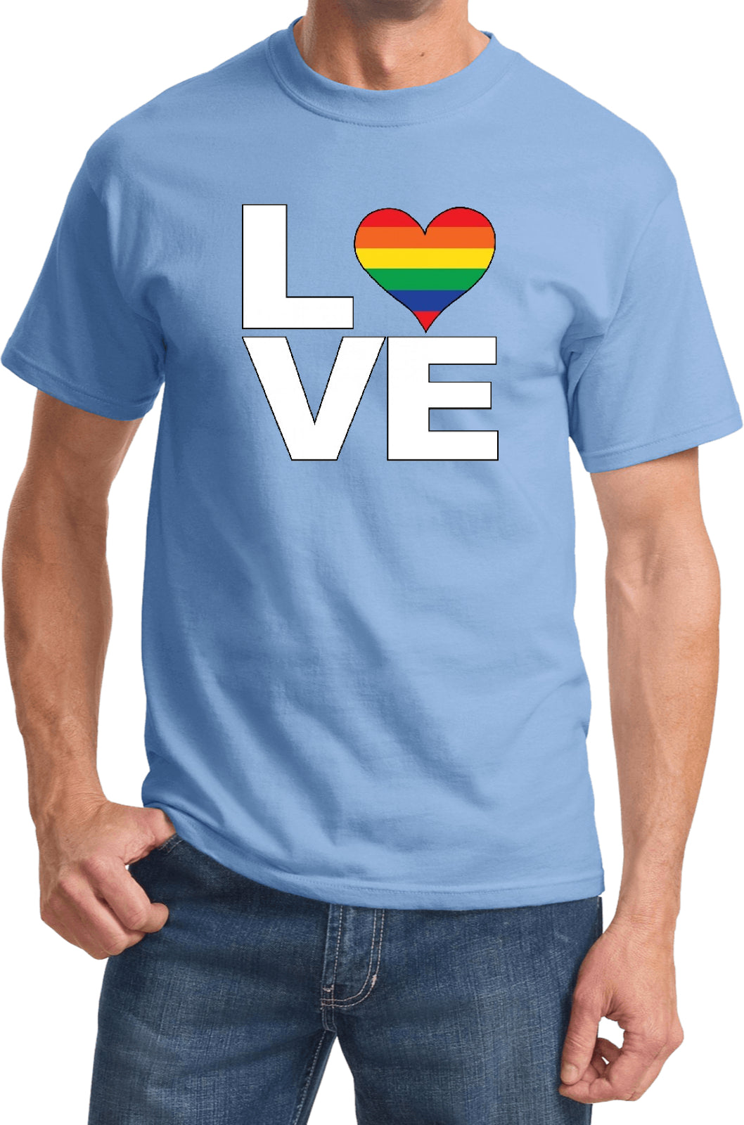 • A mens t-shirt featuring Love with the "o" as the gay pride flag