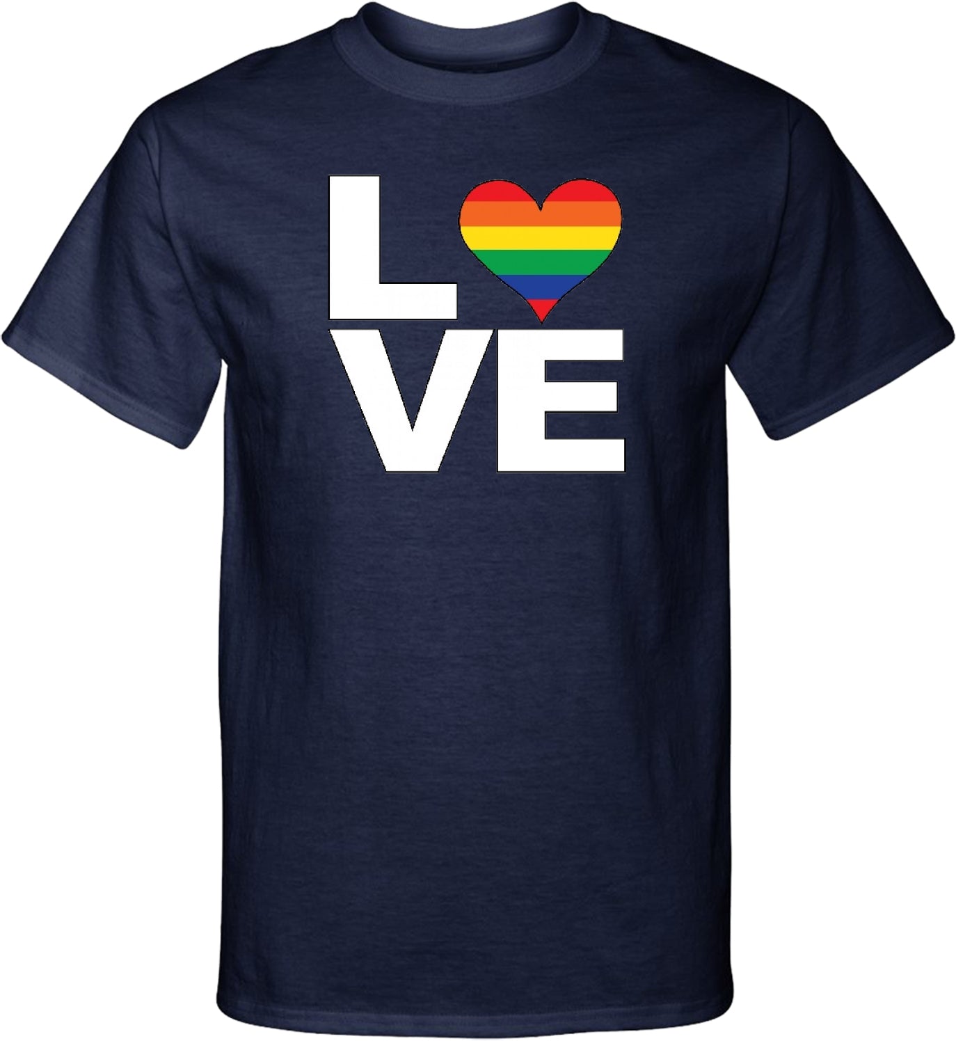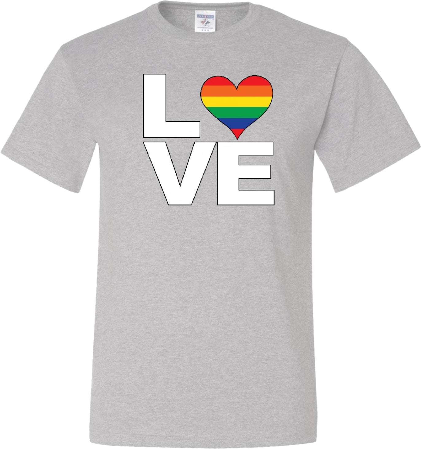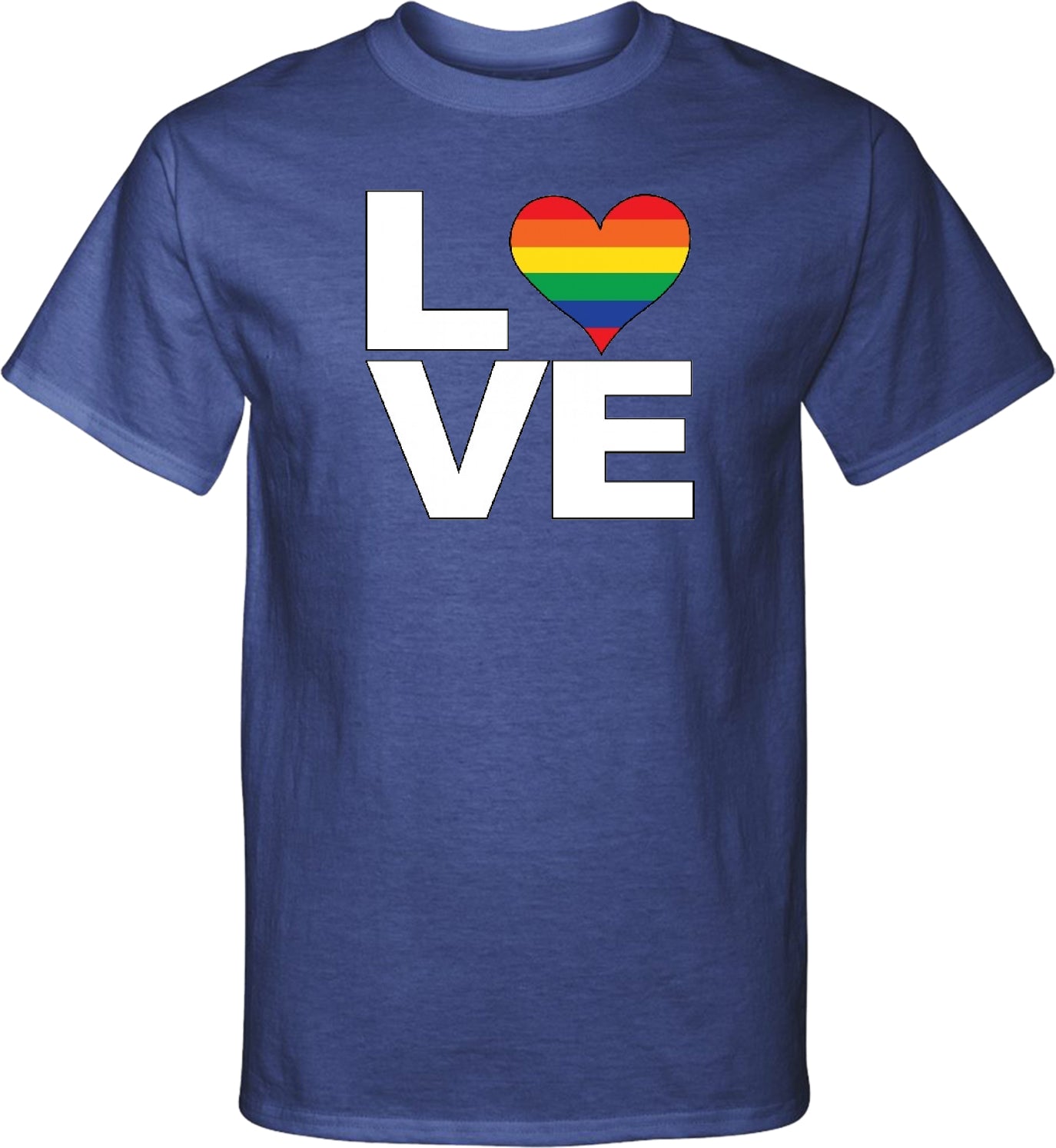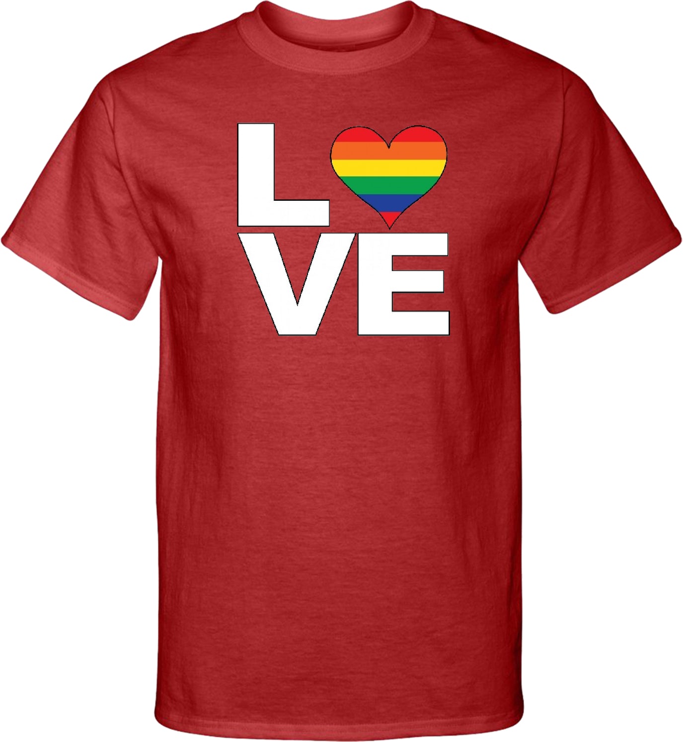 - A tall t-shirt featuring Love with the "o" as the gay pride flag