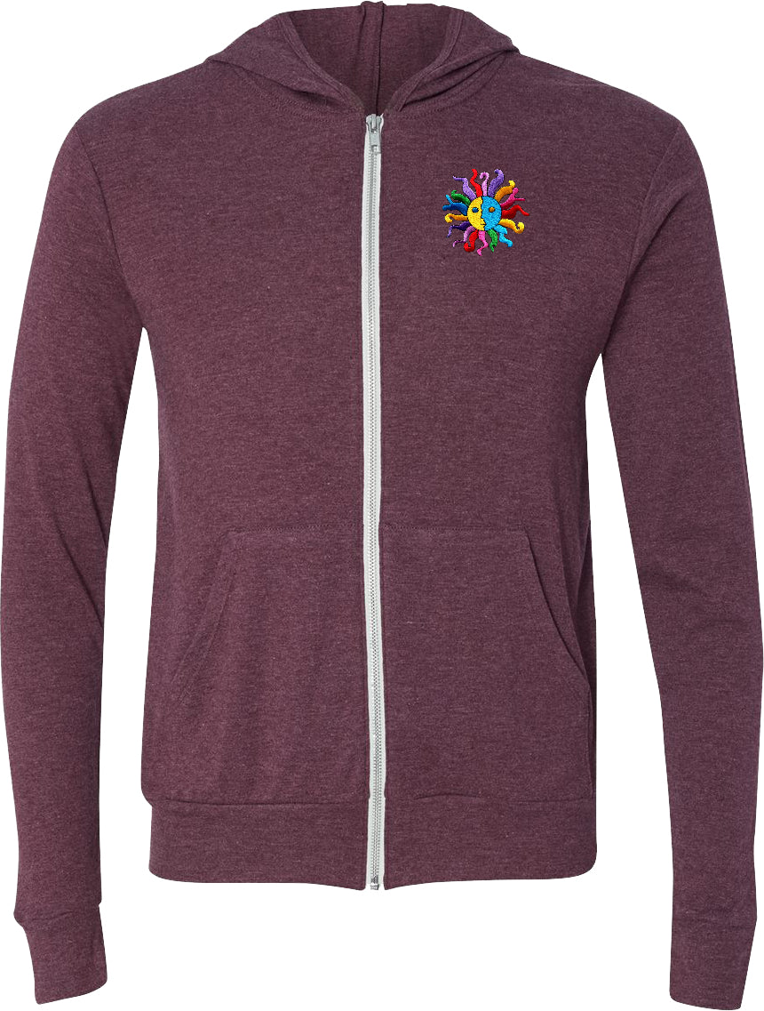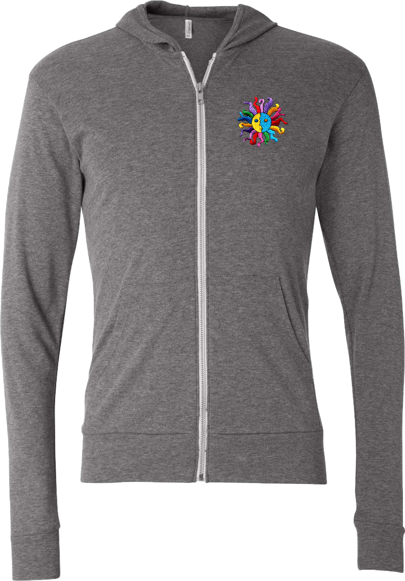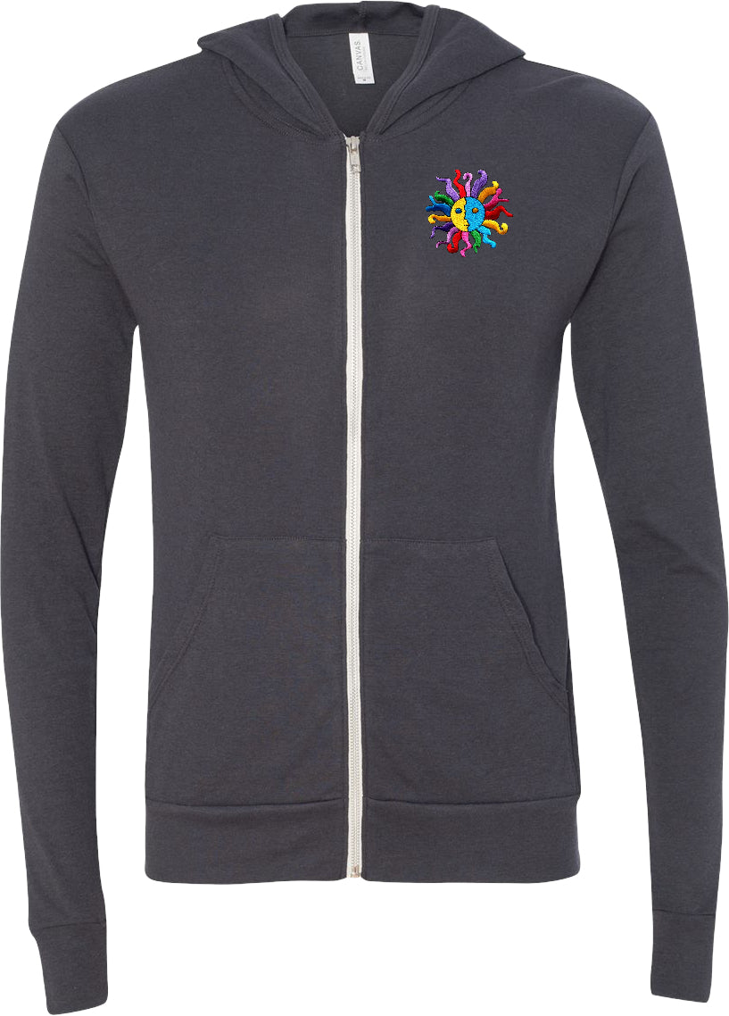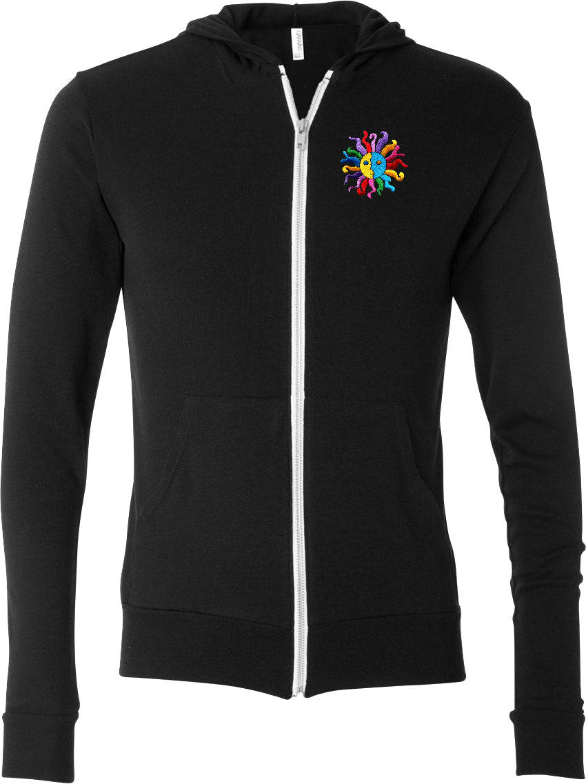 - A lightweight full zip hoodie featuring a psychedelic hippie sun patch