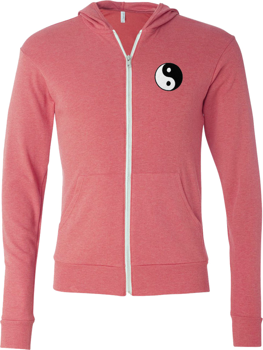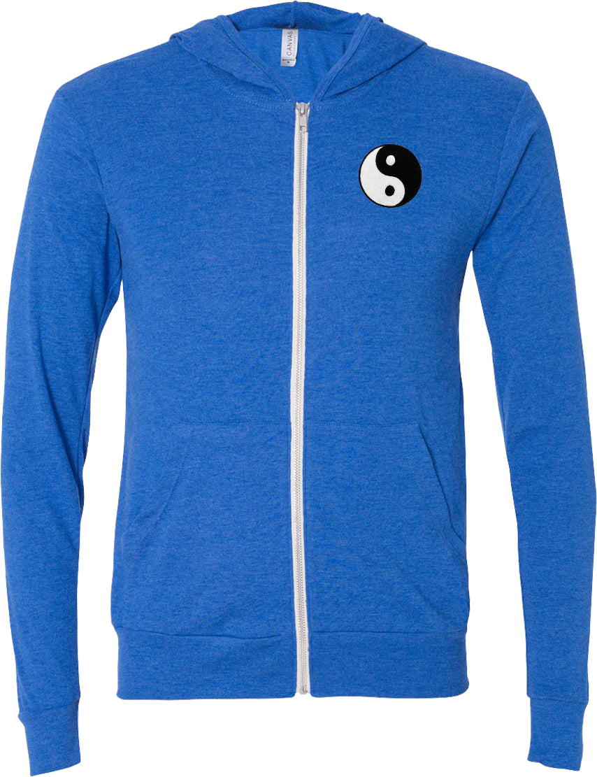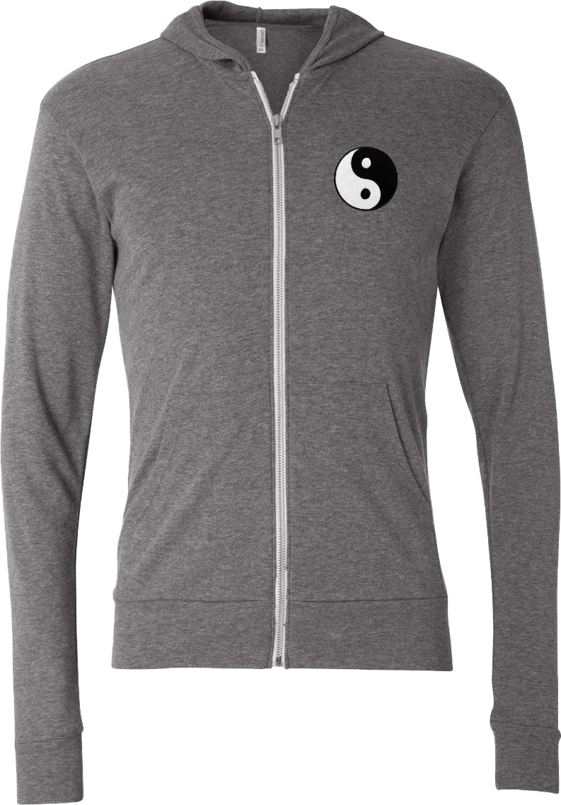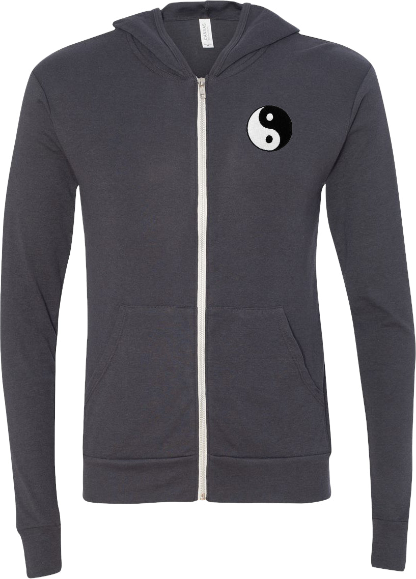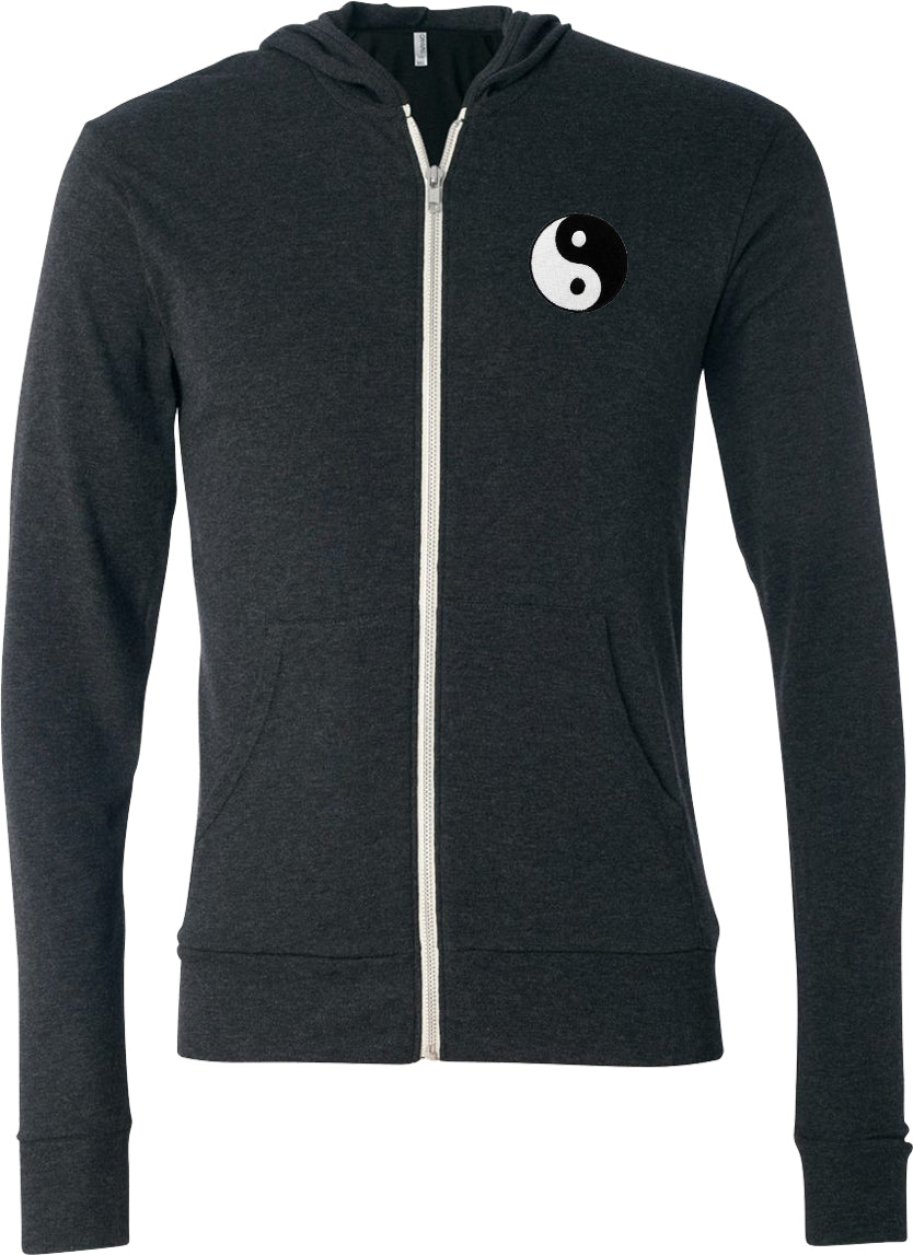 - A lightweight full zip hoodie featuring a yin yang symbol patch