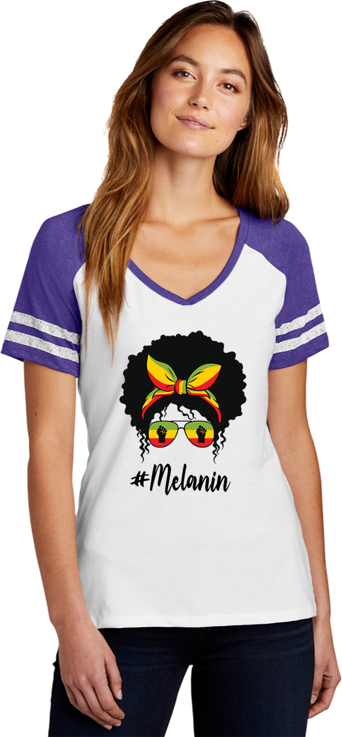 A cute Rasta Melanin ladies v-neck shirt with distressed printed stripes at the sleeves. Made from a soft and comfortable blend of cotton/polyester. The t-shirt features a cute rasta african american melanin afro mom design that reads #Melanin with a rastafarian headband and sunglasses with the reggae fist. This v-neck shirt makes the perfect gift for African American moms, Reggae moms, Jamaican moms, Birthdays, Christmas, and Mother's Day.
