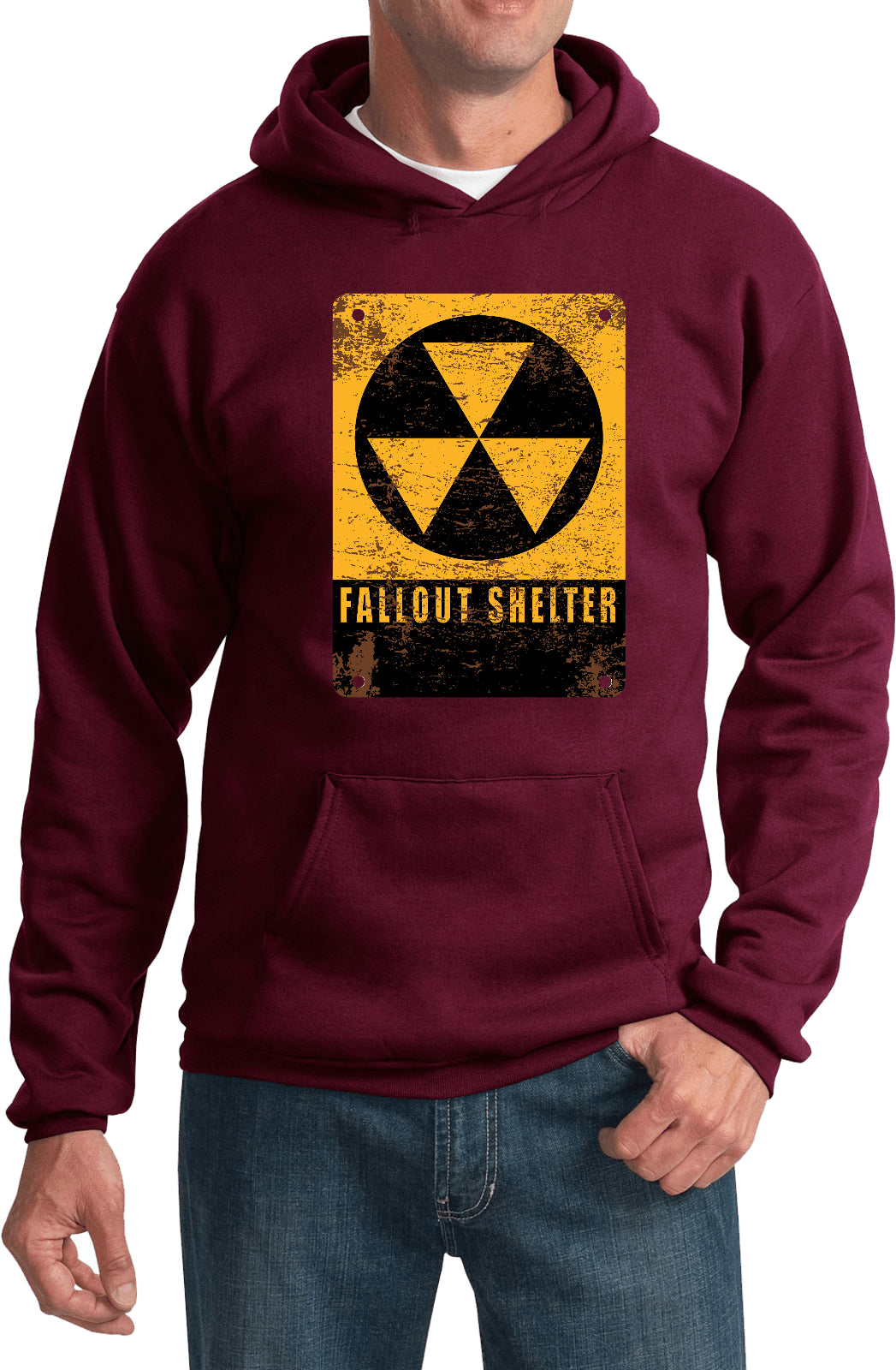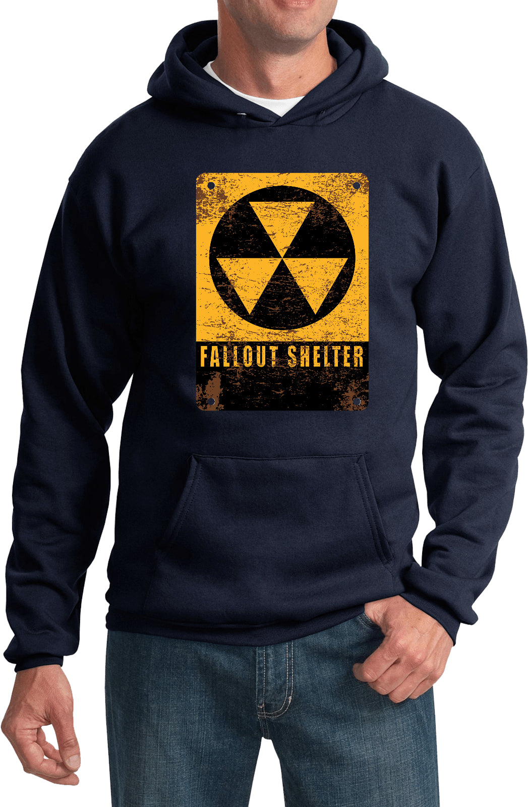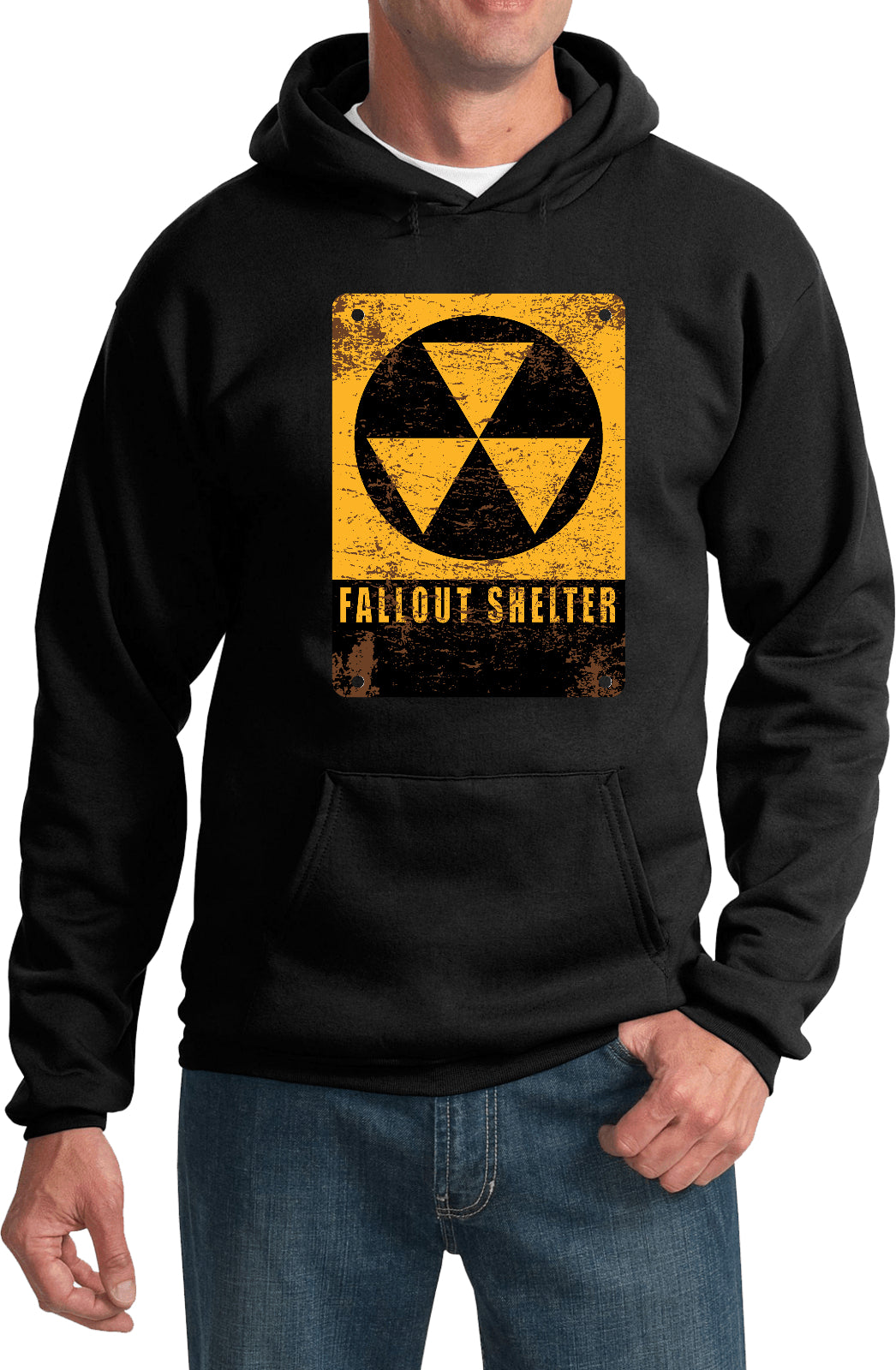 • A pullover hoodie featuring the radioactive fallout shelter symbol