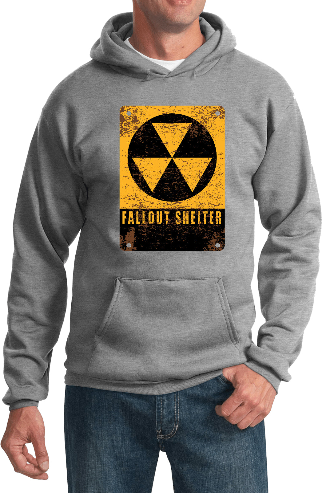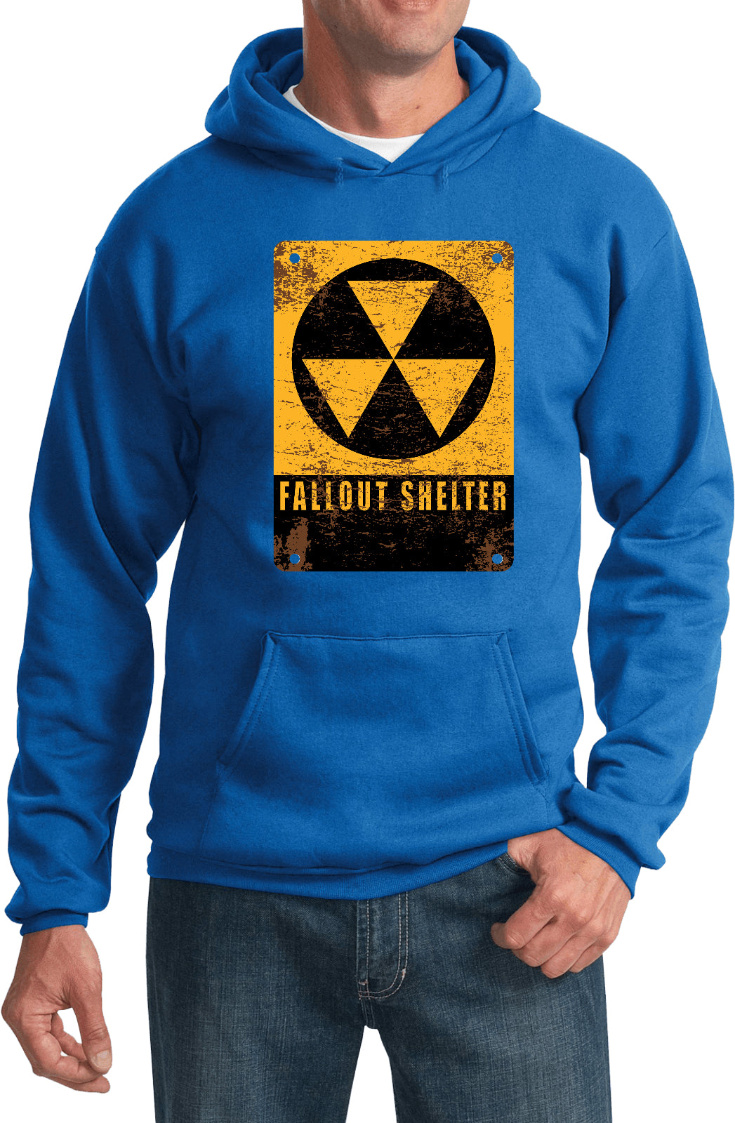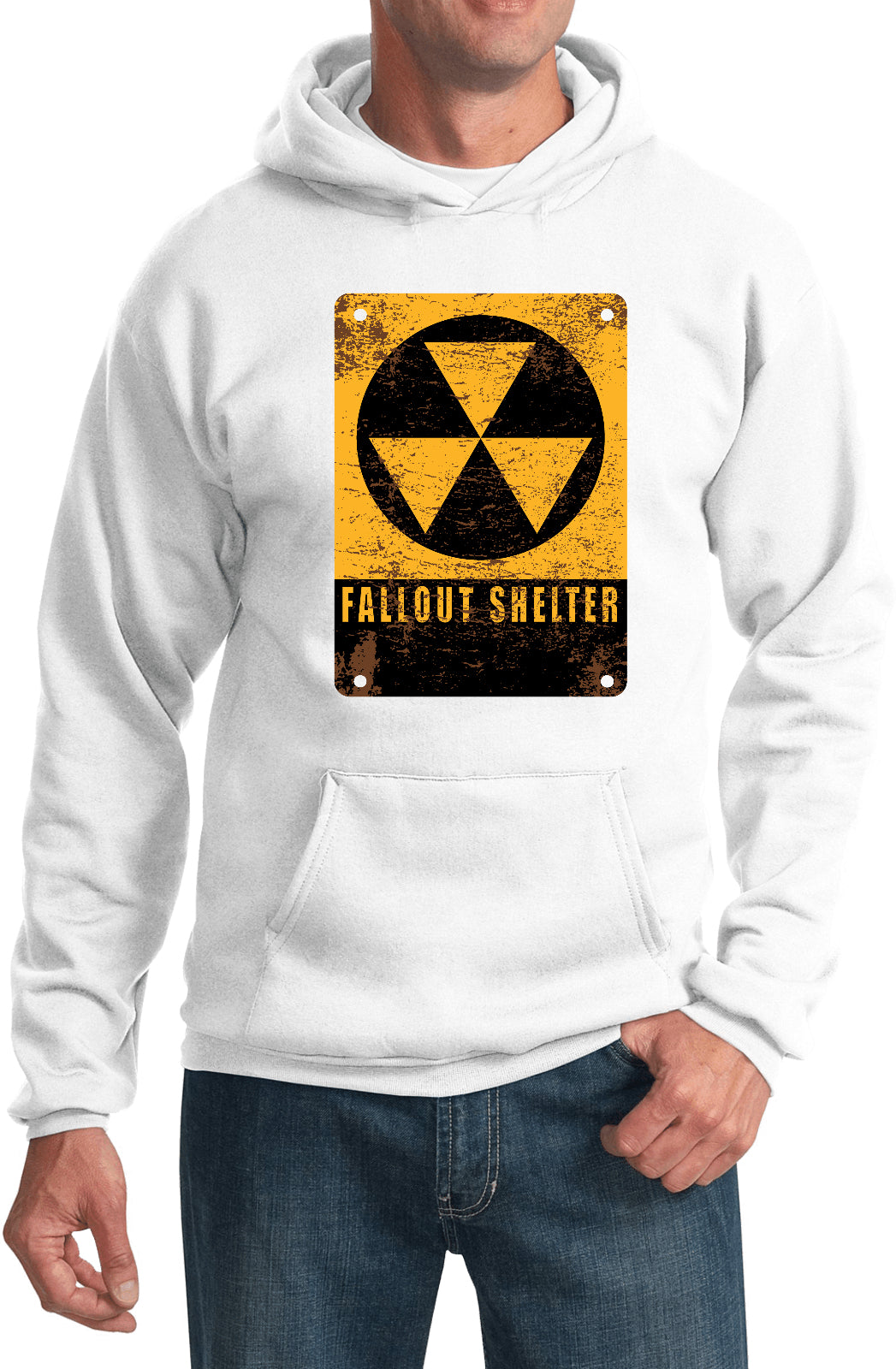 • A pullover hoodie featuring the radioactive fallout shelter symbol