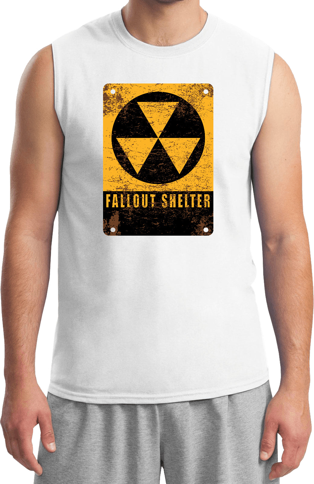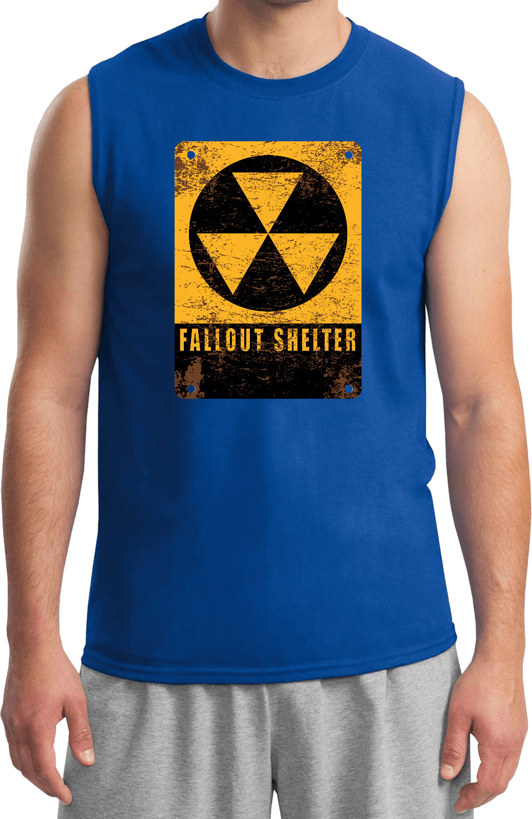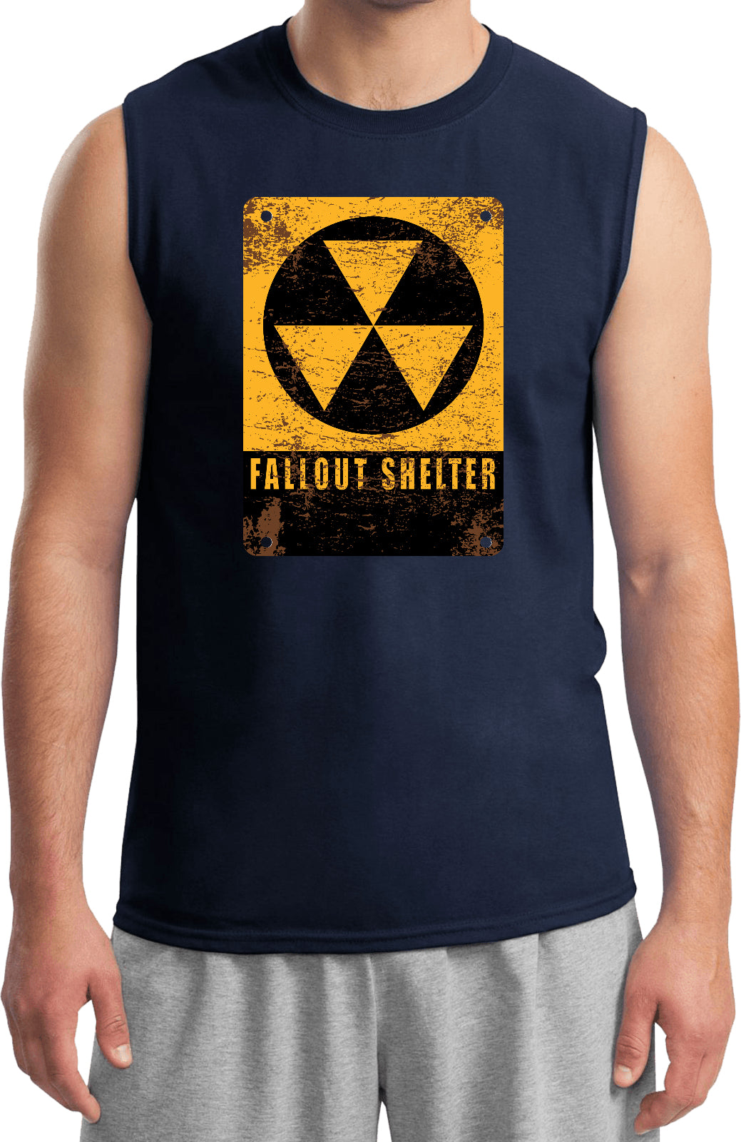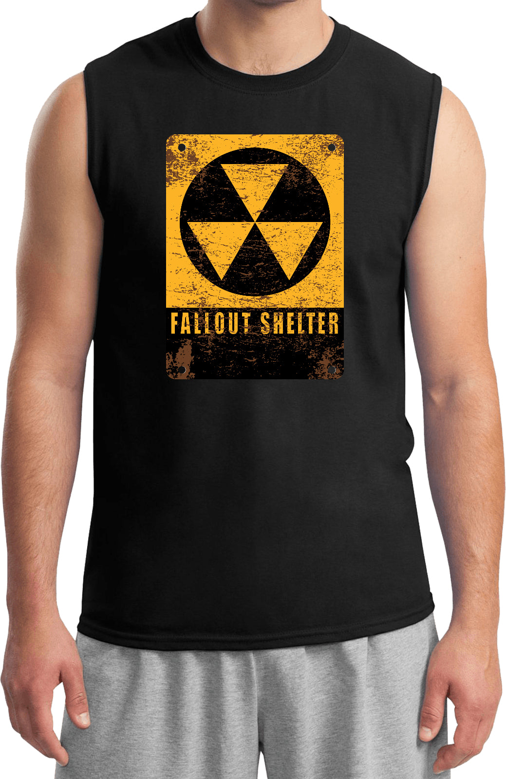 - A mens sleeveless shirt featuring the radioactive fallout shelter symbol