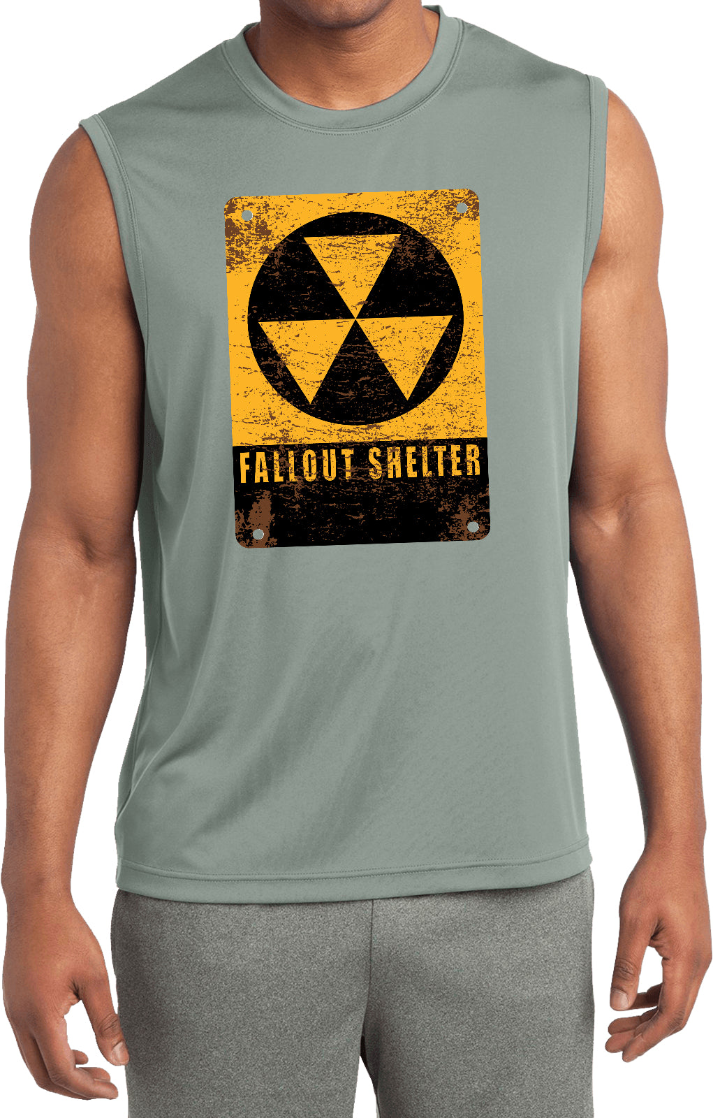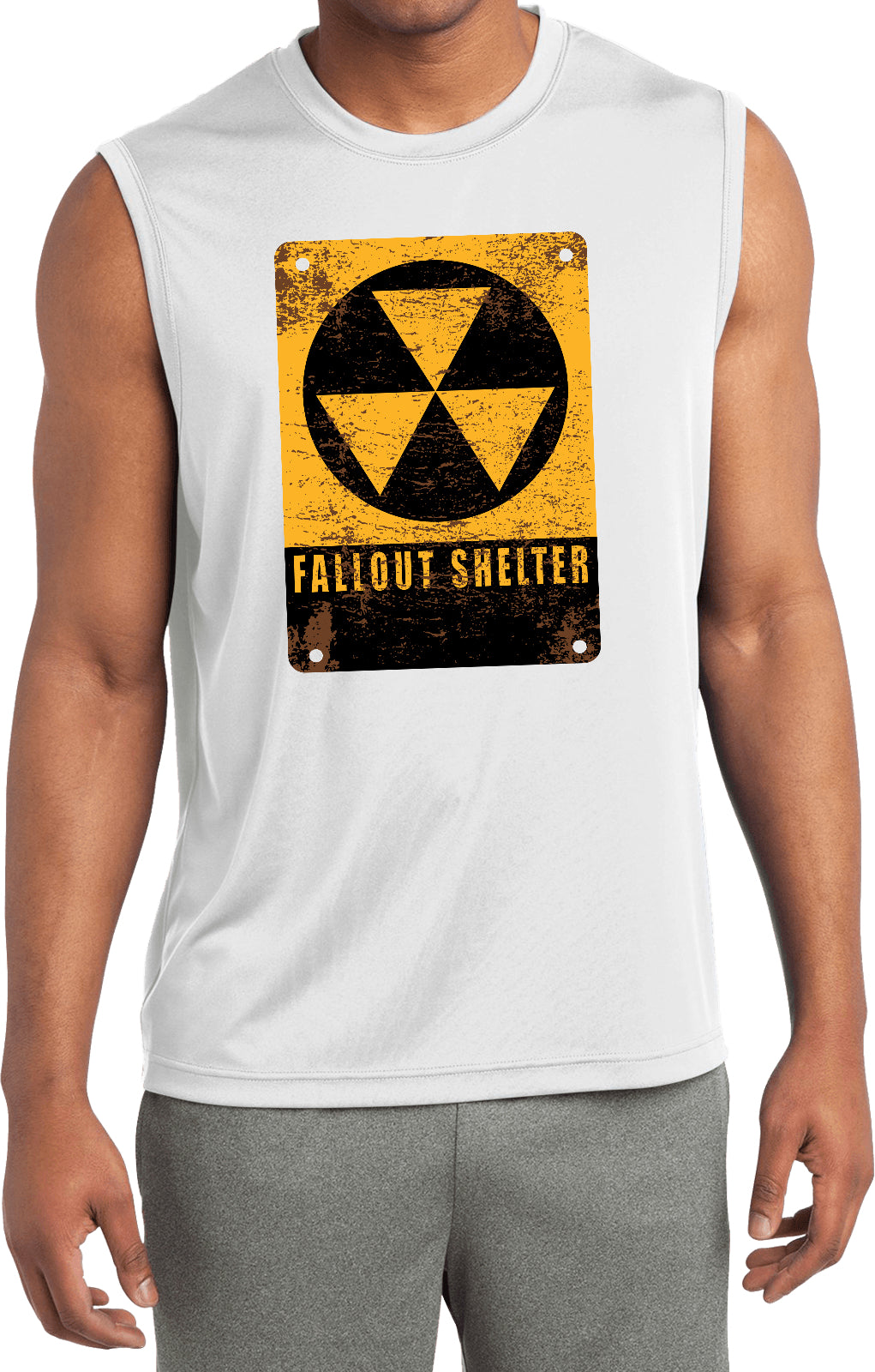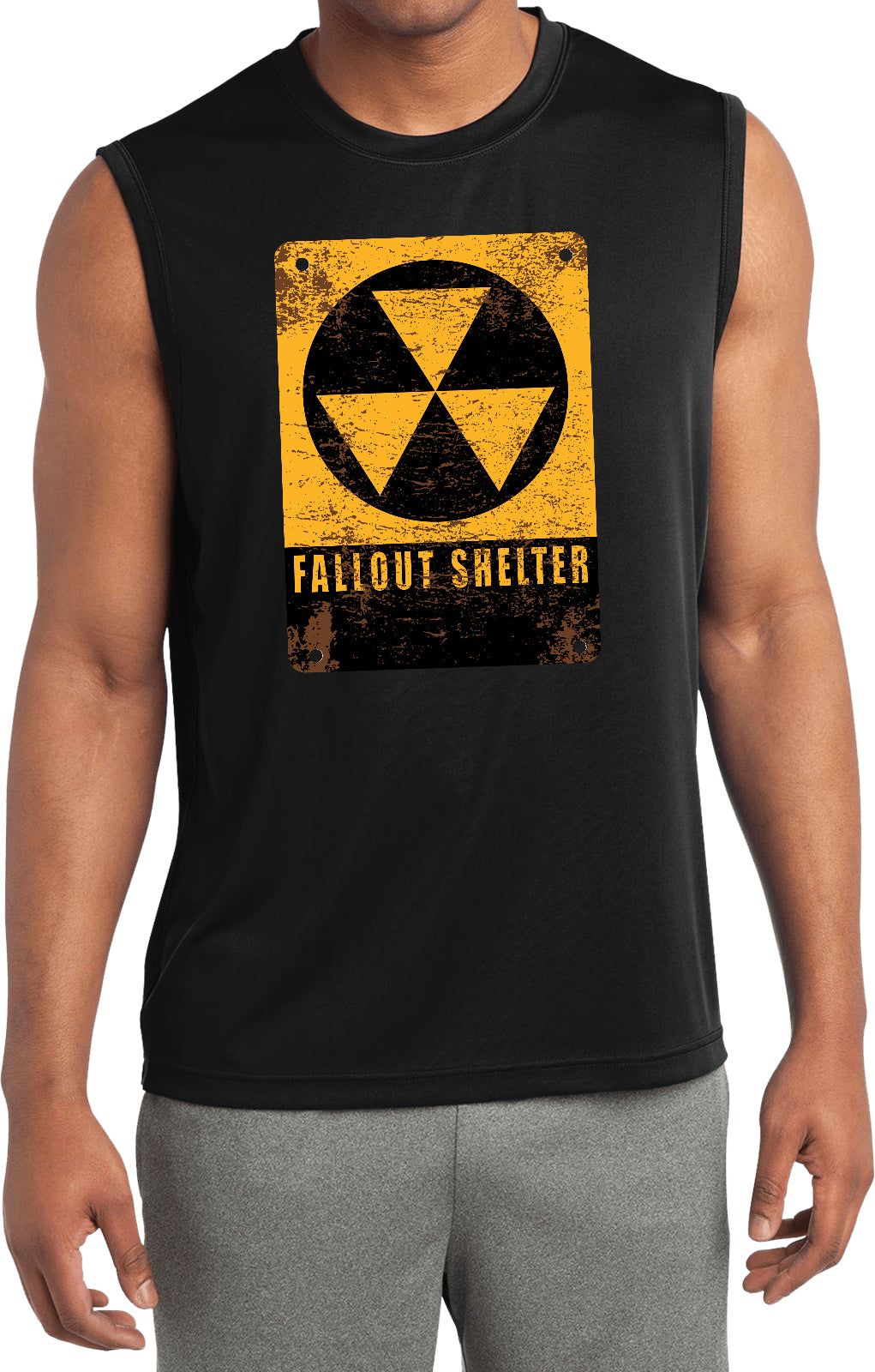 - A mens dry wicking muscle shirt featuring the radioactive fallout shelter symbol