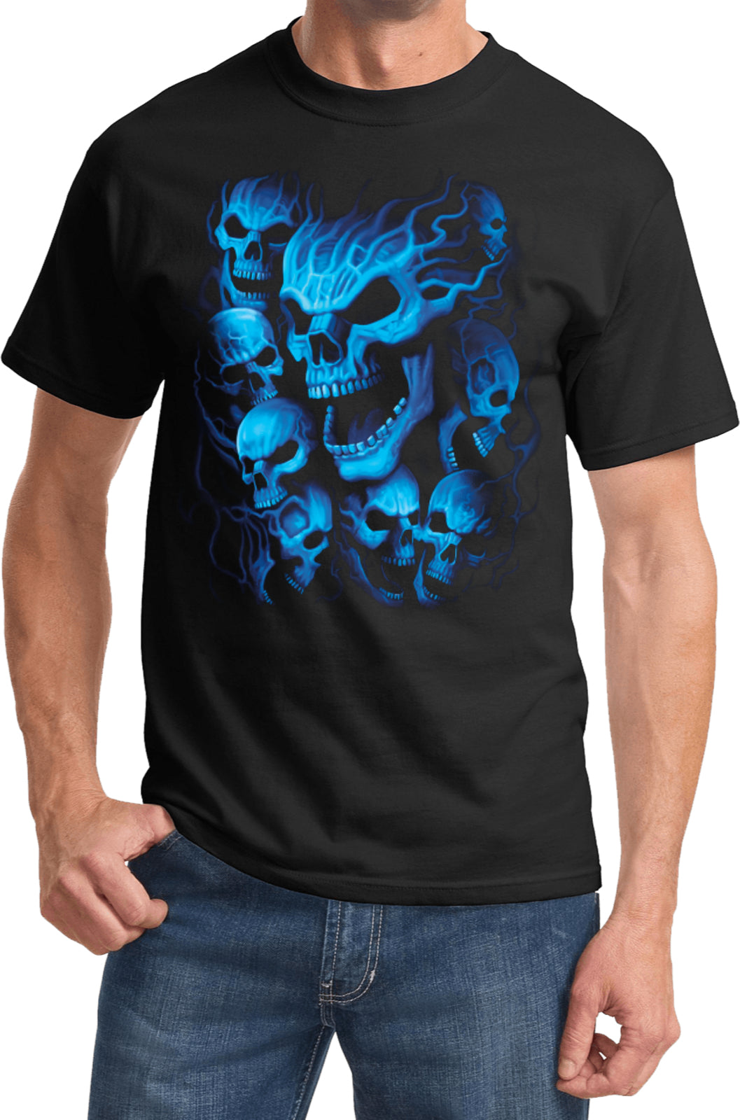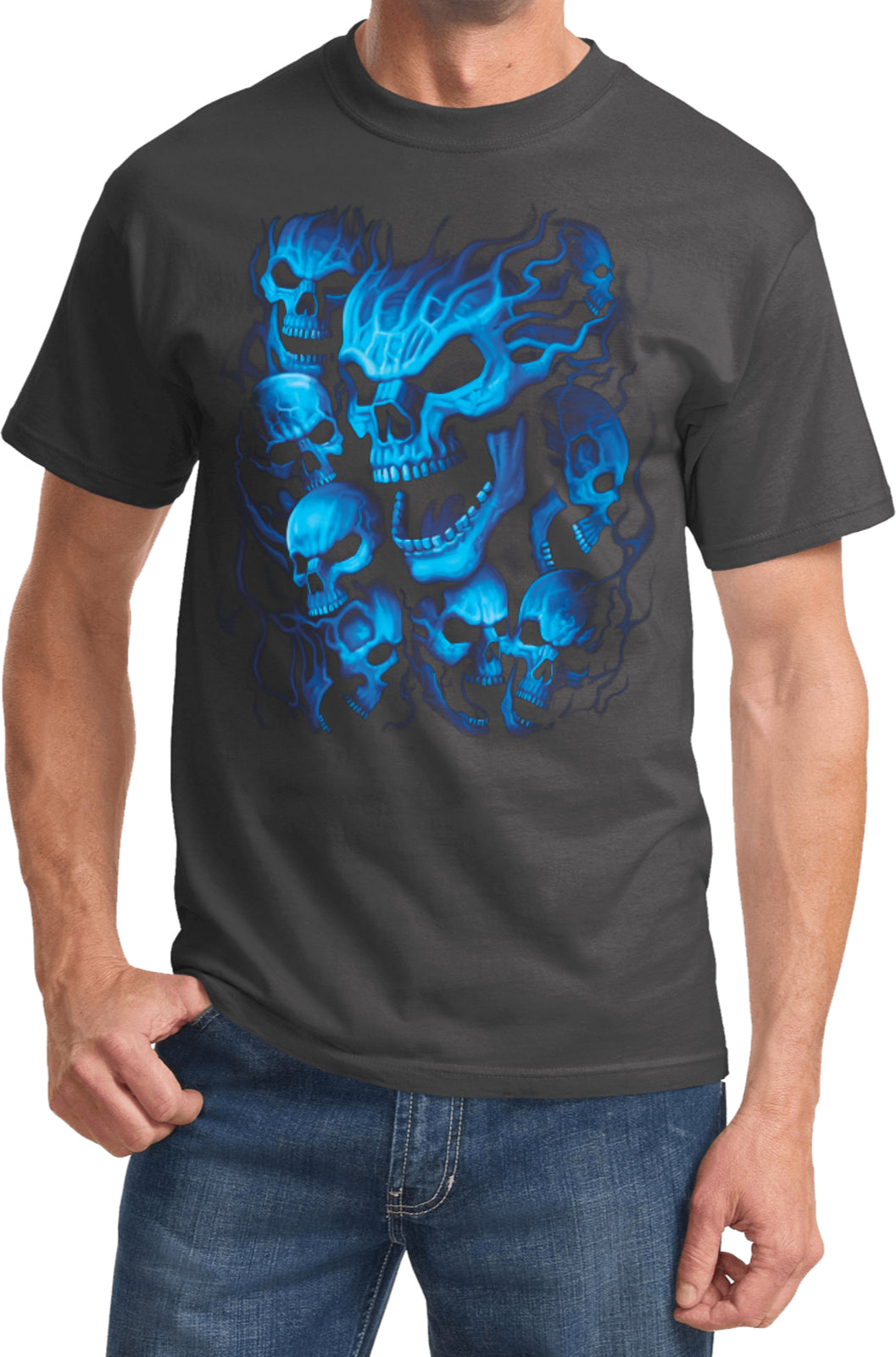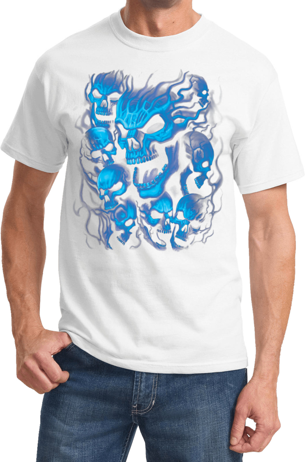 - A mens t-shirt featuring a cool flaming blue skulls design