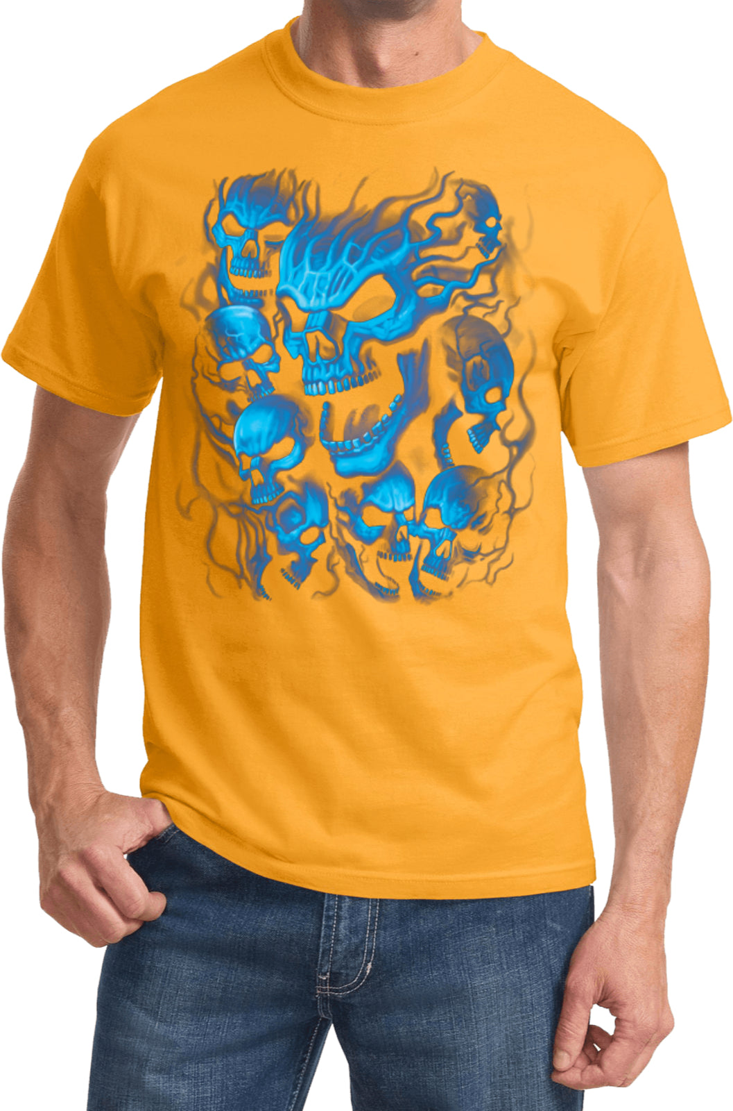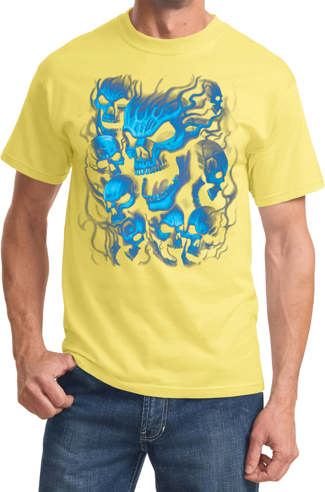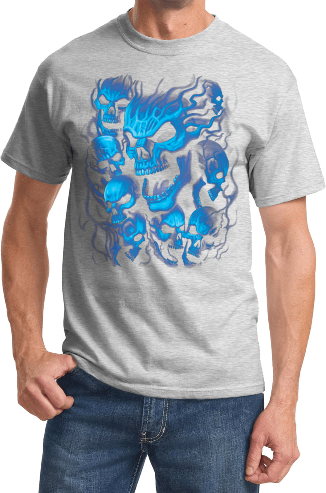 - A mens t-shirt featuring a cool flaming blue skulls design