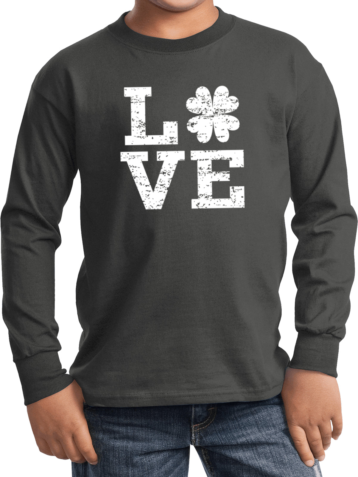 A youth long sleeve t-shirt that is made of 100% cotton with the exception of Athletic Heather which is made with a blend of cotton/polyester. The shirt has a traditional silhouette to fit both boys and girls. It features a vintage St. Paddy's Day design and reads Love with a heart replacing the "o" This kids shirt is perfect to wear during your St. Patrick's Day celebrations.