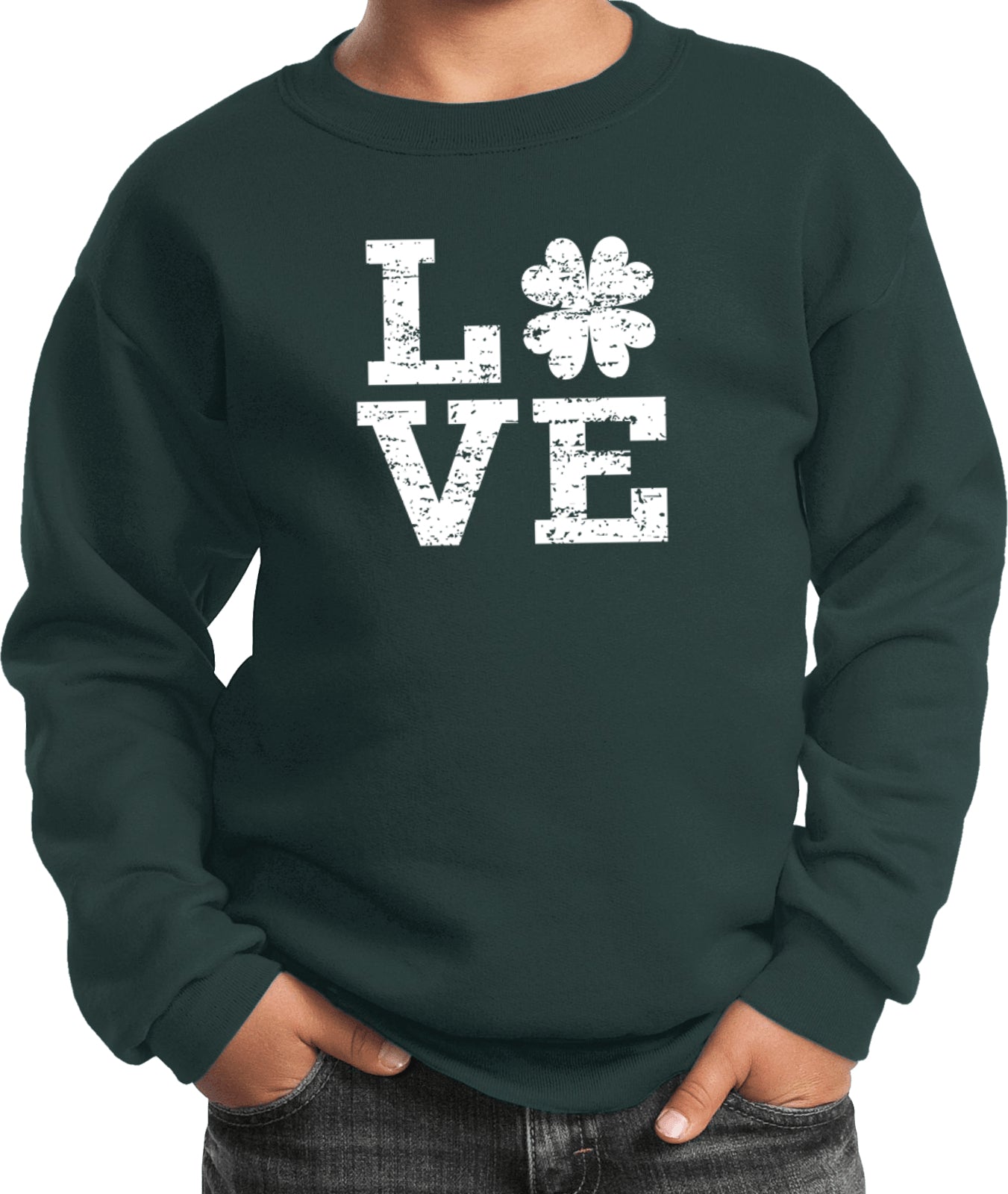 A youth pullover sweatshirt that is made with a blend of cotton/polyester. The sweatshirt has a traditional silhouette to fit both boys and girls. It features a vintage St. Paddy's Day design and reads Love with a heart replacing the "o" This kids sweatshirt is perfect to wear during your St. Patrick's Day celebrations.