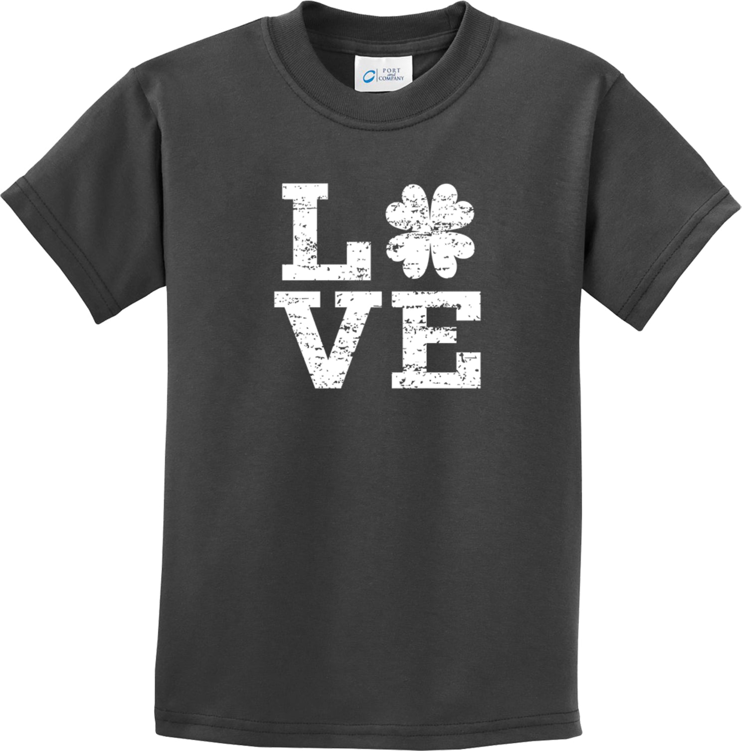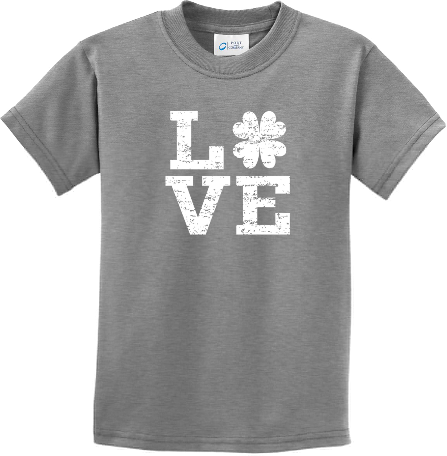 A youth t-shirt that is made of 100% cotton with the exception of Athletic Heather which is made with a blend of cotton/polyester. The shirt has a traditional silhouette to fit both boys and girls. It features a vintage St. Paddy's Day design and reads Love with a heart replacing the "o" This kids shirt is perfect to wear during your St. Patrick's Day celebrations.