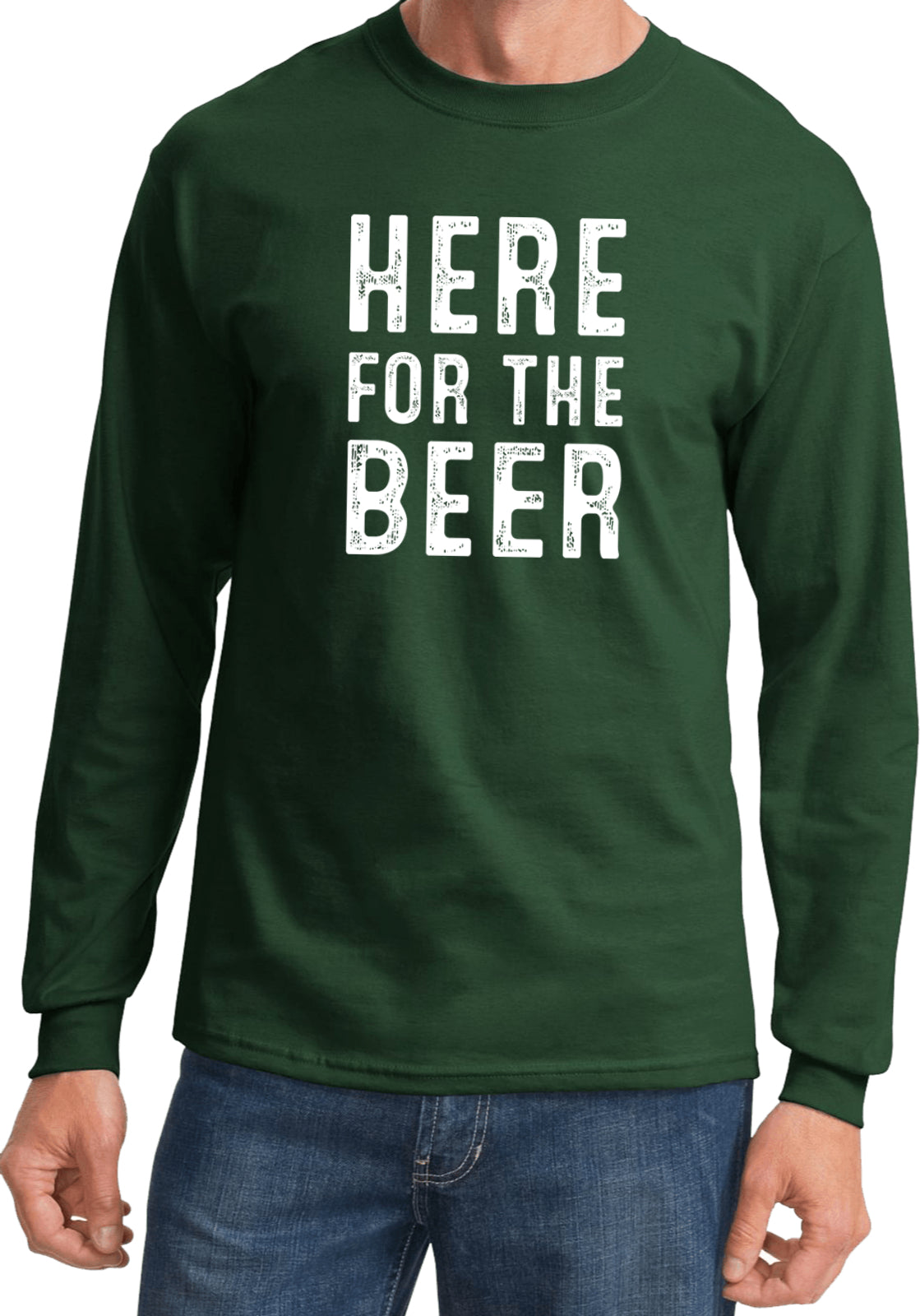 A unisex adult long sleeve shirt that fits both men and women with its traditional silhouette. It is made of 100% cotton with the exception of Athletic Heather which is made with a blend of cotton/polyester. The design features the funny saying Here for the Beer in a vintage text. This t-shirt is perfect to wear for your St. Patrick's Day celebrations.