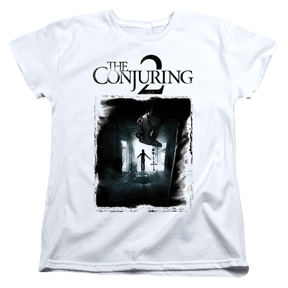 - The Conjuring 2 Womens T-shirt featuring a distressed photo of the movie poster artwork