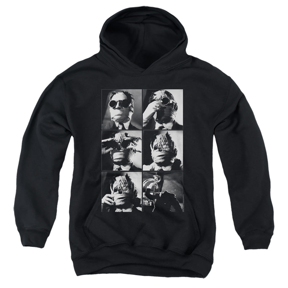 • The Invisible Man Kids Hoodie featuring pictures of him pulling apart his mask