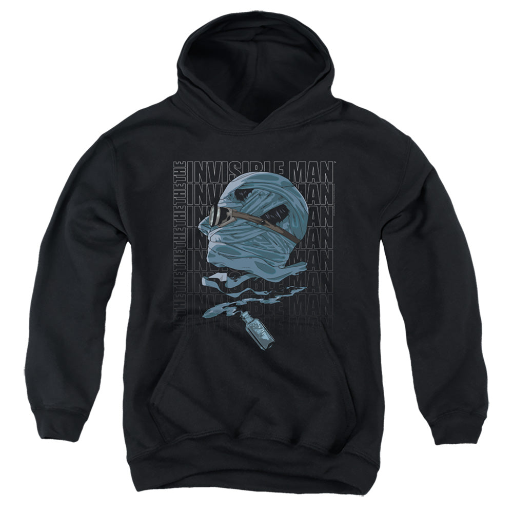 - The Invisible Man Kids Hoodie featuring a side profile with the movie title shown repeated in the background
