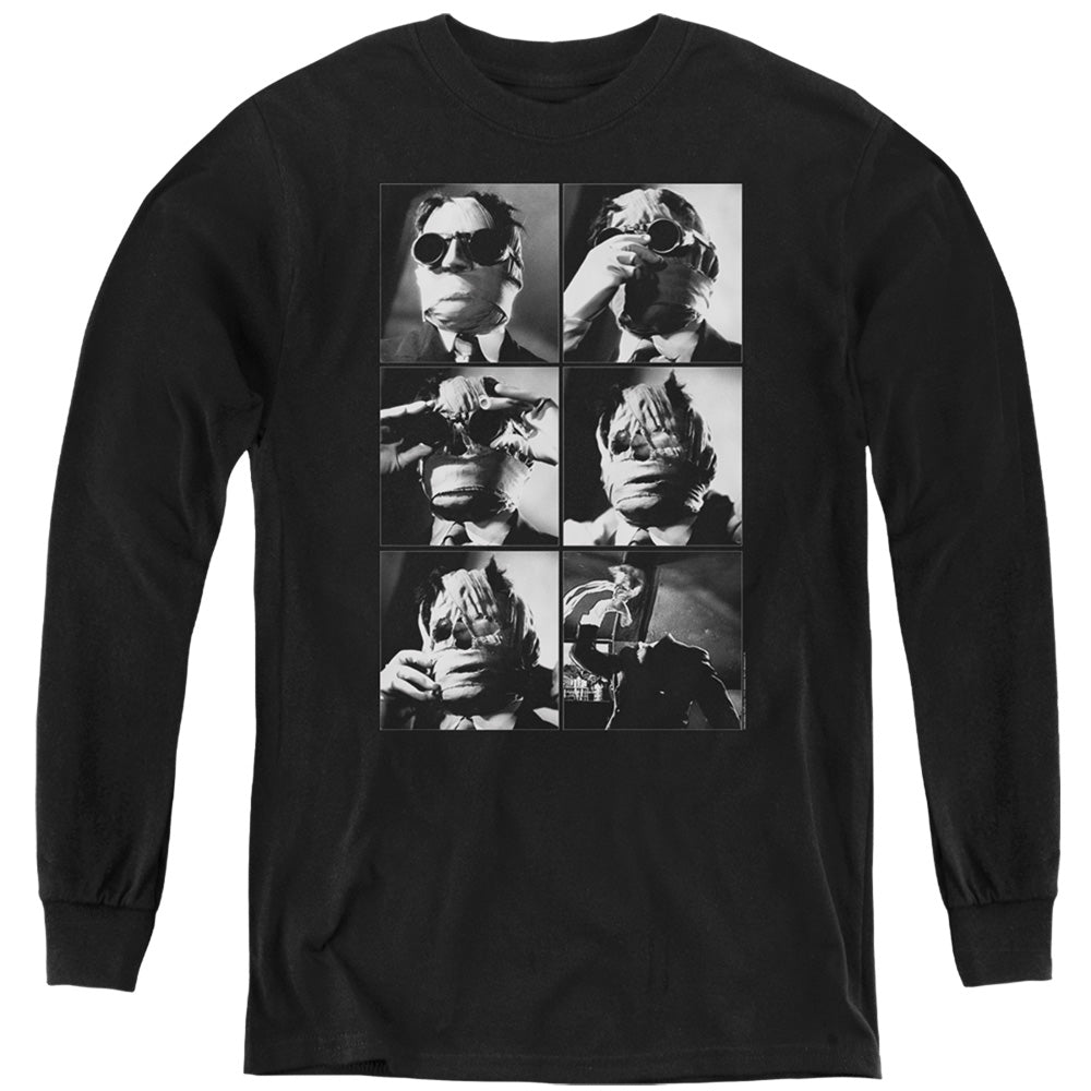 - The Invisible Man Kids Long Sleeve Shirt featuring pictures of him pulling apart his mask