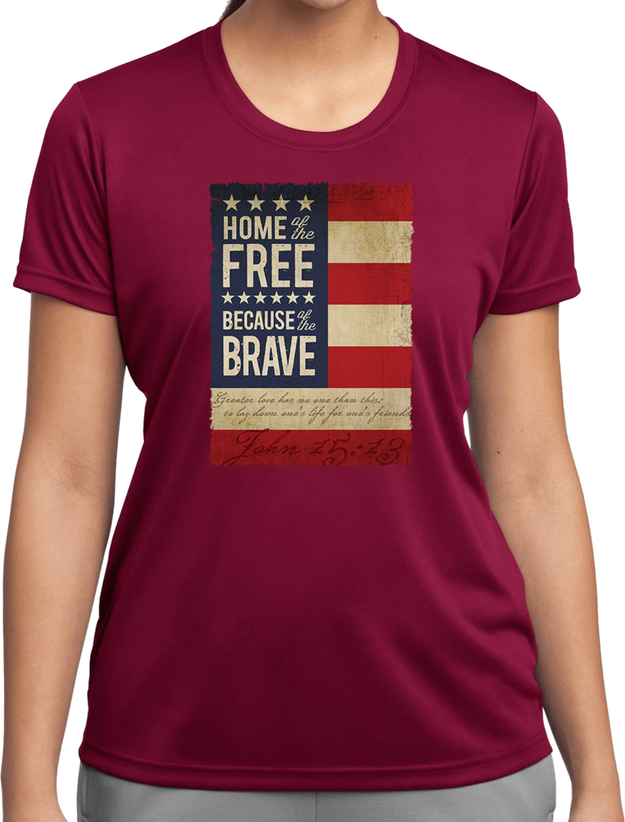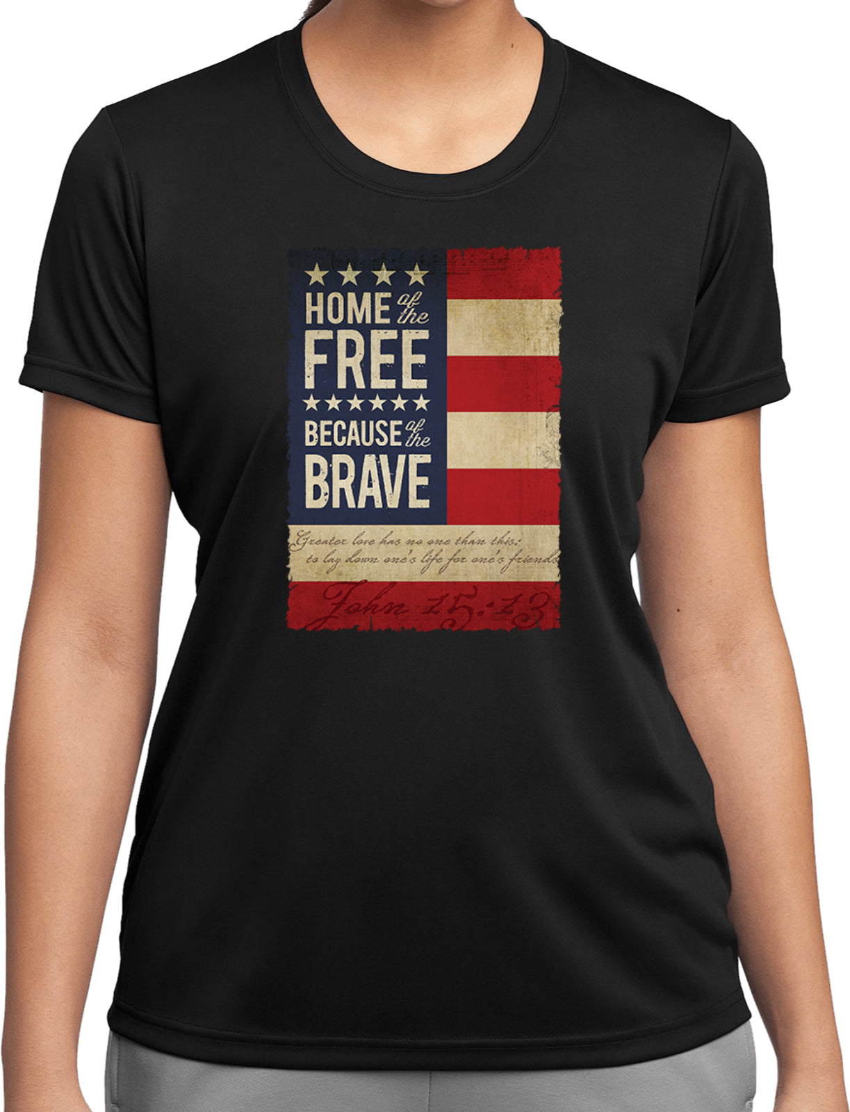 - A ladies dry wicking t-shirt featuring Home of the Free Because of the Brave