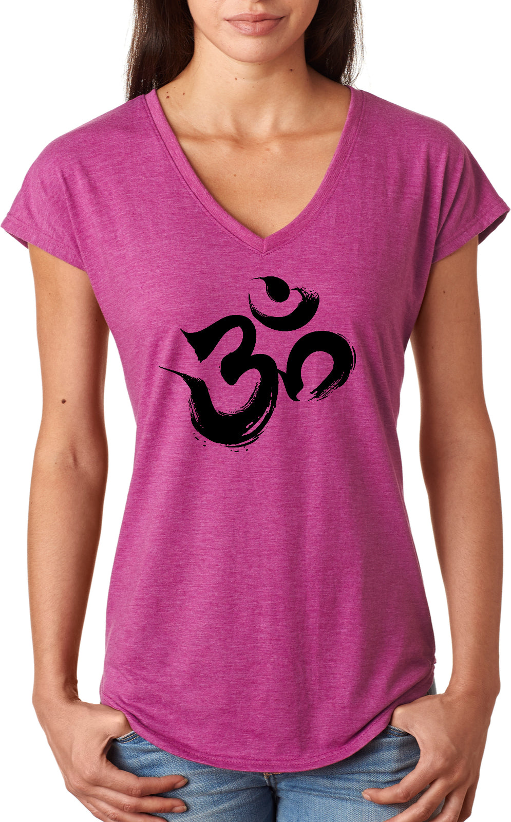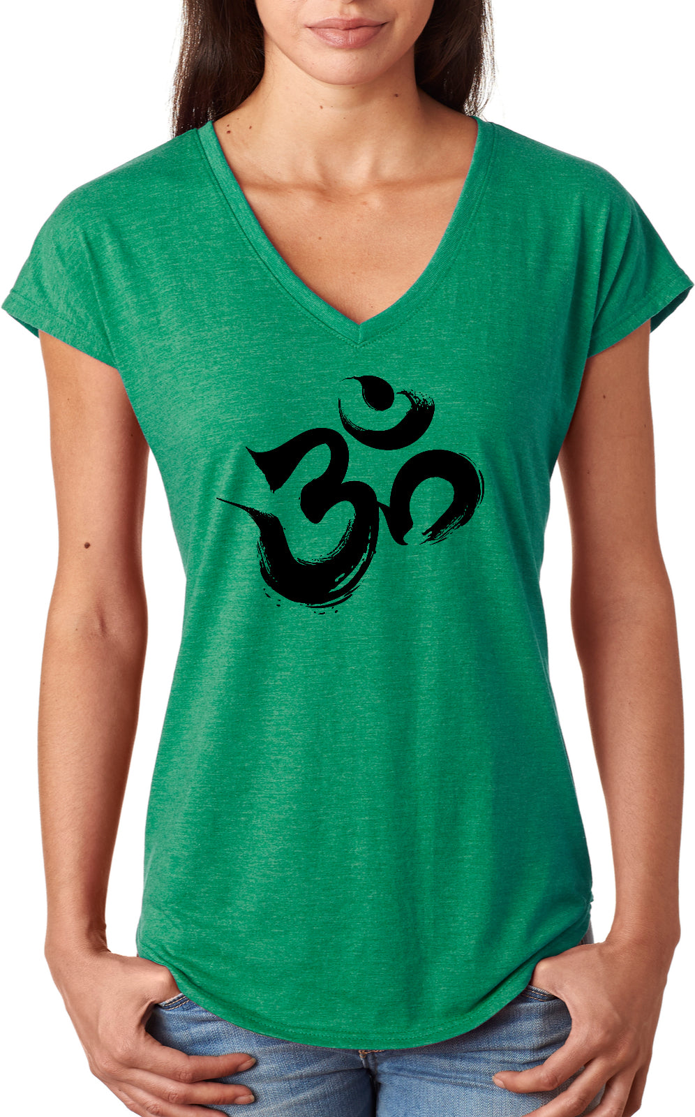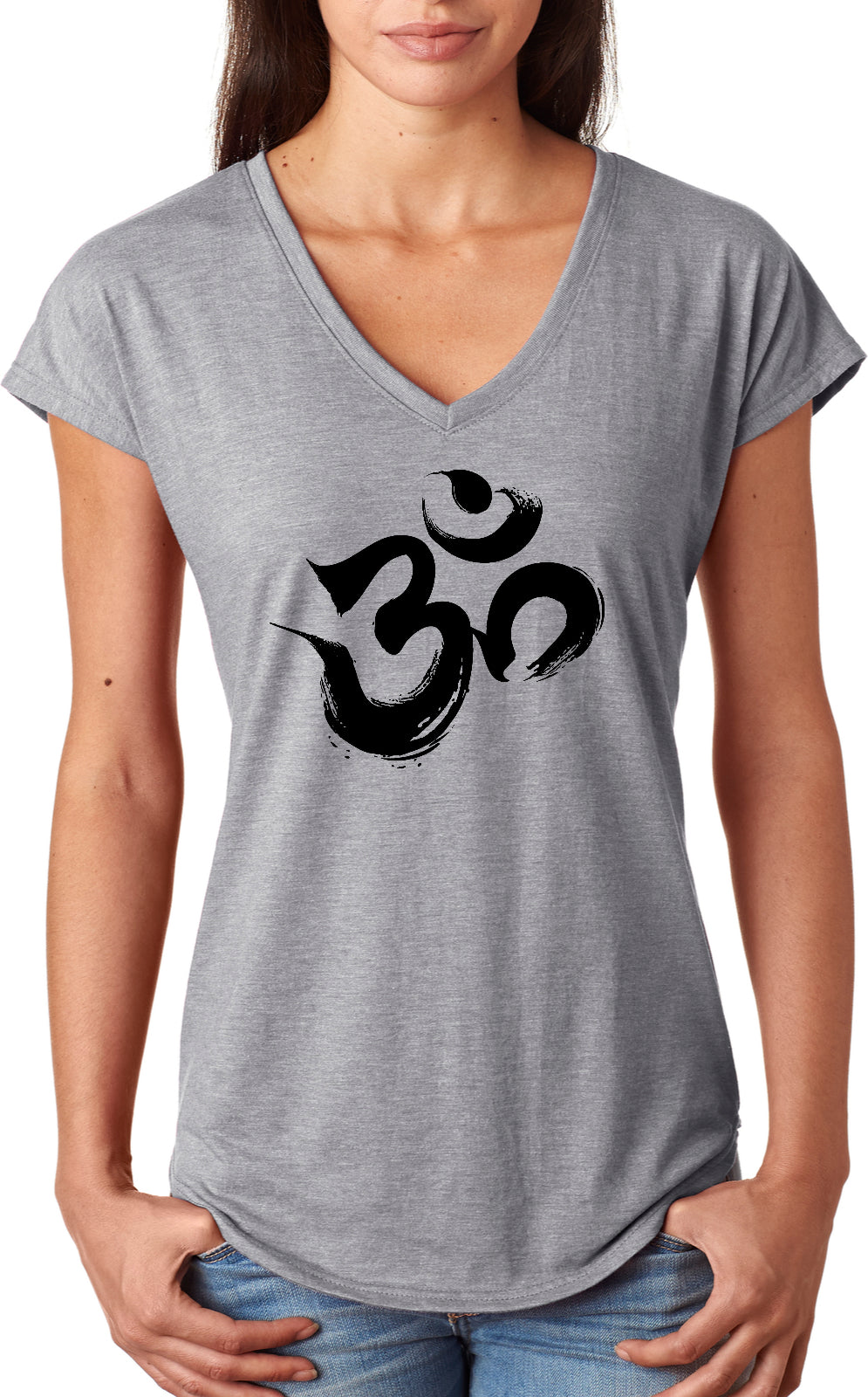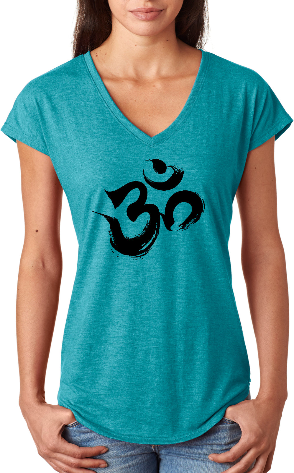 • A ladies tri blend v-neck t-shirt featuring the sacred aum symbol