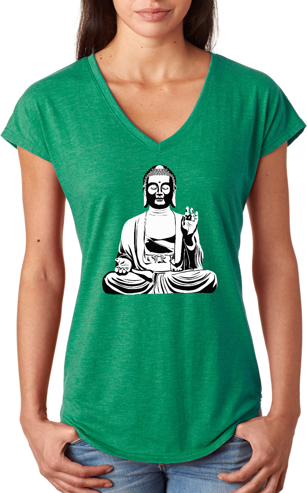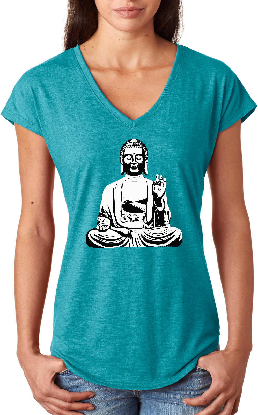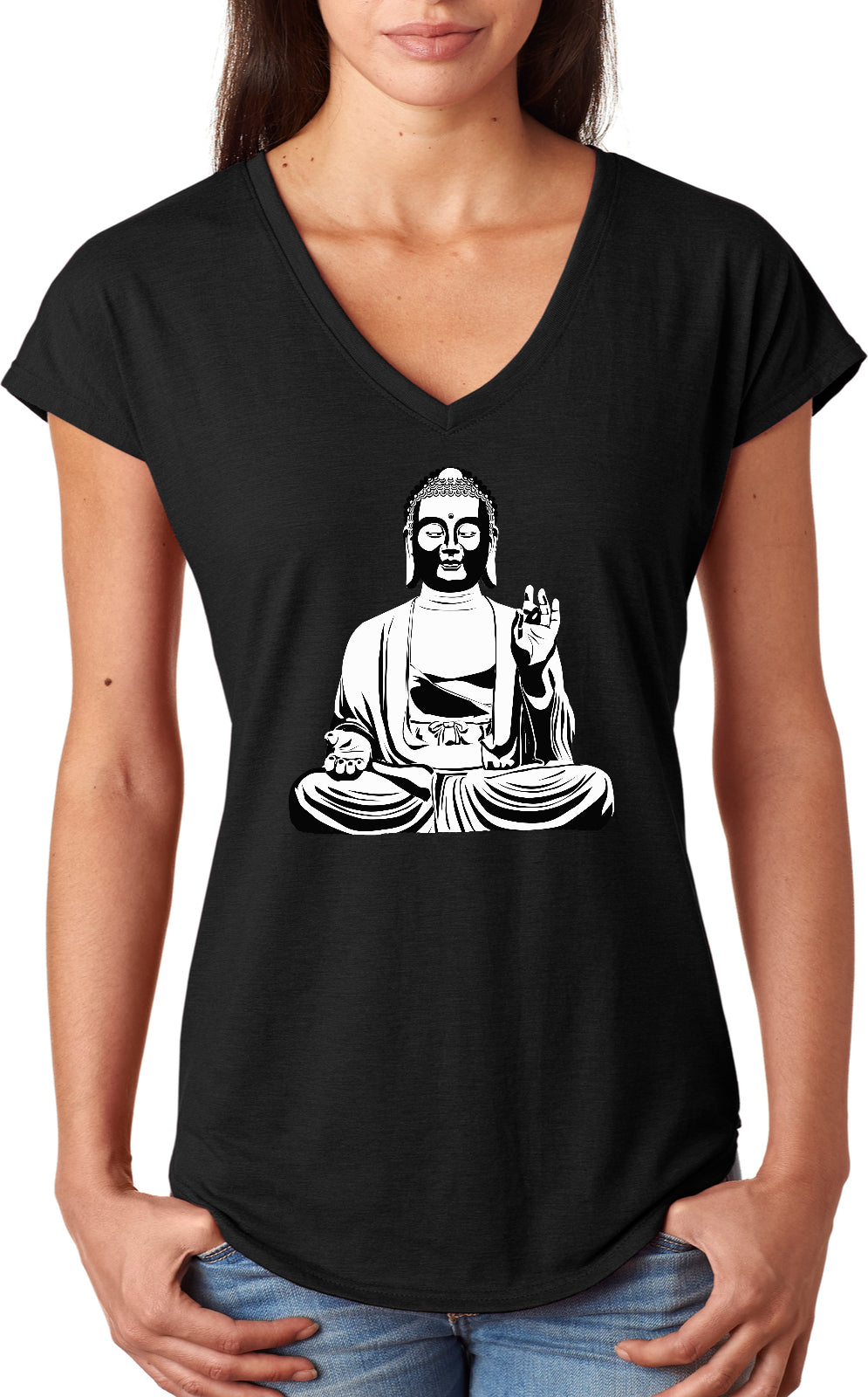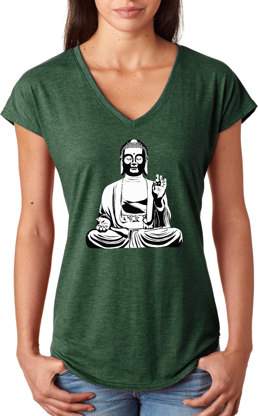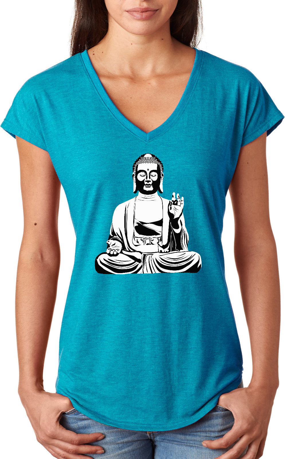 • A ladies tri blend v-neck t-shirt featuring Buddha meditating